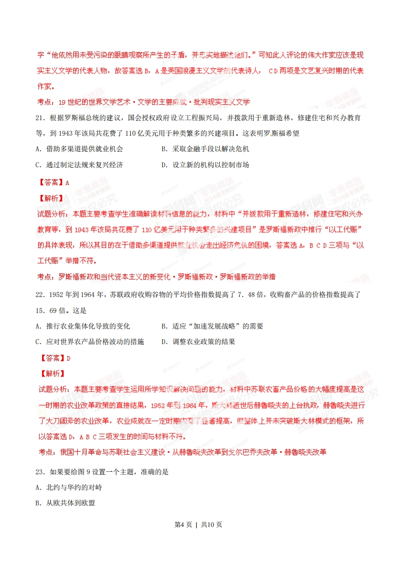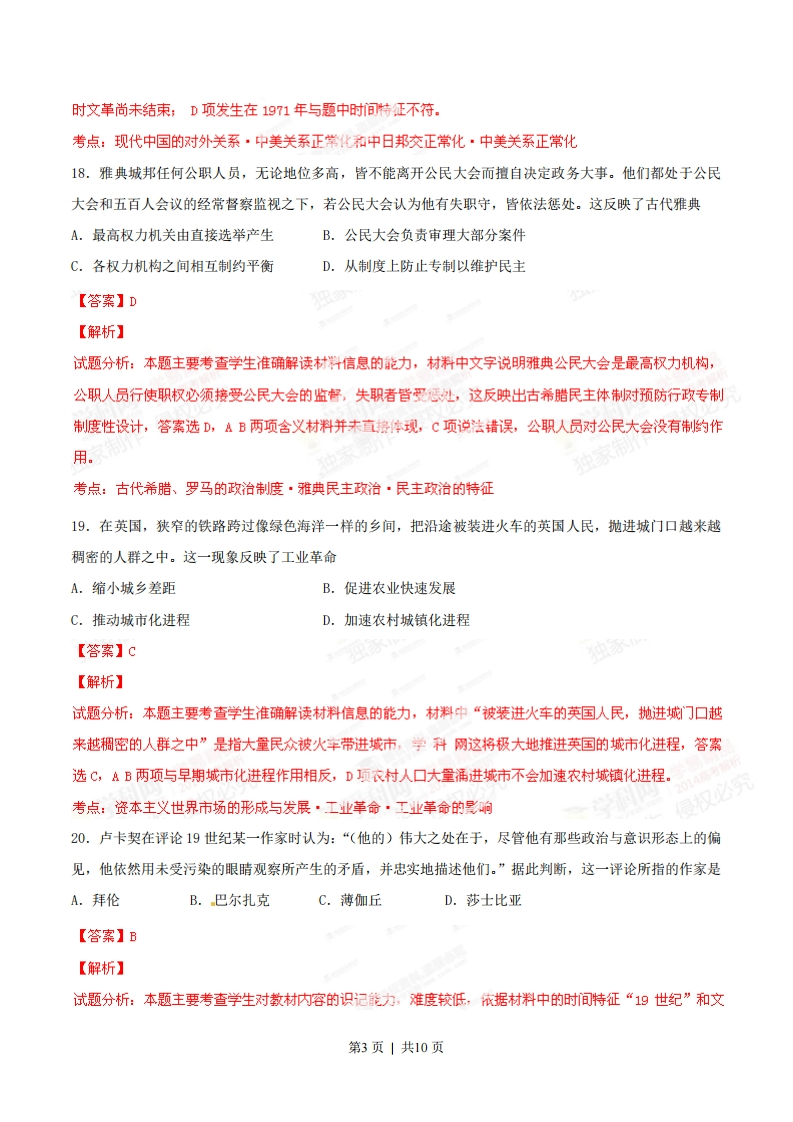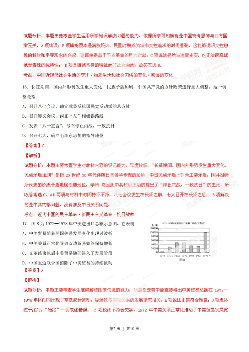 2014年普通高等学校招生全国统一考试(福建卷)历史试题13.明、清皇帝每年春都要举行一种祭祀仪式。读图7,从中透析正帝先农坛图出的核心信息是A.皇室祭祀的隆重排场B.专制君主的权威至上C.以农为本的立国理念D.统一国家的繁荣昌盛【答案】c【解析】试题分析:本题主要考查学生准确解读图片信息的能力,图片中文字“清雍正帝祭先农坛”表明清代最高统治者对农业生产的高度重视,借此表达以农为本的立国理念,因为小农经济是封建统治的根基,所以答案选C,ABD三项含义明显与题意重农思想无关。考点:古代中国的经济·农业的主要耕作方式·小农经济的影响14.乾隆以后,“关东每岁有商船二三千只至于上海”,“载豆、麦、杂粟,一岁三运以为常”。据此,判断有误的是A.商品经济繁荣B.长途贩运发达C.区域经济发展D.抑商政策改变【答案】D独家制【解析】试题分析:本题主要考查学生准确解读材信息的能力,从题型而言属否定式选择题宜用排除法,材料文字描述的是清代关东地区与上海之间的频擎圆易往来,这既花表明明清以来的长途贩运发达,也能反映出区域经济的特色和商品经济的繁荣发展,学科网以ABC三项均符合材料,D项说法错误不符合史实,直至清末(甲午战后)统治者才被迫放弃抑商改策,显然与材料中时间特征“乾隆以后”不符。侵权必究考点:古代中国的经济·商业的发展·明清时期商品经济的发展15.旗袍在20世纪二三十年代成为中国城市女性的时尚着装。其社会原因是A.西式服饰传入,生活方式完全西化B.中华民国建立,人们思想观念变化C.城市化进程中,女性开始引领时尚。D。旗袍典雅大方,体现女性的曲线美【答案】E【解析】第1页|共10页