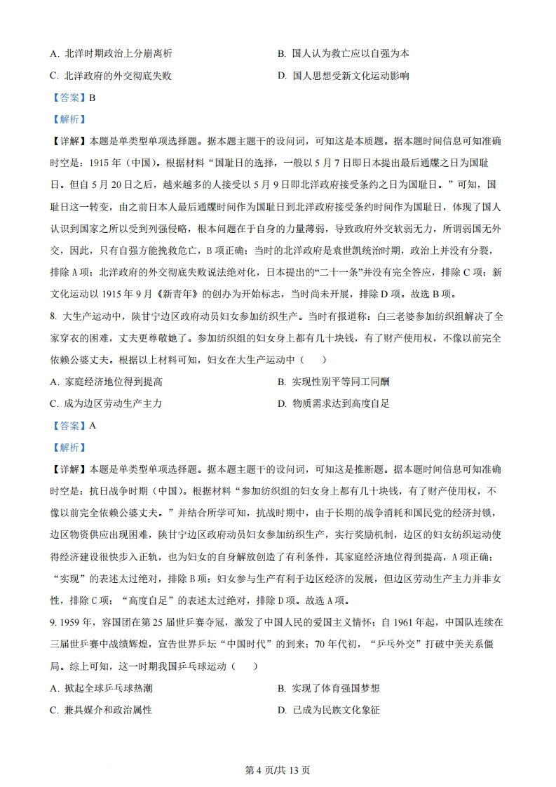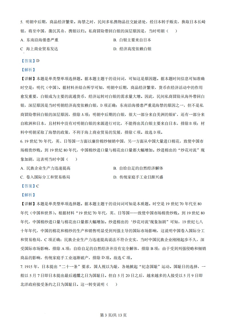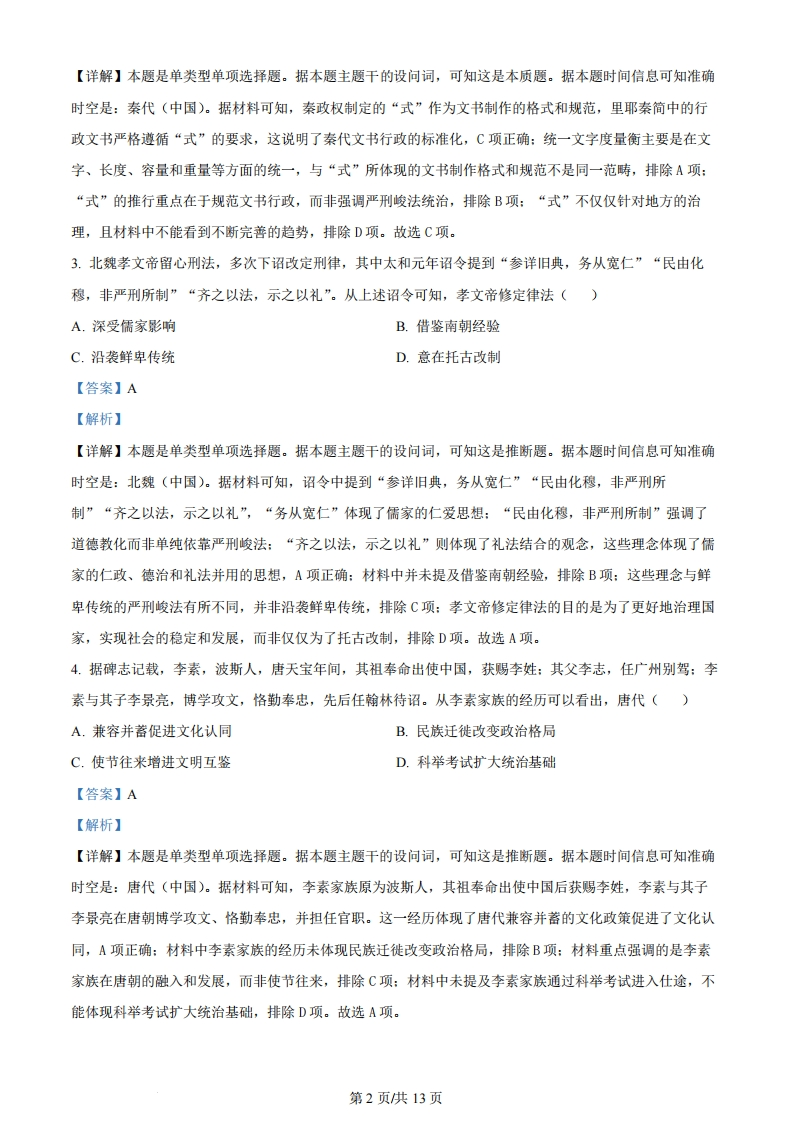 机密★启用前2024年甘肃省普通高校招生统一考试历史注意事项:1,答卷前,考生务必将自己的姓名、准考证号填写在答题卡上。2。回答选择题时,选出每小题答案后,用2B铅笔把答题卡上对应题目的答案标号框涂黑。如需改动,用橡皮擦干净后,再选涂其它答案标号框。回答非选择题时,将答案写在答题卡上。写在本试卷上无效。3。考试结束后,将本试卷和答题卡一并交回。一、选择题:本题共16小题,每小题3分,共48分。在每小题给出的四个选项中只有一项是符合题目要求的。1.新石器时代中期,大多数聚落出现结构复杂的“大房子”,与众多中小型居址形成明显对比。“大房子”是部落公共活动中心,或部落首领住宅兼公共事务场所。“大房子”的出现反映了这一时期()A.社会矛盾逐渐加剧B.部落组织日益复杂C.劳动分工更加明确D.国家形态初步具备【答案】B【解析】【详解】本题是单类型单项选择题。据本题主题干的设问词,可知这是本质题。据本题时间信总可知准确时空是:新石器时代中期(中国)。据材料并结合所学可知,在新石器时代中期,随着人类社会的发展,部落内部的活动和事务逐渐增多,需要一个专门的场所来进行公共活动、处理公共事务以及作为部落首领的居所。这表明部落的组织架构和功能分工在不断发展和细化,不再是简单的群居状态,反映了这一时期部落组织日益复杂,B项正确:新石器时代晚期,社会贫富分化与不平等开始出现,阶级分化日益明显,矛盾逐渐加剧,与材料时间不符,排除A项:材料没有直接提及劳动分工更加明确的内容,排除C项:此时国家形态尚未初步具备,国家的形成通常需要更高级的社会组织、政治制度等条件,仅“大房子”的出现不足以表明国家形态的初步具备,排除D项。故选B项。2.秦政权制定多种律令来保障文书的制作、传递与保存、其中文书制作的格式和规范称为“式”。例如,里耶秦简中的行政文书,就严格遵循了“式”的要求。“式”的推行说明秦代()A.统一了文字度量衡B.依靠严刑峻法统治C.文书行政的标准化D.地方治理日趋完善【答案】C【解析】第1页供13页