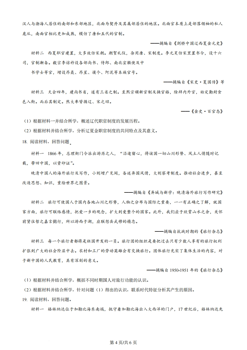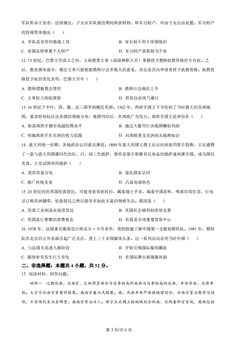 机密★启用前2024年甘肃省普通高校招生统一考试历史注意事项:1,答卷前,考生务必将自己的姓名、准考证号填写在答题卡上。2。回答选择题时,选出每小题答案后,用2B铅笔把答题卡上对应题目的答案标号框涂黑。如需改动,用橡皮擦干净后,再选涂其它答案标号框。回答非选择题时,将答案写在答题卡上。写在本试卷上无效。3。考试结束后,将本试卷和答题卡一并交回。一、选择题:本题共16小题,每小题3分,共48分。在每小题给出的四个选项中只有一项是符合题目要求的。1.新石器时代中期,大多数聚落出现结构复杂的“大房子”,与众多中小型居址形成明显对比。“大房子”是部落公共活动中心,或部落首领住宅兼公共事务场所。“大房子”的出现反映了这一时期()A.社会矛盾逐渐加刷B.部落组织日益复杂C.劳动分工更加明确D.国家形态初步具备2.秦政权制定多种律令来保障文书的制作、传递与保存、其中文书制作的格式和规范称为“式”。例如,里耶秦简中的行政文书,就严格遵循了“式”的要求。“式”的推行说明秦代()A.统一了文字度量衡B.依靠严刑峻法统治C.文书行政的标准化D.地方治理日趋完善3.北魏孝文帝留心刑法,多次下诏改定刑律,其中太和元年诏令提到“参详旧典,务从宽仁”“民由化穆,非严刑所制”“齐之以法,示之以礼”。从上述诏令可知,孝文帝修定律法()A.深受儒家影响B.借鉴南朝经验C.沿袭鲜卑传统D.意在托古改制4.据碑志记载,李素,波斯人,唐天宝年间,其祖奉命出使中国,获赐李姓:其父李志,任广州别驾:李素与其子李景亮,博学攻文,恪勤奉忠,先后任翰林待诏。从李素家族的经历可以看出,唐代()A.兼容并蓄促进文化认同B.民族迁徙改变政治格局C.使节往来增进文明互鉴D.科举考试扩大统治基础5.明朝中后期,商品经济繁荣。海禁之时,民间多私携物品往交趾诸处,经日本转手贩卖,换取日本长崎银,将至中国,凿沉其舟,携银以归。私商冒险带回白银的深层原因是,当时明朝()A.东南沿海倭患严重B.白银主要来自日本C.海上商业贸易发达D.经济高度依赖白银第1页/共6页