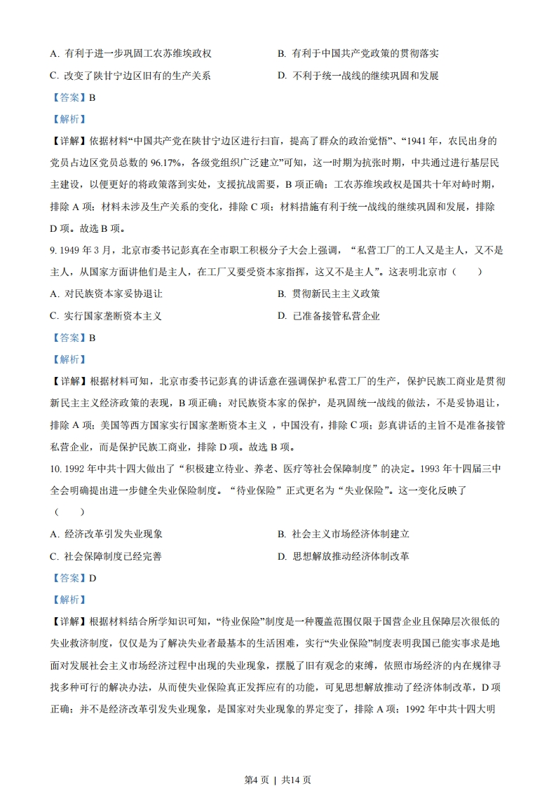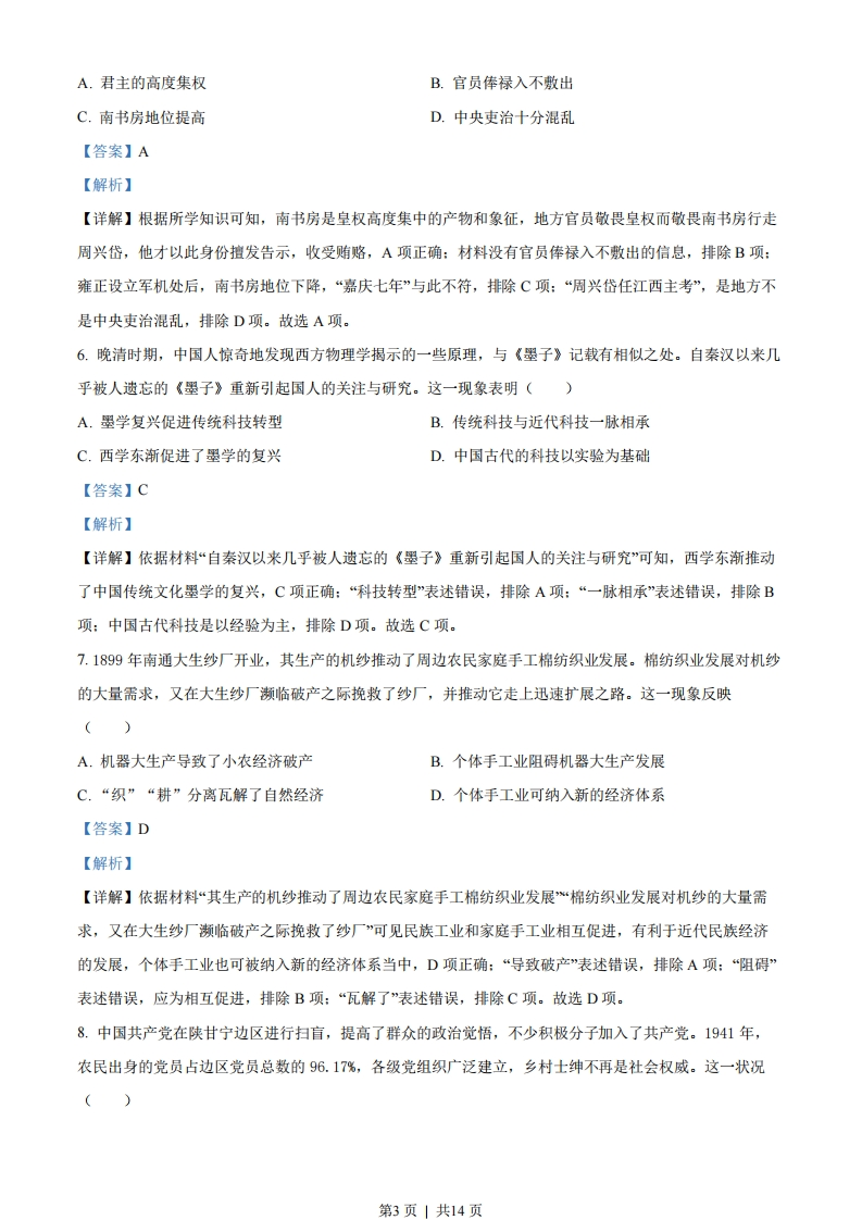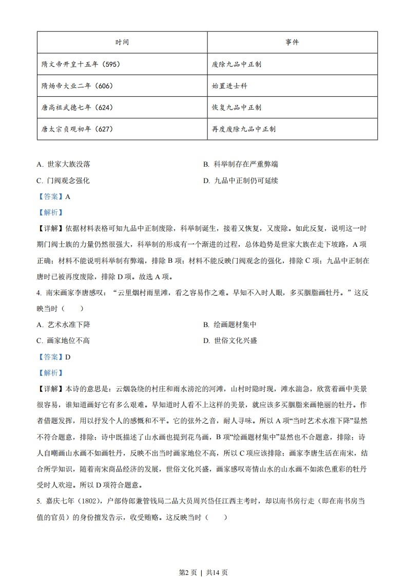 湖南省2022年历史高考真题注意事项:1.答卷前,考生务必将自己的姓名、准考证号填写在本试卷和答题卡上。2。回答选择题时,选出每小题答案后,用铅笔把答题卡上对应题目的答案标号涂黑。如需改动,用橡皮擦干净后,再选涂其他答案标号。回答非选择题时,将答案写在答题卡上。写在本试卷上无效。3.考试结束后,将本试卷和答题卡一并交回。一、选择题:本题共16小题,年小题3分,共48分,在每小题给出的四个选项中,只有一项是符合题目要求的。1.儒家起于鲁,传布于齐、晋、卫:墨家始于宋,传布于鲁、楚、秦:道家起源于南方,后在楚、齐、燕有不同分支:法家源于三晋,盛行于秦。这()A.促进了政治统一B.维系了“学在官府”的局面C.冲击了贵族政治D.导致了各诸侯国之间的矛盾【答案】C【解析】【详解】材料反映了思想的传播,思想的传播伴随着人才的流动,依据所学可知,诸侯国君出于争霸需要,重用外地人才,不少诸侯国吸收了大量外地人才,从而冲击了本地贵族对政治的垄断,促进了“贵族政治”向“官僚政治”的转变,C项正确:百家的思想各异,并不能促进国家政治统一,排除A:春秋时期,孔子创办私学打破了“学在官府”的局面,排除B项:D项颠倒因果,诸侯国的矛盾导致各家的盛行。故选C项。2.汉武帝南征北伐,东巡西幸,奢靡无度,致府库告竭,遂用聚敛之臣,“至于卖爵、更币、算车船、租六畜、告缗、均输、盐铁、榷酤,凡可以佐用者一孔不遗,独于田租不敢增益”。武帝此举()A.体现以农为本B.服务于汉初战事C.意在藏富于民D.解决了财政危机【答案】A【解析】【详解】根据“独于田租不敢增益”结合所学知识,可见汉代统治者视农业为国本,不敢增加田租是为了避免动摇国本,A项正确:汉武帝敛财不仅为了战事,还有满足巡幸和奢侈挥霍的原因,排除B项:汉武帝推行的各种政令,其本质的目的不是“藏富于民”,而是要充盈国库,排除C项:材料没有体现汉武帝的措施“解决了”财政危机,排除D项。故选A项。3.据下表可知()第1页」共14页