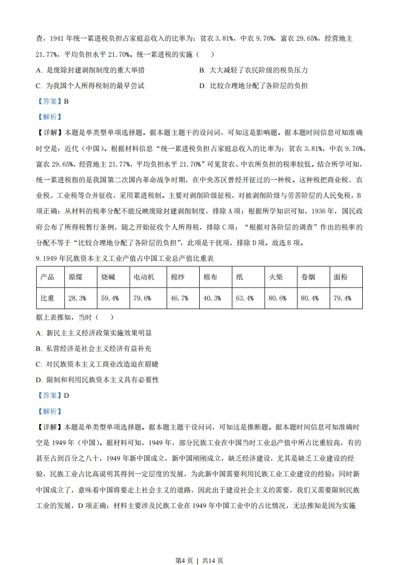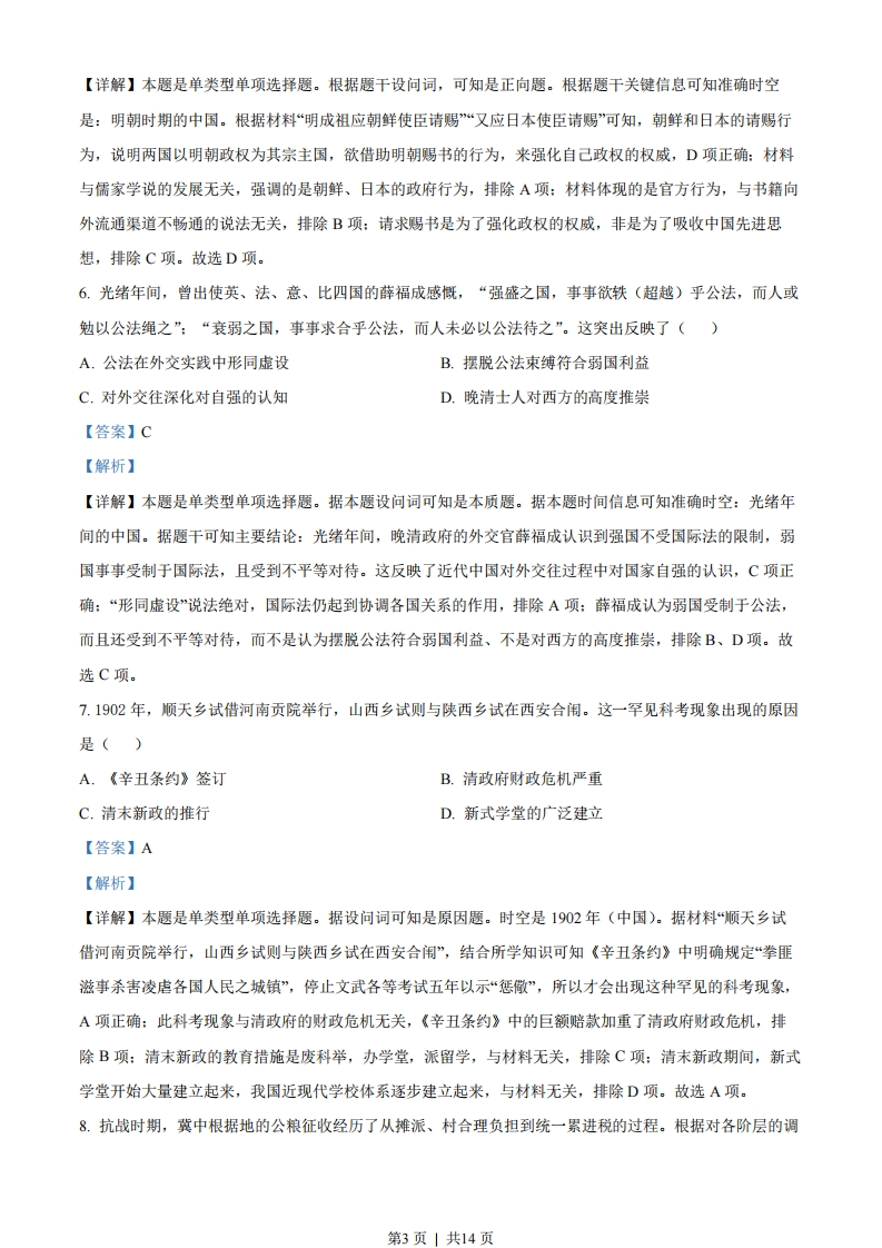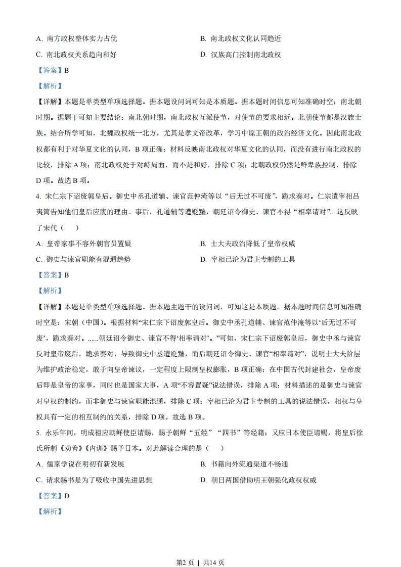 2023年湖南省普通高中学业水平选择性考试历史试题本试卷满分100分,考试时间75分钟。一、选择题:本题共16小题,每小题3分,共48分。在每小题给出的四个选项中,只有一项是符合题目要求的。1.湖南遭县城头山古城遗址距今约6000年,是中国迄今已知最早的新石器时代城址。城址内外发掘出大片房屋建筑遗迹,多座陶窑,以及中国迄今己知最早的祭坛和古稻田。这说明()A.城市是最早出现的人类文明要素B.长江流域是中华文明的重要源头C.古城先民己摆脱对渔猎采集的依赖D.遗址所处时代己迈入阶级社会门槛【答案】B【解析】【详解】本题是单类型单项选择题。据本题设问词可知是本质题。据本题时间信息可知准确时空:约6000年新石器时代。据题干可知主要结论:湖南遭县城头山古城遗址距今约6000年,考古发掘反映出现原始农业、手工业、定居生活和祭祀活动,推动了中华文明的产生,因此长江流域的古城遗址说明长江流域是中华文明重要源头,B项正确:早期城市的出现促进了人类文明的产生,而城市不是人类文明的要素,排除A项:“己摆脱”说法绝对,排除C项:该遗址出现阶级分化,表明即将进入阶级社会,排除D项。故选B项。2.战国时期,关东六国国君任相多用其宗族及国人。数代秦王所用秦相,商鞅为卫人,楼缓为赵人,张仪、魏冉、范雎为魏人,蔡泽为燕人,吕不韦为韩人,李斯为楚人。据此可推知()A.秦国官僚制相对完善B.秦国用人政策不断改变C.六国严格遵行宗法制D.法家人物在六国遭排挤【答案】A【解析】【详解】本题是单类型单项选择题。根据题干设问词,可知是推断题。根据题干关键信息可知时空是:战国时期的中国。根据材料可知,与关东六国多用其宗族及国人不同,秦国的相主要来源于各诸侯国,说明当时秦国的官僚体制相对完善,并非采取世袭制,A项正确:材料未涉及秦国的用人政策改变,除B项:战国时期宗法制遭到冲击,排除C项:材料未涉及六国的相的出身及派别,因此排挤一词无法得出,排除D项。故选A项。3.南北朝后期,南北政权遣使频繁,双方挑选使节,必求“容止可观,文学优赡者”。北朝使节皆为汉族高门人物,而非鲜卑子弟。这说明()第1页」共14页