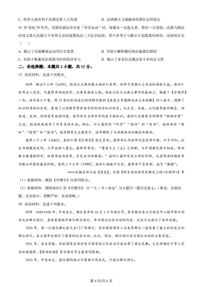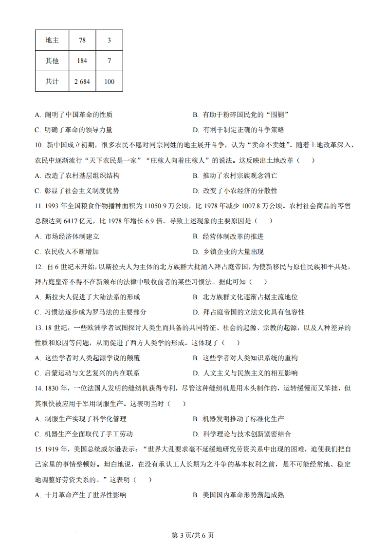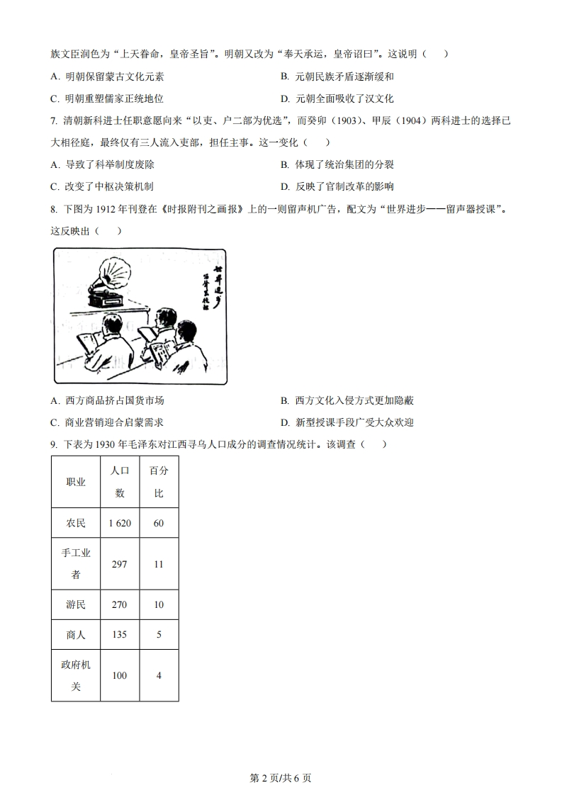 2024年湖南省普通高中学业水平选择性考试历史一、选择题:本题共16小题,每小题3分,共48分。在每小题给出的四个选项中,只有一项是符合题目要求的。1.西周时期,国人可以对军国大事发表意见,甚至能够影响国君废立,但不能改变宗主世袭制,更换国君不过是更换宗主。这说明西周()A.军国大事取决于国人B.血缘政治色彩浓厚C.王权与神权紧密结合D.宗法制度遭到破坏2.据史料记载,秦人“畏有司而顺”,楚人“好游侠”“易发怒”。秦末,六国旧地都出现了反秦斗争,其中楚地声势最大,反应最为激烈。这可用于()A.证实秦对楚地的统治最为严苛B.说明秦楚之间文化冲突无法弥合C.证明秦朝的制度不适用于楚地D.解释汉初推行郡国并行制的原因3.下表为史籍所载东汉至南朝时期官府掌握的湖南地区户口数和人口数。其变化的主要原因是()时间户口数(万)人口数(万)东汉永和五年(140)64.98281.32西晋太康初年(280-289)14.2385.39南朝宋昇明三年(479)4.193348A.大规模的瘟疫流行B.战乱异常频繁C.豪强大族势力膨胀D.官府组织移民4.敦煌文书多见唐中叶以后的雇工契,如唐宣宗大中八年(854)某人雇长工,契约中写明工期和酬劳,规定受雇者必须认真劳作,不得旷工,“若先悔者,罚青麦十驮”。由此可推知当时()A.雇工经营成为主要经营方式B.国家对农民人身控制减弱C.小农经济仍然占据主导地位D.商品经济得到了快速发展5.唐末以后出现的新藩镇,其军队主要靠强迫征发而来,难以结成牢固的军人集团。到后周时,中央禁军成为最强大的力量。这些变化()A.有利于中央集权体制的重建B.从源头消除了藩镇割据现象C.促进了政府行政效率的提高D.使重文轻武观念逐渐被接受6.元朝圣旨多采用蒙古语法糅合汉语词汇的形式,开篇日“长生天气力里,大福荫互助里,皇帝圣旨”。汉第1页/共6页