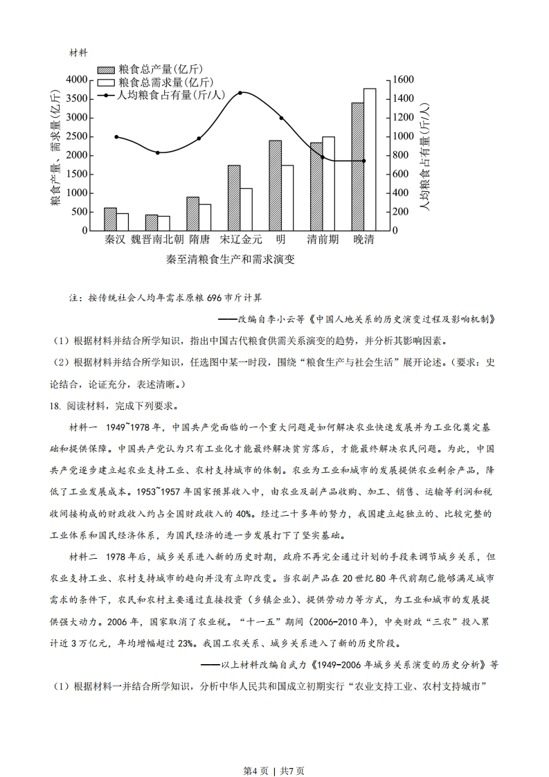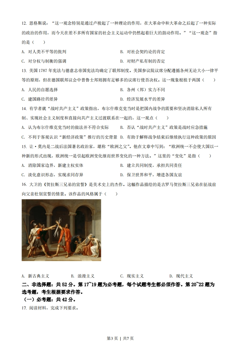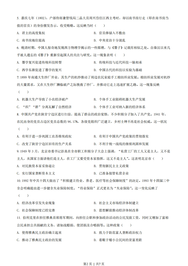 湖南省2022年历史高考真题注意事项:1.答卷前,考生务必将自己的姓名、准考证号填写在本试卷和答题卡上。2.回答选择题时,选出每小题答案后,用铅笔把答题卡上对应题目的答案标号涂黑。如需改动,用橡皮擦干净后,再选涂其他答案标号。回答非选择题时,将答案写在答题卡上。写在本试卷上无效。3.考试结束后,将本试卷和答题卡一并交回。一、选择题:本题共16小题,年小题3分,共48分,在每小题给出的四个选项中,只有一项是符合题目要求的。1.儒家起于鲁,传布于齐、晋、卫:墨家始于宋,传布于鲁、楚、秦:道家起源于南方,后在楚、齐、燕有不同分支:法家源于三晋,盛行于秦。这()A.促进了政治统一B.维系了“学在官府”的局面C.冲击了贵族政治D.导致了各诸侯国之间的矛盾2.汉武帝南征北伐,东巡西幸,奢靡无度,致府库告竭,遂用聚敛之臣,“至于卖爵、更币、算车船、租六畜、告缗、均输、盐铁、榷酤,凡可以佐用者一孔不遗,独于田租不敢增益”。武帝此举()A.体现以农为本B.服务于汉初战事C.意在藏富于民D.解决了财政危机3.据下表可知()时间事件隋文帝开皇十五年(595)废除九品中正制隋炀帝大业二年(606)始置进士科唐高祖式德七年(624)恢复九品中正制唐太宗贞观初年(627)再度废除九品中正制A.世家大族没落B.科举制存在严重弊端C.门阀观念强化D.九品中正制仍可延续4.南宋画家李唐感叹:“云里烟村雨里滩,看之容易作之难。早知不入时人眼,多买胭脂画牡丹。”这反映当时()A.艺术水准下降B.绘画题材集中C.画家地位不高D.世俗文化兴盛第1页」共7页