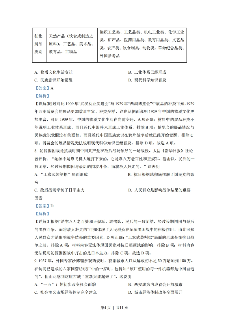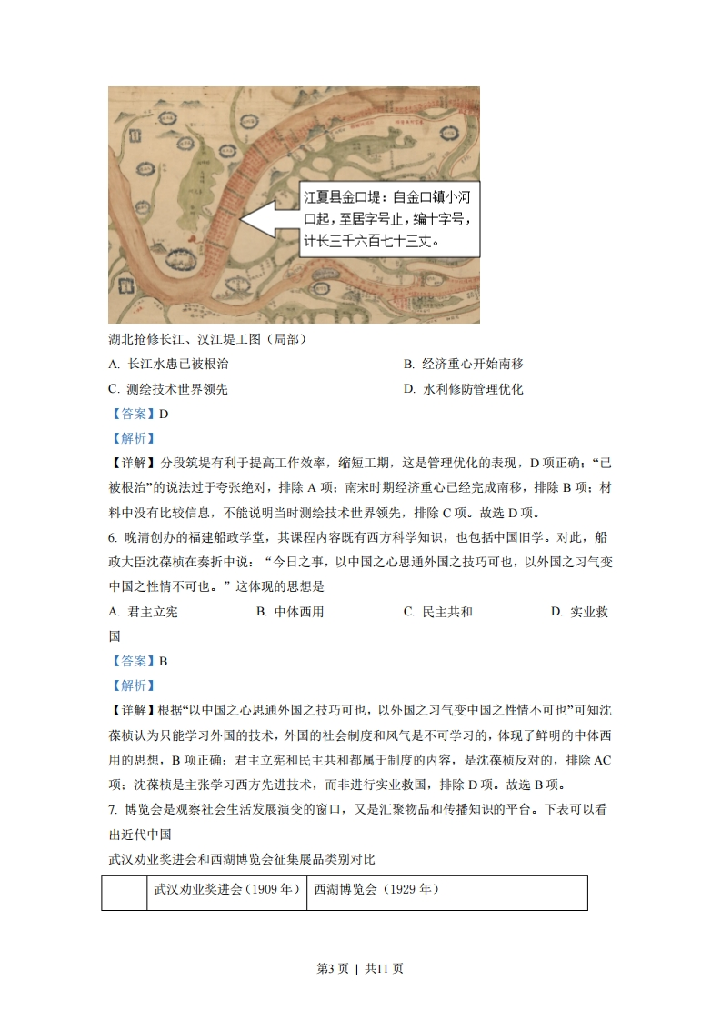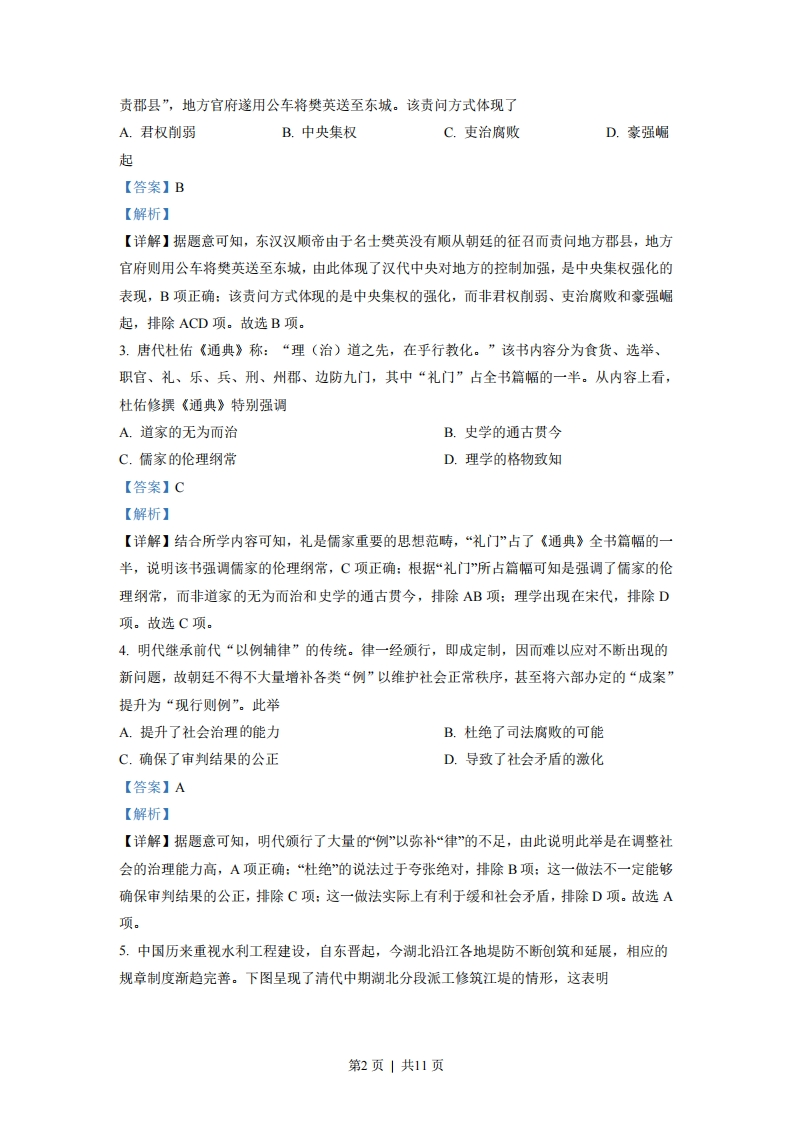 湖北省2021年普通高中学业水平选择性考试历史试题注意事项:1.答题前,先将自己的姓名、准考证号填写在试卷和答题卡上,并将准考证号条形码粘贴在答题卡的指定位置。2.选择题的作答:每小题选出答案后,用2B铅笔把答题卡上对应题目的答案标号涂黑。写在试卷、草稿纸和答题卡上的非答题区域均无效。3。非选择题的作答:用黑色签字笔直接答在答题卡上对应的答题区域内。写在试卷、草稿纸和答题卡上的非答题区域均无效。4。保持卡面清洁,不要折叠、不要弄破、弄皱,不准使用涂改液、修正带、刮纸刀。一、选择题:本题共16小题,每小题3分,共计48分。在每小题给出的四个选项中,只有一项是符合题目要求的。1.“爵”通常被认为是饮酒器,也是饮酒礼上尊卑关系的象征,进而被用来代表品位序列。大约从西周到春秋,“五等爵”制渐趋成熟。这反映了A.治炼技术的提高B.铸造工艺的完善C.等级制度的发展D.宗法体系的崩溃【答案】C【解析】【详解】根据材料并结合所学可知,饮酒器“爵”是饮酒礼上尊卑关系的象征,被用来代表品位序列,是统治阶级身份地位的象征,是等级制度的一种体现。从西周到春秋,“五等爵”制渐趋成熟,反映了等级制度的发展,C项正确:材料未涉及治炼技术,排除A项:材料与铸造工艺无关,排除B项:宗法体系强调的是王族贵族按血缘关系分配国家权力,材料无法反映“宗法体系的崩溃”,排除D项。故选C项。2.东汉永建二年(127年)汉顺帝征召知名隐士樊英,但樊英称病推辞。于是,皇帝下诏“切第1页共11页
