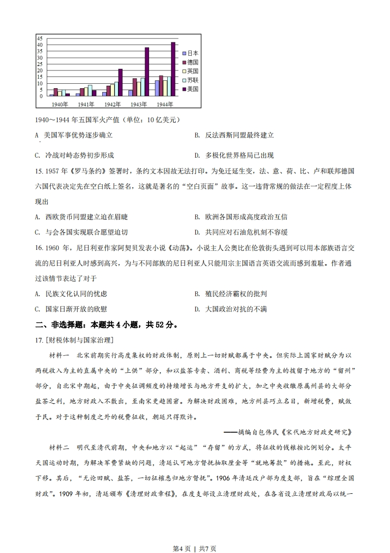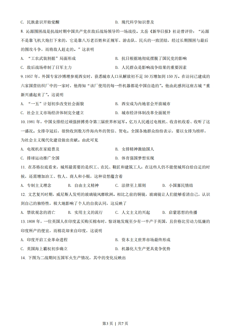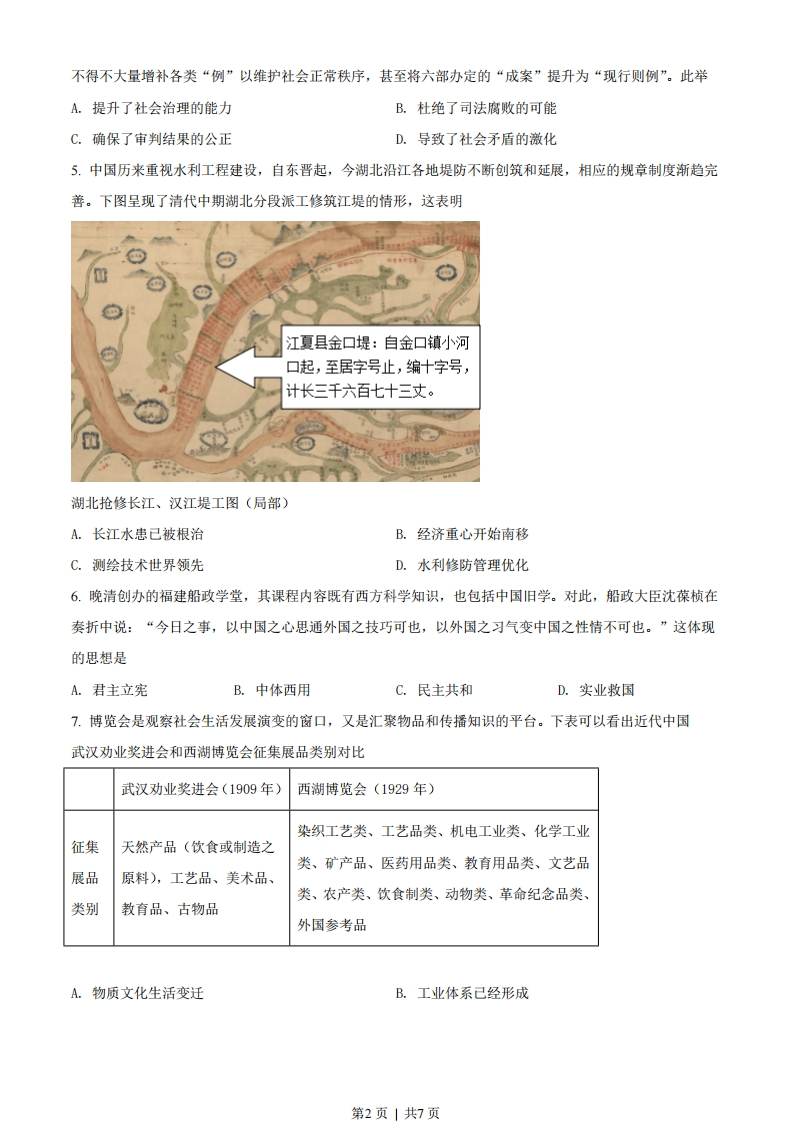 湖北省2021年普通高中学业水平选择性考试历史试题注意事项:1.答题前,先将自己的姓名、准考证号填写在试卷和答题卡上,并将准考证号条形码粘贴在答题卡的指定位置。2。选择题的作答:每小题选出答案后,用2B铅笔把答题卡上对应题目的答案标号涂黑。写在试卷、草稿纸和答题卡上的非答题区域均无效。3.非选择题的作答:用黑色签字笔直接答在答题卡上对应的答题区域内。写在试卷、草稿纸和答题卡上的非答题区域均无效。4.保持卡面清洁,不要折叠、不要弄破、弄皱,不准使用涂改液、修正带、刮纸刀。一、选释题:本题共16小题,每小题3分,共计48分。在每小题给出的四个选项中,只有一项是符合题目要求的。1.“爵”通常被认为是饮酒器,也是饮酒礼上尊卑关系的象征,进而被用来代表品位序列。大约从西周到春秋,“五等爵”制渐趋成熟。这反映了A.治炼技术的提高B.铸造工艺的完善C.等级制度的发展D.宗法体系的崩溃2.东汉永建二年(127年)汉顺帝征召知名隐士樊英,但樊英称病推辞。于是,皇帝下诏“切责郡县”,地方官府遂用公车将樊英送至东城。该责问方式体现了A君权削弱B.中央集权C.吏治腐败D.豪强崛起3.唐代杜佑《通典》称:“理(治)道之先,在乎行教化。”该书内容分为食货、选举、职官、礼、乐、兵、刑、州郡、边防九门,其中“礼门”占全书篇幅的一半。从内容上看,杜佑修撰《通典》特别强调A.道家的无为而治B.史学的通古贯今C.儒家的伦理纲常D.理学的格物致知4.明代继承前代“以例辅律”的传统。律一经颁行,即成定制,因而难以应对不断出现的新问题,故朝廷第1页」共7页