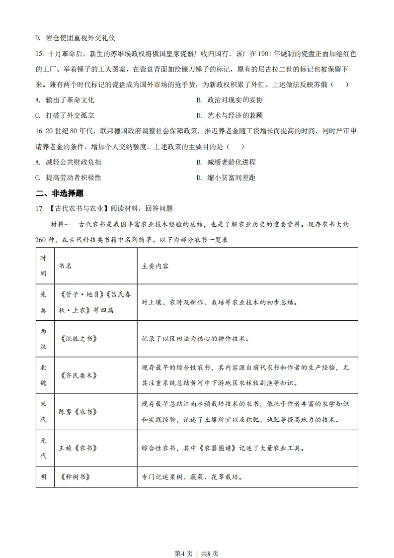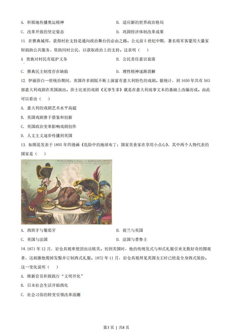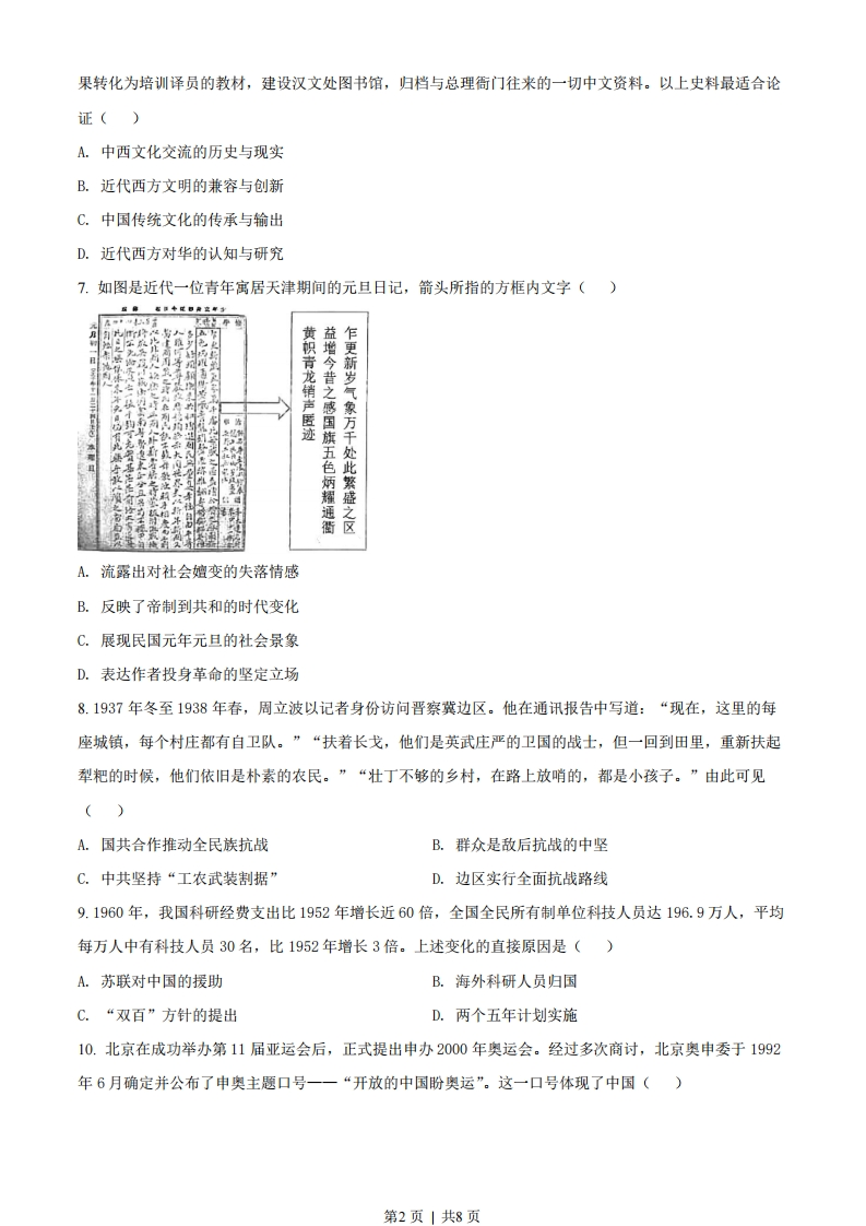 湖北省2022年普通高中学业水平选择性考试历史一、选择题1.1978年,湖北随州曾侯乙墓出土了一件精美的漆箱,箱盖上绘有按星空方位标注的二十八星宿图,其中的星宿名称多数与《石氏星表》中的记载相同。这表明()A.图像比文献记载更可靠B.西周重视天文观测C.文物与文献可相互印证D.楚国制漆工艺精湛2.下列关于秦汉历史的记述,集中反映了(文献记述出处秦并海内,兼诸侯,南面称帝,以养四海贾谊《过秦论》拨乱诛暴,平定海内,卒践帝祚,成于汉家。《史记秦楚之际月表序》接汉绪,茂育群生,恢复疆宇。《后汉书·班固传》A.统一多民族国家形成与发展B.家国同构模式改变C.“大一统”的观念开始出现D.华夏认同不断增强3.唐玄宗针对民间销毁铜钱用于铸造铜器的现象,下诏日“今天下泉货益少,币帛颇轻,欲使天下流通,焉可得也”,遂禁止私造铜器,由官府统一收购治炼出的铜铅锡,杜绝私自买卖。制定该政策的主要原因是()A.国家财政的入不敷出B.铸币材料严重短缺C.铜铅锡专卖措施失效D.铜钱流通范围有限4.宋初《百家姓》以“赵钱孙李”为首,而唐末五代河西节度使张议潮割据敦煌时期形成的《敦煌百家姓》写本以“张王李赵”为首。二者排序不同体现了()A.地域文化观念的差异B.崇文抑武政策的实施C.社会流动的日渐固化D.门第观念的历史遗留5.明代不少士子凭借记诵时文范文应试,而不注重阅读儒家经典。正德年间,官员徐文薄上奏:“近时时文流布四方,书肆资之以贾利,士子假此以侥幸,宜加痛革…其书坊刊刻一应时文,悉宜烧毁,不得鬻贩。”该奏疏主要针对的现象是()A.士子应考投机取巧B.书商刊刻时文牟利C.儒学正统地位动摇D.八股文体日益僵化6.英国公使馆1861年进驻北京后,非常重视中文学习。公使馆负责汉文处的威妥玛将自己的汉学研究成第1页」共8页