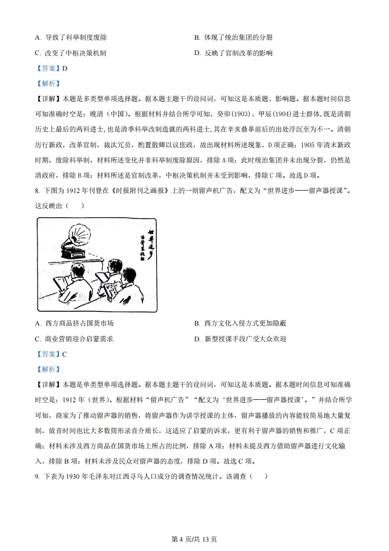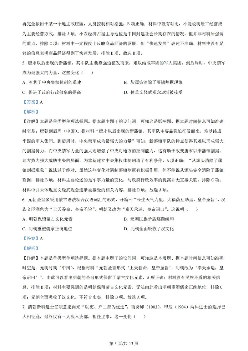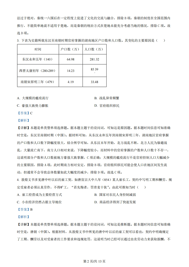 2024年湖南省普通高中学业水平选择性考试历史一、选择题:本题共16小题,每小题3分,共48分。在每小题给出的四个选项中,只有一项是符合题目要求的。1.西周时期,国人可以对军国大事发表意见,甚至能够影响国君废立,但不能改变宗主世袭制,更换国君不过是更换宗主。这说明西周()A.军国大事取决于国人B.血缘政治色彩浓厚C.王权与神权紧密结合D.宗法制度遭到破坏【答案】B【解析】【详解】本题是单类型单项选择题。据本题主题干的设问词,可知这是本质题。据本题时间信息可知准确时空是:西周(中国)。据材料可知,西周时期,国人虽能对军国大事发表意见,甚至影响国君废立,但不能改变宗主世袭制,更换国君也只是更换宗主,这说明即使国君可能因国人的意见而被更换,但新立的国君依然是基于血缘关系的继承,维护了血缘政治的传统,说明血缘政治色彩浓厚,B项正确:“军国大事取决于国人”说法错误,国人虽能发表意见并产生一定影响,但最终决定权不在国人,排除A项:材料中并未体现王权与神权紧密结合的相关内容,排除C项:材料表明宗法制度在当时依然发挥着重要作用,并非遭到破坏,排除D项。故选B项。2.据史料记载,秦人“畏有司而顺”,楚人“好游侠”“易发怒”。秦末,六国旧地都出现了反秦斗争,其中楚地声势最大,反应最为激烈。这可用于()A.证实秦对楚地的统治最为严苛B.说明秦楚之间文化冲突无法弥合C.证明秦朝的制度不适用于楚地D.解释汉初推行郡国并行制的原因【答案】D【解析】【详解】本题是单类型单项选择题。据本题主题干的设问词,可知这是目的题。据本题时间信息可知准确时空是:秦汉(中国)。据材料并结合所学可知,汉初统治者吸取秦朝灭亡的教训,认为秦朝单纯实行郡县制,未能充分考虑到各地的差异和历史文化背景,导致地方统治缺乏根基,容易引发反抗。而楚地在秦朝时就表现出强烈的反抗情绪,这使得汉初统治者认识到,对于像楚地这样具有独特文化和历史传统的地区,不能完全采用单一的郡县制进行管理。郡国并行制在一定程度上给子了地方一定的自治权,特别是对于那些文化传统深厚、地方特色鲜明的地区,能够更好地安抚民心,稳定统治,D项正确:仅从楚地反秦斗争声势最大不能直接证实秦对楚地的统治最为严苛,排除A项:“秦楚之间文化冲突无法弥合”这种说第1页供13页