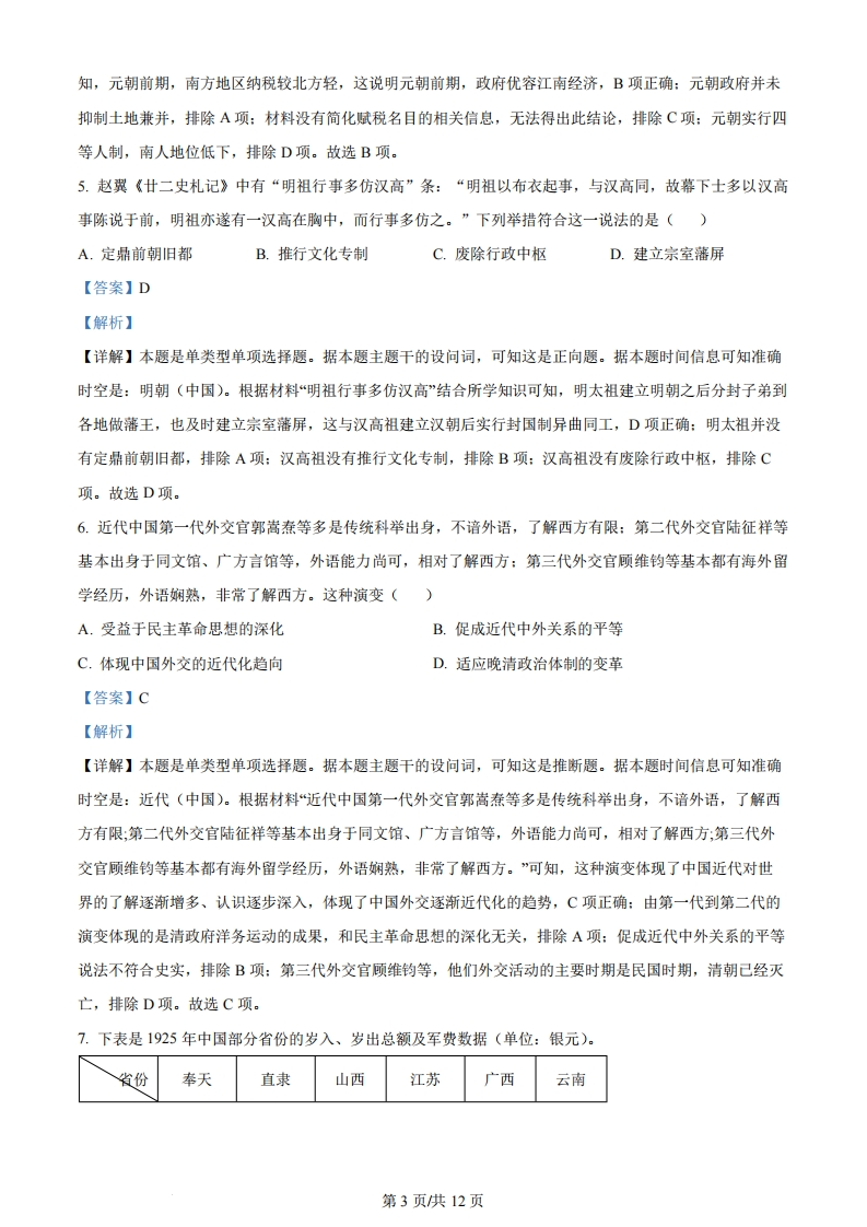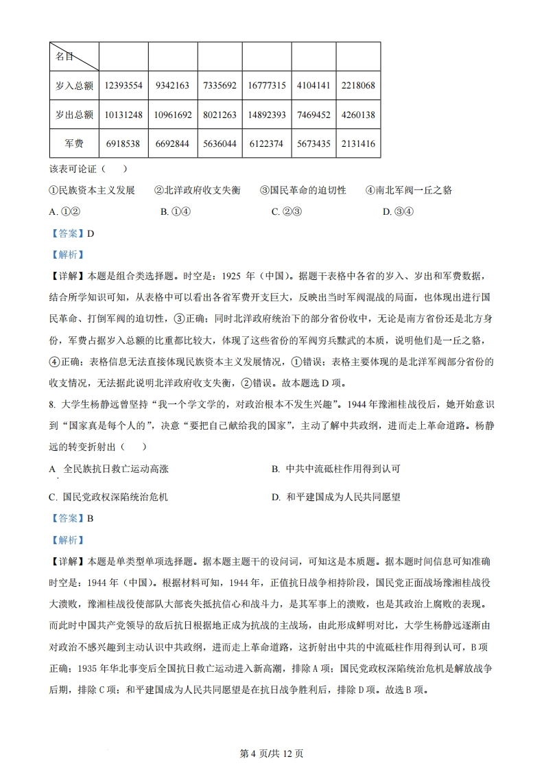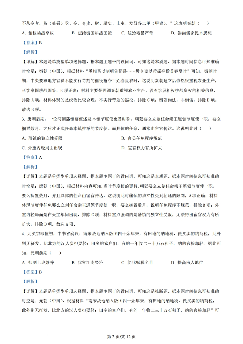 湖北省2024年普通高中学业水平等级考试历史注意事项:1.答题前,先将自己的姓名、准考证号、考场号、座位号填写在试卷和答题卡上,并认真核准准考证号条形码上的以上信息,将条形码粘贴在答题卡上的指定位置。2,请按题号顺序在答题卡上各题目的答题区域内作答,写在试卷、草稿纸和答题卡上的非答题区域均无效。3,选释题用2B铅笔在答题卡上把所选答案的标号涂黑;非选择题用黑色签字笔在答题卡上作答;字体工整,笔迹清楚。4.考试结束后,请将试卷和答题卡一并上交。一、选择题:本题共15小题,每小题3分,共45分。在每小题给出的四个选项中,只有一项是符合题目要求的。1.湖北襄阳凤凰咀遗址出土的“蛋壳陶杯”(如下图)制作精美,陶胎轻薄,杯壁厚度不超过0.5毫米。一般认为,蛋壳陶杯是显示尊贵身份的礼器。该类器物此前主要发现于龙山文化遗存,在其他地区极为罕见。据此可推断()正视图俯视图A.早期国家认同己广泛形成B.南北地区间贸易往来较为频繁C.史前文明存在远距离交流D.凤凰咀遗存与大汶口文化同期【答案】C【解析】【详解】本题是单类型单项选择题。据本题主题干的设问词,可知这是推断题。据本题时间信息可知准确时空是:新石器时代(中国)。根据材料可知,“蛋壳陶杯”此前主要发现于龙山文化遗存,在其他地区极为罕见”,但是湖北襄阳凤凰咀遗址出土了“蛋壳陶杯”,说明两个地区有了一定的联系,C项正确:新石器时期,国家尚未出现,排除A项:受生产力水平影响,新石器时代南北地区不可能贸易往来较为频繁,排除B项:据材料主要可以推知湖北襄阳凤凰咀和龙山文化之间存在交流,无法得出凤凰咀遗存与大汶口文化同期,排除D项。故选C项。2.《岳麓书院藏秦简》记载:“丞相其以制明告郡县…毋令吏以苛徭夺黔首春夏时。令皆明焉,以为恒。第1页供12页