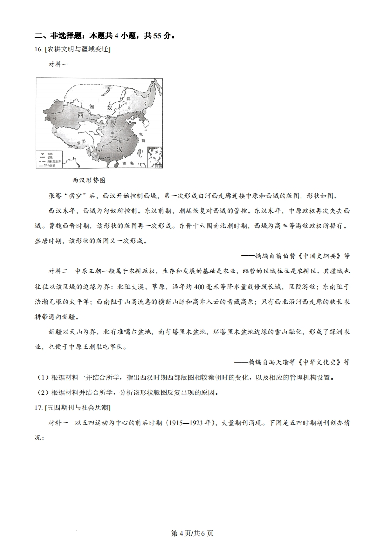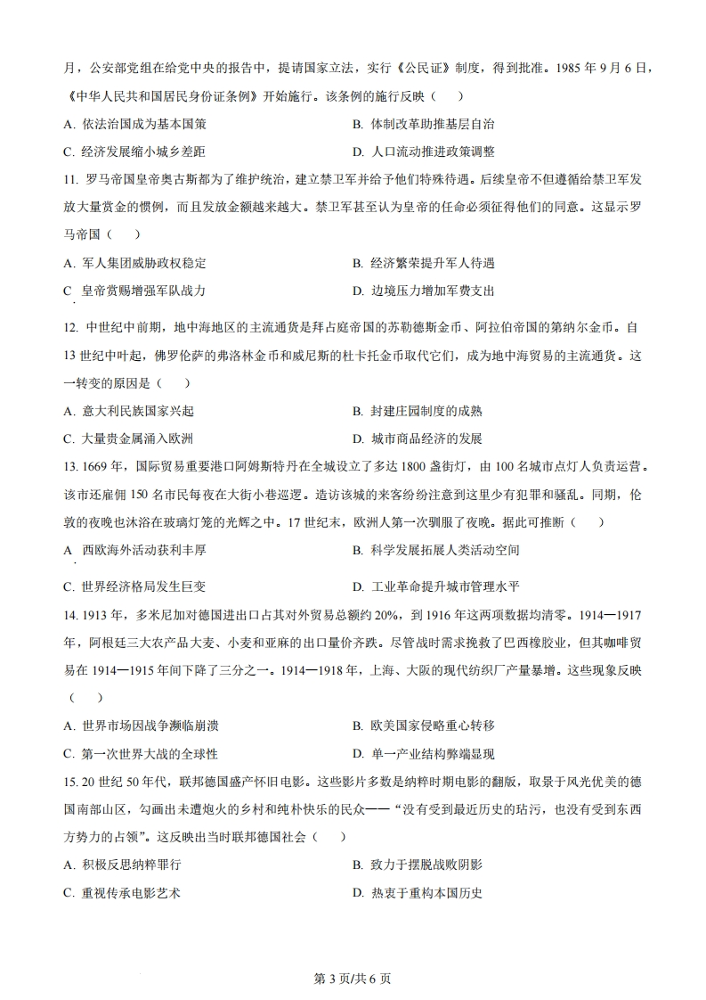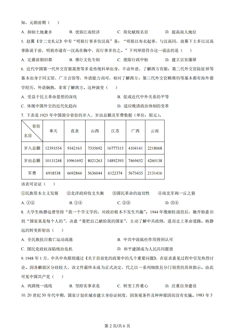 湖北省2024年普通高中学业水平等级考试历史注意事项:1.答题前,先将自己的姓名、准考证号、考场号、座位号填写在试卷和答题卡上,并认真核准准考证号条形码上的以上信息,将条形码粘贴在答题卡上的指定位置。2,请按题号顺序在答题卡上各题目的答题区域内作答,写在试卷、草稿纸和答题卡上的非答题区域均无效。3,选释题用2B铅笔在答题卡上把所选答案的标号涂黑;非选择题用黑色签字笔在答题卡上作答;字体工整,笔迹清楚。4.考试结束后,请将试卷和答题卡一并上交。一、选择题:本题共15小题,每小题3分,共45分。在每小题给出的四个选项中,只有一项是符合题目要求的。1.湖北襄阳凤凰咀遗址出土的“蛋壳陶杯”(如下图)制作精美,陶胎轻薄,杯壁厚度不超过0.5毫米。一般认为,蛋壳陶杯是显示尊贵身份的礼器。该类器物此前主要发现于龙山文化遗存,在其他地区极为罕见。据此可推断()正视图俯视图A.早期国家认同已广泛形成B.南北地区间贸易往来较为频繁C.史前文明存在远距离交流D.凤凰咀遗存与大汶口文化同期2.《岳麓书院藏秦简》记载:“丞相其以制明告郡县…毋令吏以苛徭夺黔首春夏时。令皆明焉,以为恒。不从令者,赀(处罚)丞、令、令史、尉、尉史、士吏、发弩各二甲(甲胄)。”这表明秦朝()A.相权挑战皇权B.延续秦国耕战国策C.统治残暴严苛D.崇尚儒家民本思想3.唐朝后期,一位河朔藩镇幕僚述及本镇节度使更替时称,朝廷要么立刻任命亲王遥领节度使一职,要么搁置数月,之后才正式任命本镇推举的节度使。而具体的任命,通常由宦官传达。这说明此时()A.藩镇的独立性受限B.官员任免程序规范C.外重内轻局面出现D.宦官权力有所扩大4.元英宗即位初,中书省奏议:南宋故地纳入版图四十余年来,有田地的纳地税,做买卖的纳商税,此外别无征发,比北方的汉人负担要轻:田多的富户们,有的一年收二三十万石租子,纳的官粮却轻。据此可第1页/共6页