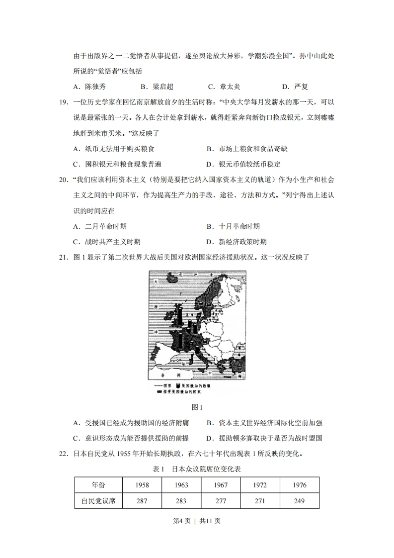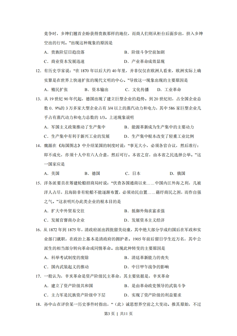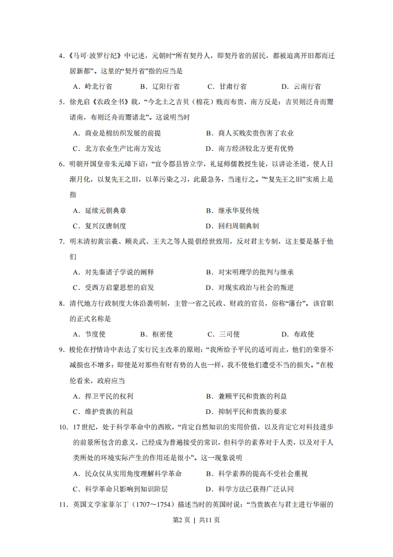 绝密★启用前2011年普通高等学校招生全国统一考试(海南卷)历史注意事项:1.本试卷分第I卷(选择题)和第Ⅱ卷(非选择题)两部分。答卷前,考生务必将自己的姓名、准考证号填写在答题卡上。2.回答第I卷时,选出每小题答案后,用铅笔把答题卡上对应题目的答案标号涂黑。如需改动,用橡皮擦干净后,再选涂其他答案标号。写在本试卷上无效。3.回答第Ⅱ卷时,将答案写在答题卡上。写在本试卷上无效。4.考试结束后,将本试卷和答题卡一并交回。第I卷本卷共25个小题,每小题2分,在每小题给出的四个选项中,只有一项是符合题目要求的。1.秦统一后,“废封建,立郡县”,确立专制集权制度,但皇帝之子、弟封王,一直延续到明清。“分王子弟,以为屏藩”,是历代分封子弟的主要理由。血缘分封长期存在说明A.分封制有利于政权长期稳定B.血缘分封是中央集权的基础C.分王子弟是皇权的一种体现D.。周代制度受到历代政权推崇2.西汉“文景之治”垂范后世。汉高祖“令贾人不得衣丝乘车,重租税以困辱之”:至文帝时,“法律贱商人,商人己富贵矣”,百姓“皆背本趋末”。晁错称这种现象是“俗之所贵,主之所贱也:吏之所卑,法之所尊也。上下相反,好恶乖迕”。这表明汉初A,商业活动的发展有利于经济恢复B.商业畸形发展造成了农民的贫困C,官商勾结使抑商政策未取得成效D.重农抑商政策背离了农民的意愿3.下列各项史料中,能够反映南宋都城临安面貌的是A.(崇仁坊北街)一街辐转,遂倾两市,昼夜喧呼,灯火不绝。B.有大市,自余(其余)小市十余所。大市备置官司,税敛既重,时甚苦之。C.酒楼歌馆,直至四鼓方静,而五鼓朝马将动,其有趁早市者,复起开张,无论四时皆然。D.郭(廓)城绕宫城南,悉筑为坊,坊开巷。坊大者容四五百家,小者六七十家。第1页|共11页