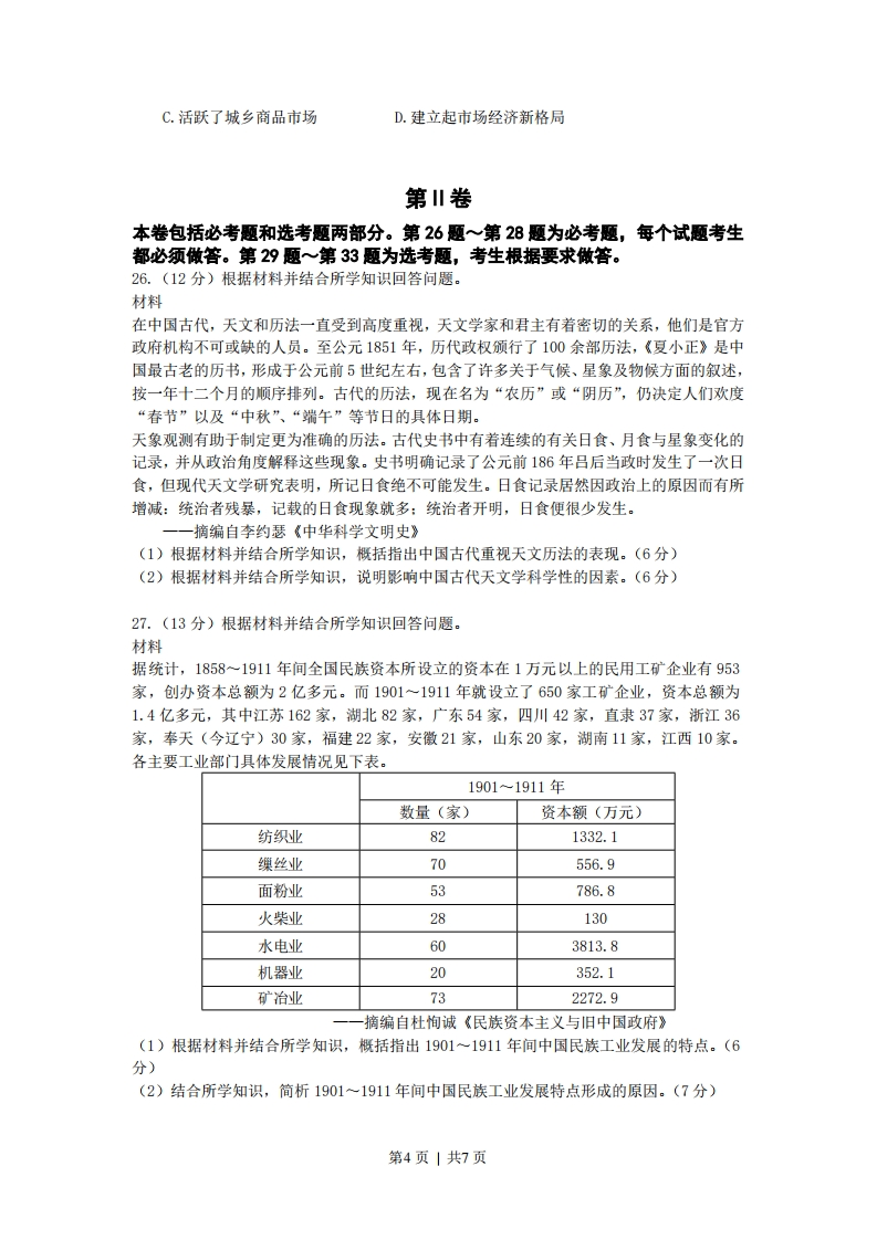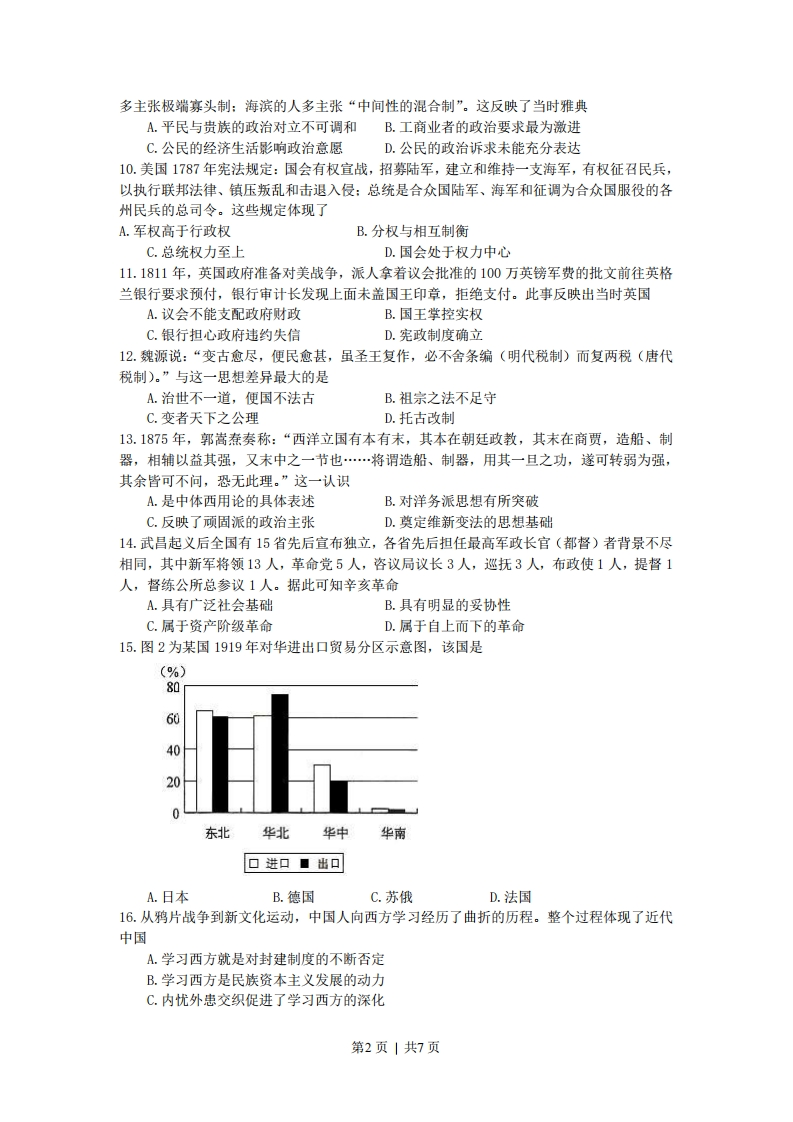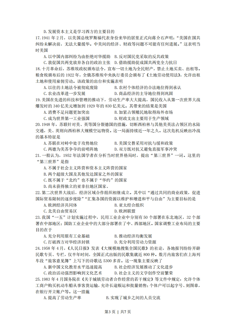 绝密★启用前2013年普通高等学校招生全国统一考试(海南卷)历史试题第1卷本卷共25个小题,每小题2分,在每小题给出的四个选项中,只有一项是符合题目要求的。1.商代甲骨卜辞中,有大量“受禾”、“求年”、“有足雨”的内容。这反映了当时A.农业生产己是重要的经济活动B.农业的收成与祭祀活动密切相关C.巫师是农业生产的重要组织者D.自然环境恶化影响农业生产2.西周以血缘关系为纽带的宗法制,不仅是周朝分封制的基础,对后世也有深刻影响。这表现在A.一夫多妻习俗长期延续B.皇位继承“立嫡不以长”C.诸子平等的财产继承权D.婚姻中的“门当户对”3.下面是汉字“律”的四种字体,其中直接取代篆书而流行的字体是AB4.唐玄宗时,令宫女为前方将士缝绵衣。一兵士于短袍中得诗:“沙场征战客,寒苦若为眠。战袍经手作,知落阿谁边。蓄意多添线,含情更着绵。今生己过也,结取后身缘。”玄宗得知后,将作诗宫女嫁给该兵士,这一故事主要反映的是当时A.佛教因缘观念影响深入B.诗歌成为表达爱情的方式C.官营手工业因战争衰败D.社会风气比较开放5.唐初征收赋税时,钱币与绢布、粮食并收,财政收入以贯、匹、石等为单位计算:到南宋时,赋税征收以钱币为主体,以“贯”为单位计算。这表明南宋A.商品经济快速发展B.农业手工业地位下降C.重农抑商政策松弛D.经济控制逐步加强6.朱元璋认为,“札乐者,治平之膏粱:刑政者,救弊之药石”,“刑政二者,不过辅礼乐为治耳”。这表明他A.强调严刑峻法的统治方式B.重视礼乐制度的教化作用D.兼采儒法二家为统治思想中国CNA2C.宣扬休养生息的政治主张7.下列中国古代科技著作中,成书于汉代的是A.《本草纲目》B.《齐民要术》C.《九章算术》D.《石氏星表》8.图1反映的是A.“小国寡民”的生活图景B.小农经济的生产形式C.儒教“夫为妻纲”的伦理观念D.“男主外、女主内”的家庭关系9在梭伦上台前,雅典全邦分成不同派别。山区的人多主张采行极端民主制:平原地区的人第1页|共7页