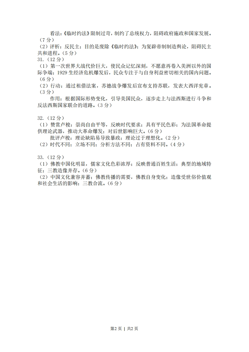 绝密★启用前2013年普通高等学校招生全国统一考试(海南卷)历史试题答案及评分参考评分说明:非选择题部分,若考生答案与本答案不完全相同,但言之有理,可酌情给分,但不得超过该题所分配的分数。第I卷本卷共25个小题,每小题2分。题号12345618910111213答案ABDA⊙CBcBDDB题号141516171819202122232425答案BADcADAABC第Ⅱ卷26.(12分)(1)多种天文观测仪器制造与改进:丰富的天象观测记录:不断完善的历法:中央政府支持、组织,设置专门机构。(6分)(2)将天象变化与现实政治相联系,天人感应思想:注重实用性,理论探讨不足。(6分)27.(13分)(1)发展速度快:各部门发展不平衡,以轻工业为主:地区发展不平衡,集中于东部沿海地区:民族资本力量弱小,对外国资本依赖性较强。(6分)(2)清政府放宽民间设厂限制,鼓励发展工商业:实业救国思潮兴起:轻工业投资少、见效快:长江流域和沿海地区受西方经济影响较深:受到外国资本的挤压。(7分)28.(13分)(1)共和制逐渐获得广泛支持:国民议会中力量对比发生有利于共和派的变化:君主派与共和派之间不存在根本利益上的冲突:宪法吸收了各派意见,借鉴了英美经验。(7分)(2)具有总统制和议会制双重特色:权力重心在议会,总统由议会选出,权力相对较小,总统之下设有内阁。(6分)选做题(五选一)29.(12分)(1)国内货币制度混乱:世界经济危机波及到中国:巩固统治,发展经济。(4分)(2)遏制白银外流,稳定金融:促进了经济和贸易发展:有利于缓解经济危机影响:加强了政府的经济控制力,推动国家垄断资本形成:与世界经济联系加强,增加了对外国资本的依赖。(8分)30.(12分)(1)背景:袁世凯控制了政权:得到立宪派、旧官僚和列强的支持。第1页|共2页