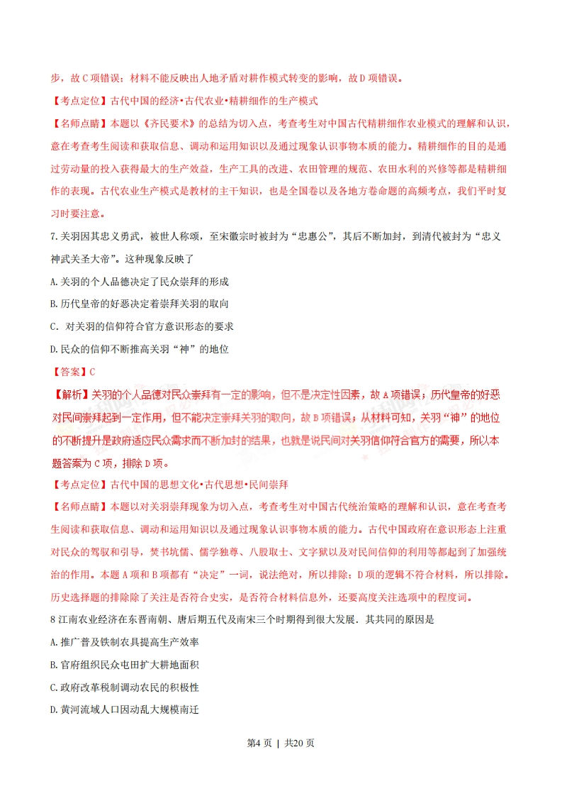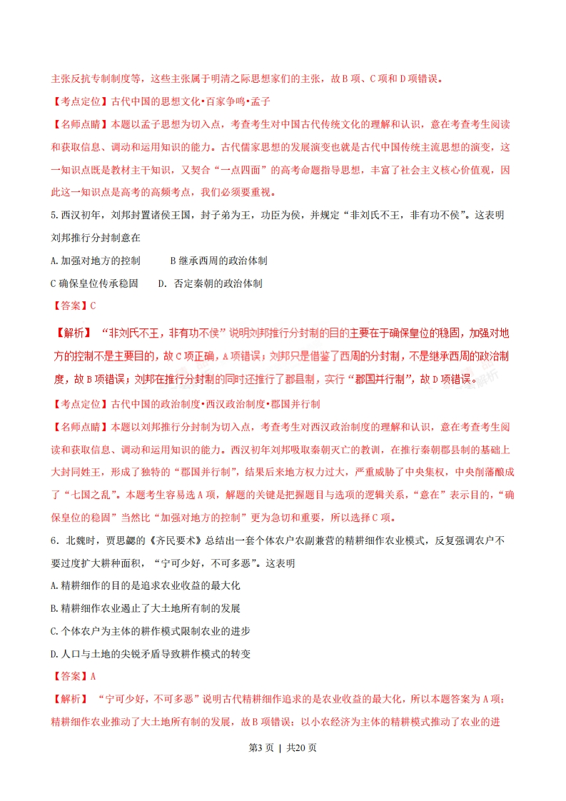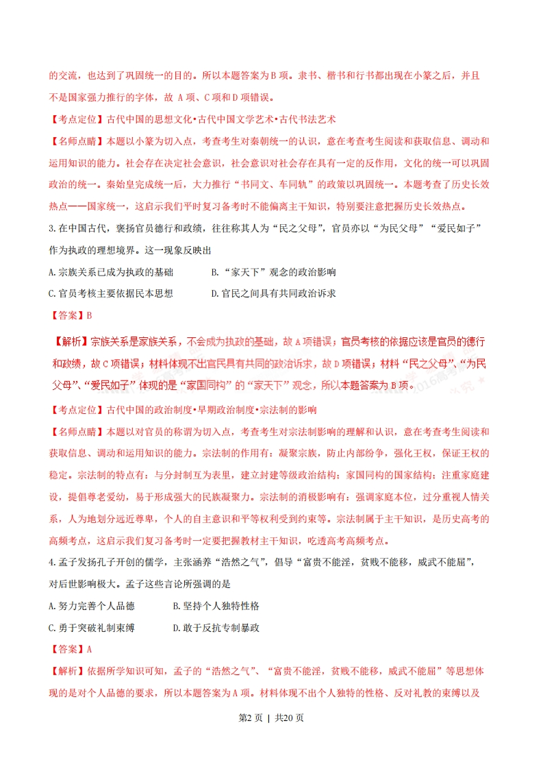 2016年普通高等学校招生全国统一考试海南历史第I卷本卷共25小题,每小题2分。在每小题给出的四个选项中,只有一项是符合题目要求的。1.图1是中国古代一面铜镜背面的局部,图饰为葡萄,它的制作朝代应当是图1A.商B.周C.秦D.唐【答案】D【解析】依据所学知识可知,葡萄传入中国最早是在西汉,故A项、B项和℃项错误;西汉武帝时张骞出使西域,沟通了中原与西域的联系,此后丝绸之路开通,中国与中亚、西亚经济文化联系越来越密切,葡萄、首蓿等作物品种从西域传入中原,因此这面铜镜的制作应当是在唐代,所以本题答案为D项。【考点定位】古代中国的经济·古代对外贸易·丝绸之路【名师点睛】本题以唐代铜镜为切入点,考查考生对中国古代对外交往的认识,意在考查考生阅读和获取信息、调动和运用知识的能力。丝绸之路的开通促进了东西方经济文化的交流和融合,葡萄、首蓿等农作物的传入,丰富了人民的生活,也为艺术创作提供了新的素材。本题契合当今“一带一路”的热点问题,历史高考一般通过隐性的方式考查热点,这要求我们老师在把握热点的基础上,要深入研究考查的形式和载体。2.中国古代书法在发展过程中形成了多种书体,属于国家强力推行的是A.隶书B.小篆C.楷书D.行书【答案】B【解析】文字是文化的载体,也是政治的体现,服务于政治。秦朝统一后,秦始皇为了巩固统一,下令统一文字、统一货币、统一车轨、修筑驰道等。“书同文”,把七国文字统一为小篆,这不仅有利于文化第1页|共20页