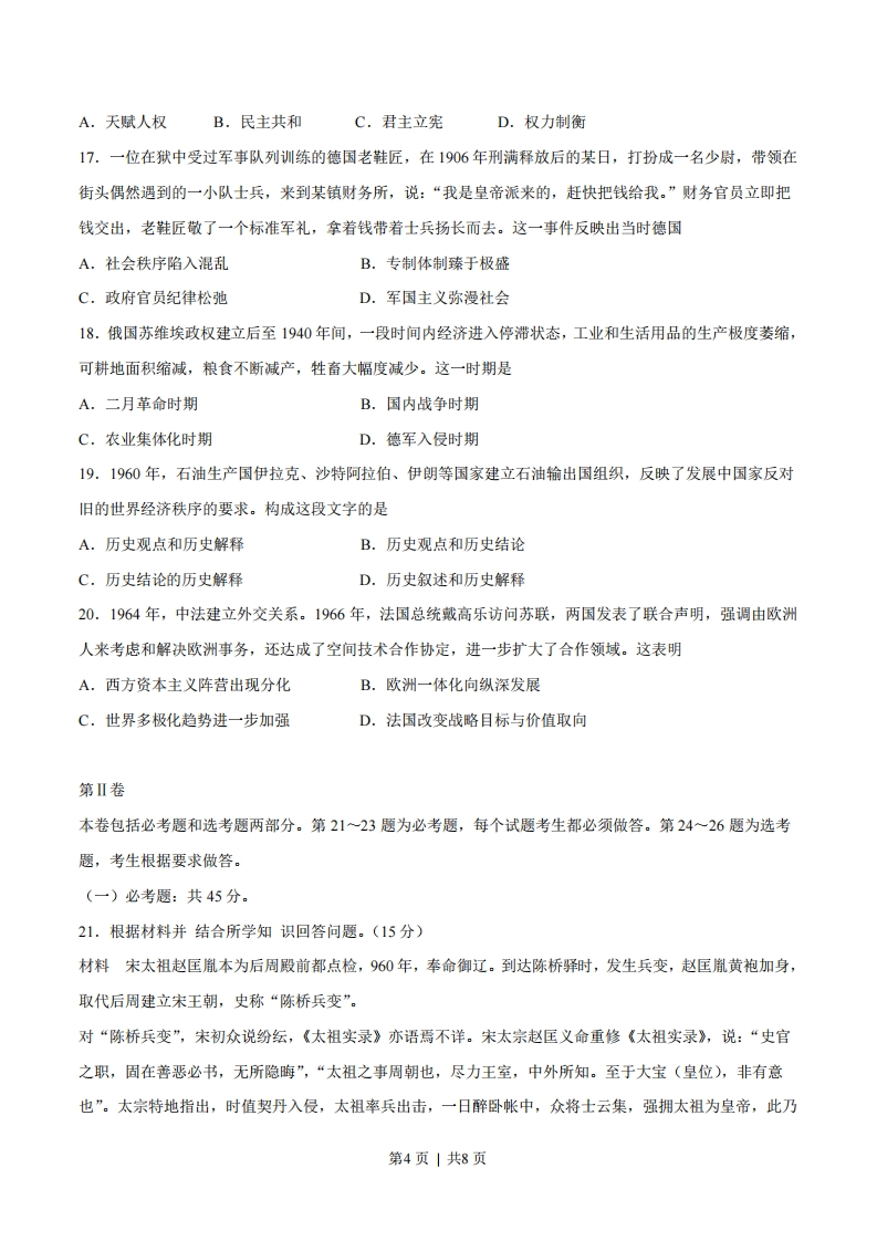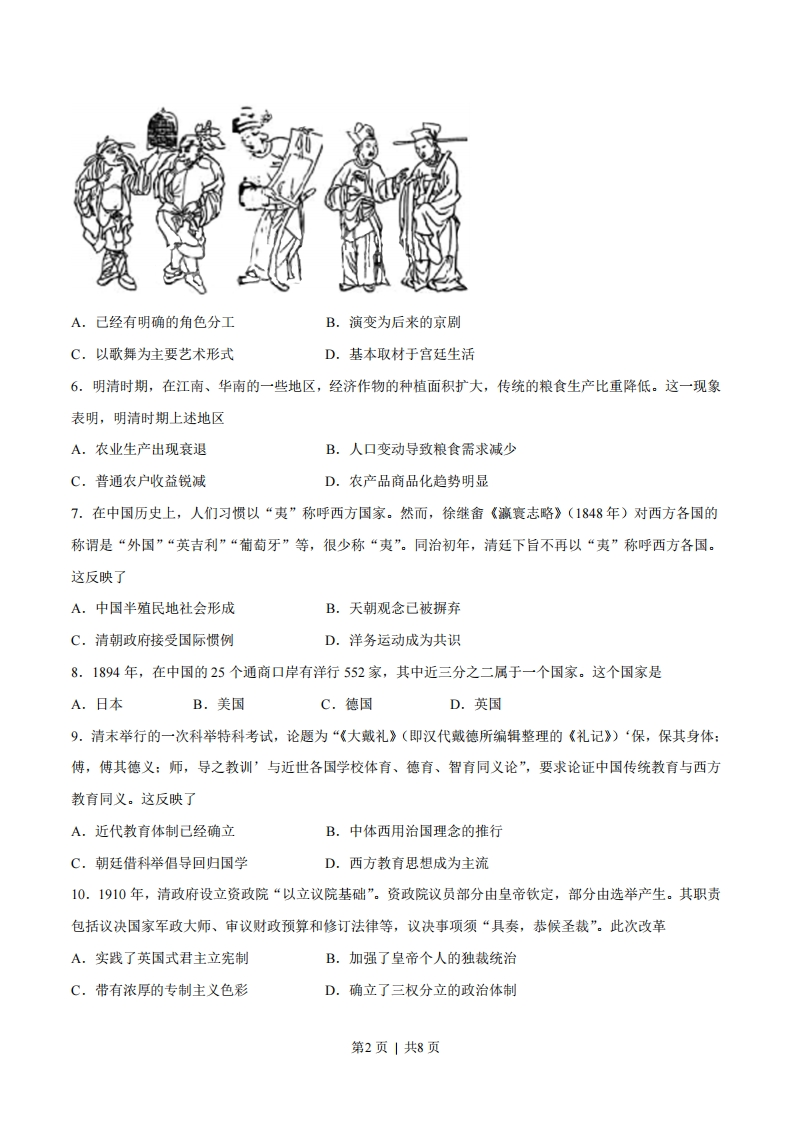 2017年普通高等学校招生全国统一考试(海南卷)历史试题第I卷本卷共20小题,每小题2分,共40分。在每小题给出的四个选项中,只有一项是符合题目要求的。1.考古工作者在河南辉县琉璃阁发掘了一座春秋时期的诸侯墓,出土了只有周天子才能使用的九鼎。这反映了A.宗法制度的瓦解B.分封制度的崩溃C.等级制度的颠覆D.礼乐制度的破坏2.“物格而后知至,知至而后意诚,意诚而后心正,心正而后身修,身修而后家齐,家齐而后国治,国治而后天下平。”下列各项中,最接近这一说法的是A.其身正,不令而行:其不正,虽令不从B.视天下犹一家,中国犹一人C.勿以恶小而为之,勿以善小而不为D.居庙堂之高,则忧其民:处江湖之远,则忧其君3.东汉实行察举制,“郡察孝廉,州举茂才”,州、郡都必须定期向朝廷举荐一定数量的人才,而判断孝廉、茂才的标准包括对儒家经典的熟悉程度和道德声望的高低等。这客观上A.推动了独尊儒学局面的出现B.促使社会阶层趋于固化C.打破了世家大族对政权的垄断D.动摇了郡县制的基础4.“唐初,兵之戍边者,大曰军,小曰守捉,曰城,曰镇”,镇将只掌防戍守御。宋代,诸镇“置于管下火烟繁盛处,设监官,管火禁或兼酒税之事”。镇的功能变化反映了A.商品经济的发展B.坊市制度被逐渐打破C.地方行政机构权力扩大D.边患问题得到解决5.图1是我国出土的古代杂剧砖雕图案。据此可知,元杂剧第1页|共8页