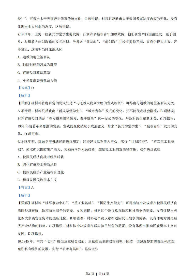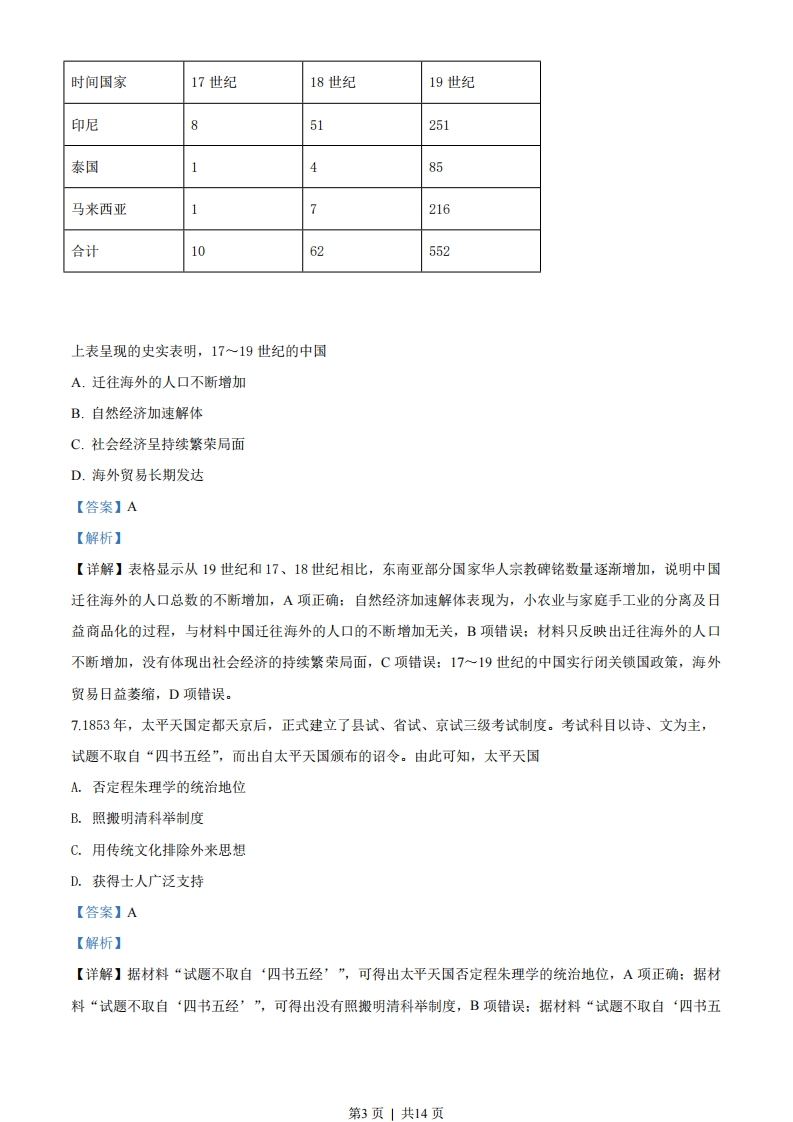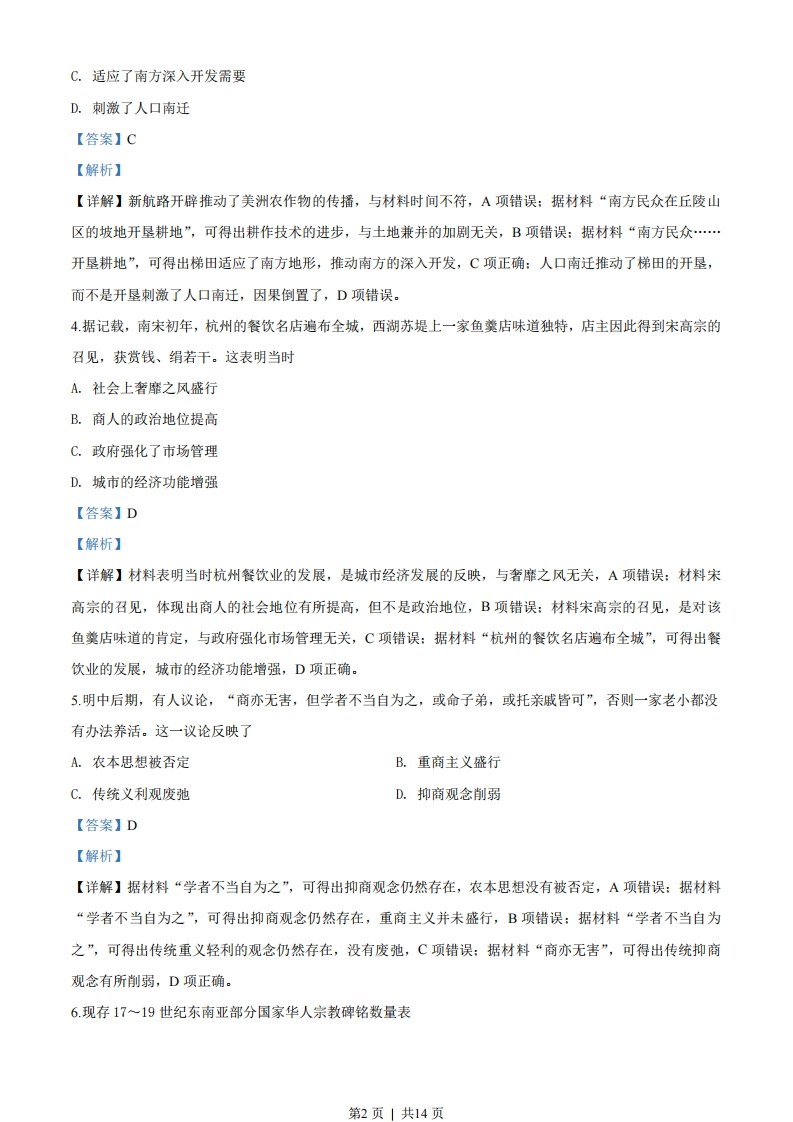 2018年普通高等学校招生全国统一考试文科综合能力测试(海南卷)历史一、单选题(本大题共20小题,共40分)1.下列汉字字体中,得名缘于书写材质的是A.隶书B.金文C.小篆D.草书【答案】B【解析】【详解】隶书作为小篆的辅助字体而得名,解决篆书书写不方便的问题,与书写材质无关,A项错误:商周时期铸在青铜器上的文字,被称为“金文”,得名缘于书写材质,B项正确:小篆是秦朝官方文书通用字体,与书写材质无关,C项错误:草书得名体现出其书写奔放跃动的特点,与书写材质无关,D项错误。【点睛】金文是指铸造在殷周青铜器上的铭文,也叫钟鼎文。商周是青铜器的时代,青铜器的礼器以鼎为代表,乐器以钟为代表,"钟鼎"是青铜器的代名词。2.《汉书》云:“汉家承秦之制,并立郡县,主有专己之威,臣无百年之柄。”这表明在西汉A.分封制度退出历史舞台B.宗法制度趋于瓦解C.郡县制有利于维护皇权D.官僚制度未能建立【答案】C【解析】【详解】战国后期分封制度逐渐退出历史舞台,与材料时间不符,A项错误:春秋战国时期宗法制度趋于瓦解,与材料时间不符,B项错误:据材料郡县制使得“主有专己之威,臣无百年之柄”,可得出郡县制有利于维护皇权,C项正确:秦朝确立三公九卿制,官僚制度己经建立,D项错误。【点睛】郡县制和分封制相比,最大特点是可以加强中央集权,分封制度下诸侯权力较大,无法加强中央集权。3唐宋时期,南方民众在丘陵山区的坡地开垦耕地,引泉水灌溉,形如阶梯,被称为山田,也叫梯田。这种做法A.推动了美洲农作物的传播B.加剧了土地兼并第1页」共14页