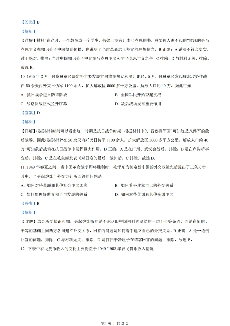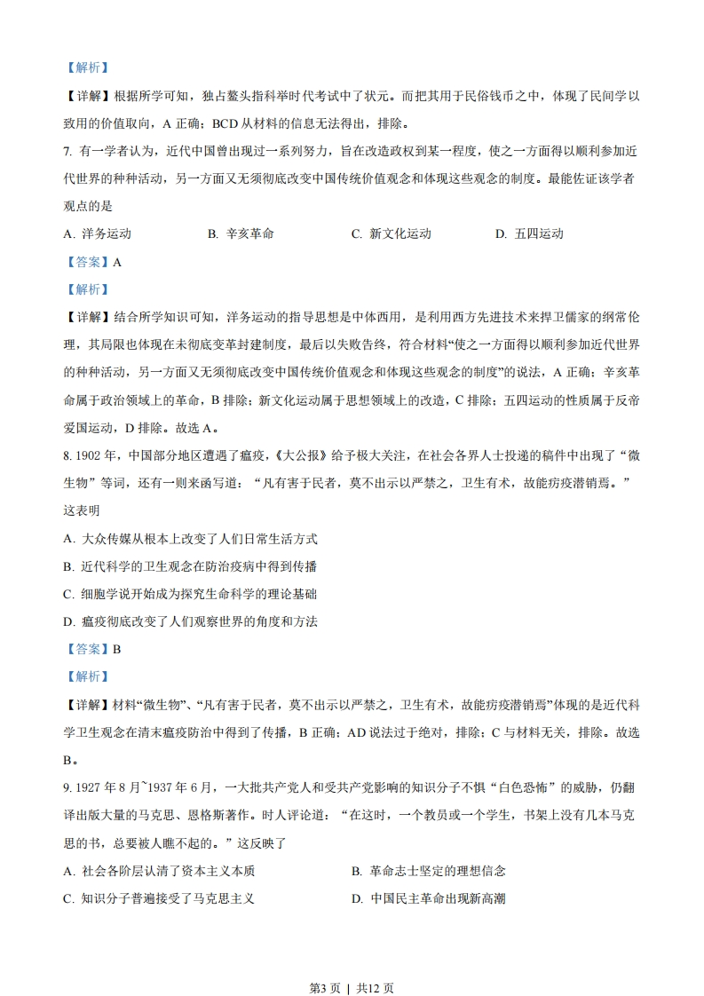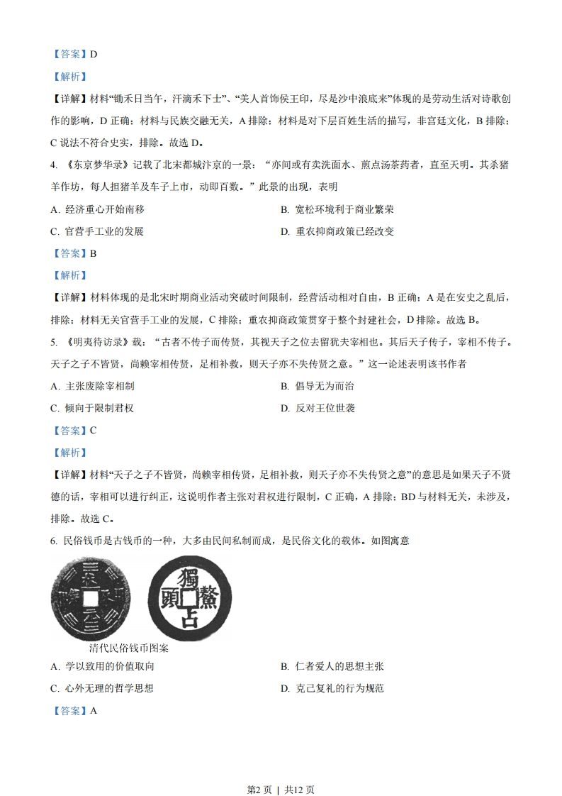 海南省2020年普通高中学业水平选择性考试历史试题一、选择题1.西周初,为了在各地部署监察力量,由王族带领归顺的外族进驻各地,与土著长期混居。此举A.加强了对新拓版图的控制B.改变了早期宗法制的核心C.实现了从诸侯争霸到皇权的统一D.延续了选举部落贤人为王的传统【答案】A【解析】【详解】根据材料“由王族带领归顺的外族进驻各地,与土著长期混居”结合所学知识可知,西周初年,通过对王族的分封制,加强对地方的统治,也拓展了周王朝的疆域,A正确:宗法制的核心是嫡长子继承制,影响深远,B排除:皇权的统一是在秦朝,C排除:D说法不符合史实,排除。故选A。2.如图是从汉至明的服饰示意图,所体现的阶层特征表明了汉明上劳动者中官吏下贵族妇女A.统一多民族国家的发展历程B.礼制对中国服饰的深远影响C.男耕女织小农经济的历史变迁D.中国传统文化主流思想的演变【答案】B【解析】【详解】材料中所涉及的“上、中、下”所体现出的等级可以看出,不同等级的服饰是不一样的,这与传统礼制强调等级秩序有关,故B项正确:ACD项与主旨没有关系,排除。3.如表唐诗(摘录),可见诗人诗句出处李绅“锄禾日当午,汗滴禾下土。”杜甫“渔人漾舟沈(沉)大网,截江一拥数百鳞。”《全唐诗》刘禹锡“美人首饰侯王印,尽是沙中浪底米”A.民族交融促进了文化的发展B.宫廷文化己经普及到民间C.文学创作推动社会阶层流动D.劳动生活是诗歌创作来源第1页」共12页