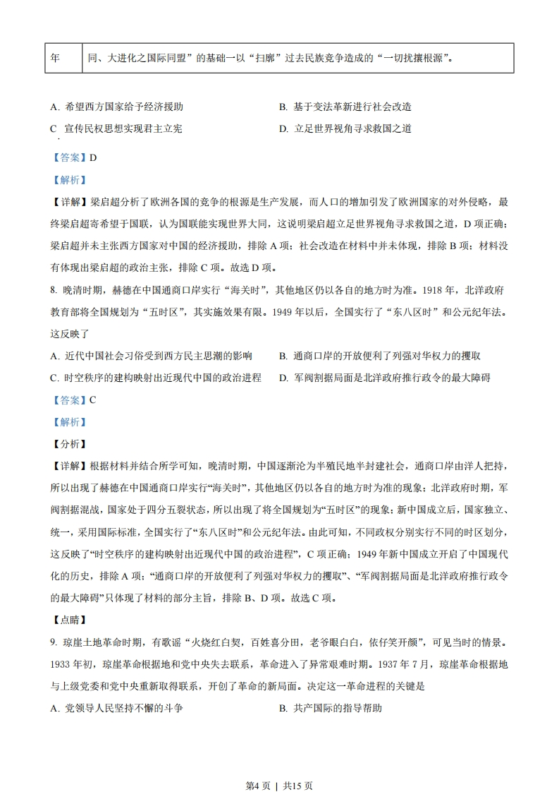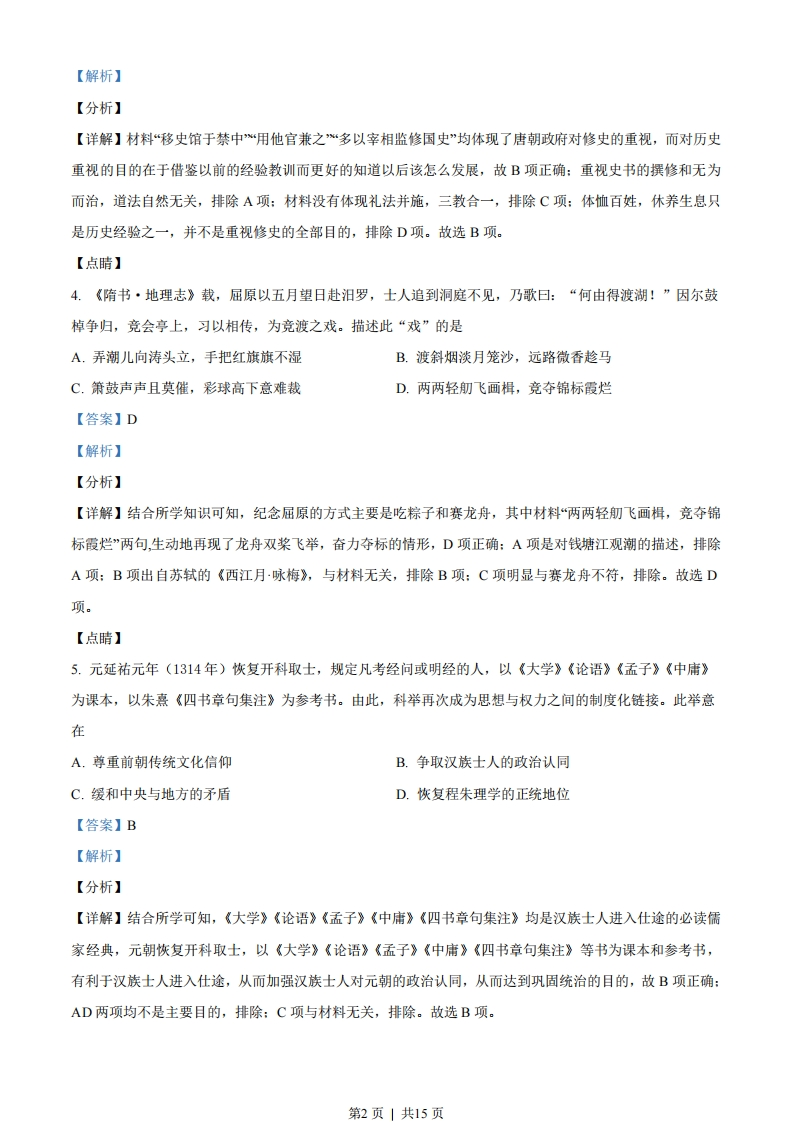 海南省2021年普通高中学业水平选择性考试历史试题一、选择题1.《论语·子罕》有曰:“子绝四:毋意,毋必,毋固,毋我。”这反映了孔子A.具有尊卑等级的观念B.拥有博爱节俭的美德C.秉持不偏不倚的态度D.达到清静无为的境界【答案】C【解析】【分析】【详解】材料“子绝四:毋意,毋必,毋固,毋我”大意是孔子杜绝了四种毛病:不凭空臆测,不武断绝对,不固执拘泥,不自以为是,这体现了孔子不偏不倚的中庸态度,故C项正确:材料和尊卑等级观念无关,排除A项:材料不能体现博爱节俭,排除B项:D项是道家思想主张,排除D项。故选C项。【点睛】2.《汉书·食货志》载:“民三年耕,则馀一年之畜。衣食足而知荣辱,廉让生而争讼息,故三载考绩。”这反映了官员考核的主要依据是A.德政教化的成效B.断狱决疑的能力C.博闻辩智的才情D.慎独律己的修养【答案】A【解析】【分析】【详解】材料“民三年耕,则馀一年之畜。衣食足而知荣辱,廉让生而争讼总,故三载考绩”大意是:人民勤恳耕作三年,家里才会出现剩余,人民丰衣足食后就会知晓荣誉和耻辱,这就会减少犯罪和争讼现象,因此对官员的考核要三年一次,由材料可以看出,人民是否知晓荣辱、犯罪现象的多少是对官员考核的主要依据,体现了德政教化对官员考核的重要性,故A项正确:材料强调对官员的考核主要依据该官员治下的犯罪多少和人民是否知晓荣辱,BCD三项均和材料这一主旨不符,排除。故选A项。【点睛】3.《旧唐书》载,贞观年修五代史,移史馆于禁中。史官无常员,如有修撰大事,则用他官兼之,事毕日停。贞观己后,多以宰相监修国史,遂成故事也。天宝己后,他官兼领史职者,谓之史馆修撰,初入为直馆也。这些措施旨在A.无为而治,道法自然B.鉴往知来,文以化成C.礼法并施,三教合一D.体恤百姓,休养生息【答案】B第1页」共15页