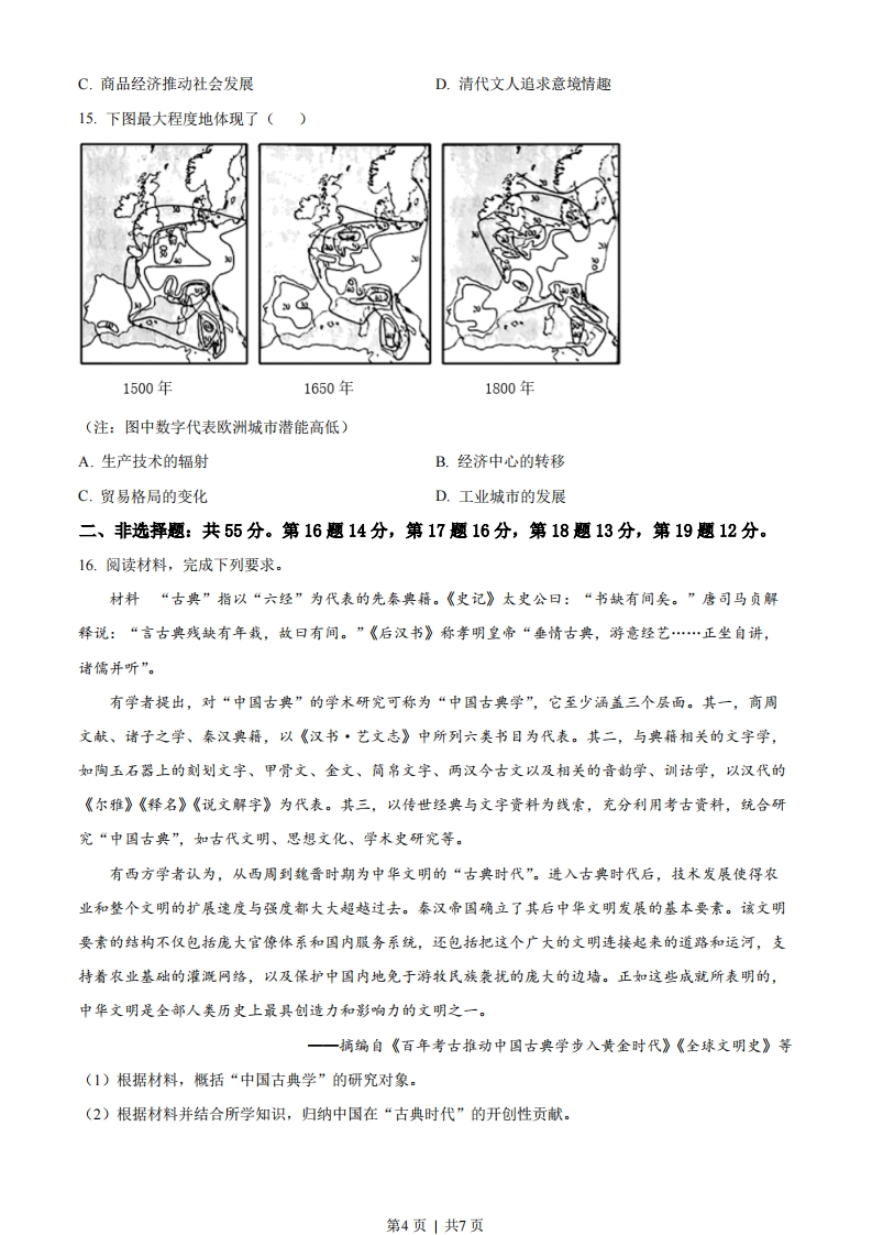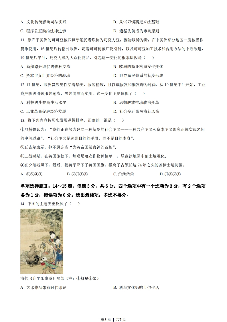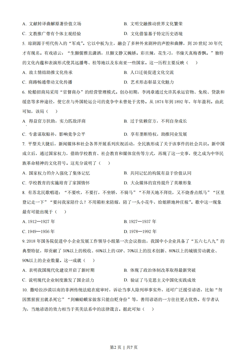 2023年高考海南历史真题本试卷满分100分,考试时间90分钟。一、选择题:本大题共15小题,每小题3分,共45分。分为单项选择题I和单项选择题Ⅱ两部分。单项选释题I:1~13题,每题3分,共39分。每题只有一个正确选项。1.据《史记·周本纪》载,周武王“率戎车三百乘,虎贲三千人,甲士四万五千人,以东伐纣”。而战国晚期,秦、齐、楚等诸侯国都拥有人数近百万的军队,连七国中最小的韩国也有30万兵力。这一变化主要是因为()A.军事理论的形成B.生产方式的变革C.政治制度的演进D.地形地势的利用2.据东汉《乙瑛碑》载,鲁相乙瑛向朝廷陈请,为孔庙增设一名百石卒史来守庙并掌管礼器(流程如下图)。这一史实最适合用来说明,当时()皇帝⑤裁可尚书奏请④同空②同徒5③调查D⑦起回太常⑥下诏请报追加命令鲁相乙瑛鲁相平(注:①一⑦表示处理此事的先后步骤)A.国家行政中枢权力的逐渐扩大B.专制主义中央集权的日益巩固C.传统社会道德秩序的渐趋规范D.封建国家不同职能的有效履行3.有学者认为,宋代的识字率相对较高。真定府的一处摩崖石刻显示,山区牧羊人也有能读会写者:南方农村的文化教育水平高于北方,如建州“耕且读者十家而五六”,邵武军的许多村落“皆聚徒教授”。这一现象表明当时()A.书院制度日趋完备B.雕版印刷相当普及C.崇文兴教渐成风尚D.文化重心己经南移4.“楚弓楚得”的典故出自《说苑·至公》。欧洲学者在17世纪用拉丁文给《论语》作注时,认为中国人心胸宽广、有君子之德,援引了这一典故,但将其中的“弓”换成了西方骑士惯用的“盾”。这说明()第1页」共7页