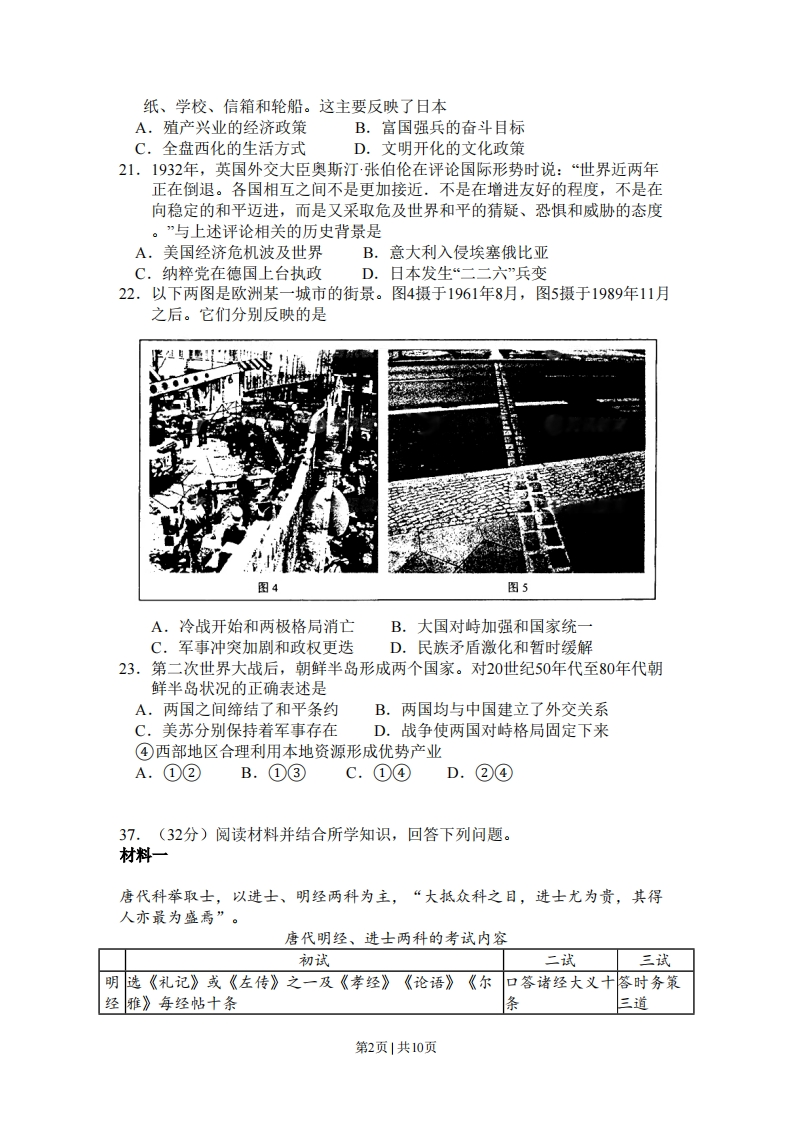 2008年浙江高考文科综合(历史部分)12.中国古代地名中的“阴”、“阳”往往体现了该地与相邻山、水的关系。以下都表示“阴”的方位是A.山之南、水之北B.山之南、水之南C.山之北、水之北D.山之北、水之南13.一位在华美国人士在评论近代中国的一部著作时说:“它是因中英战争刺激而产生的一部成果。我们认为它将极大地摧毁傲慢心态,驱散中国统治者和学究们的愚味无知,证明他们所属的并非地球上的惟一一个国家。”该著作的作者是A.姚莹B.徐继畲C.郑观应D.严复14.洋务运动时期,有一类企业是“由官总其大纲,察其利病,而听该商董等自立条议,悦服众商”。采用选种经营管理方式的企业是A.江南制造总局B.轮船招商局C.发昌机器厂D.耶松船厂15.1920年,梁启超在《欧游心影录》中谈到“科学万能说”时,认为它“当然不能像从前一样的猖獗”。梁启超之所以这样说,是因为A.科学技术在中国的传播遇到阻碍B,科学技术在欧洲的发展水平很高C.科学技术在世界大战中成为战争工具D.科学技术的发展速度减缓16.抗日战争时期,陕甘宁让区“不禁止地主、富农、国民党员参选议员”。这说明陕甘宁边区A.实行民主选举制度B.接受国民政府直接领导C,实现了国菇两党党内合作D.组建了多党联合政府17.美国《时代》周刊评论说,1943年1月相关外交文件的签署“开辟了中国与西方列强之间关系的新纪元”。这一评论指的是A.中国与英、美等国签署宣言,保证团结一致打败法西斯B.中国与英、美两国签署宣言,要求日本无条件归还侵占的中国领土C.中国与英、美两国发表公告。敦促日本无条件投降D.中国与英、美两国签约,宣布废除英美在华治外法权等特权18.1949年10月1日,中华人民共和国成立。当时一些报刊评论说,“中国人民站起来了”。这句话的含义之一是A.新民主主义革命已经完成B.国民党在大陆的势力被彻底清除C.人民掌握了国家权力D.人民代表大会制度确立19.诺贝尔奖获得者道格拉斯诺斯写道:“假设一位古希腊人能被奇迹般地送到1750年的英国,他或她会发现许多熟悉的事物。不过,如果希腊人再晚两个世纪被送来,就会发现,自己宛如置身于一个幻想'的世界,什么都不认识,甚至什么都不理解。”作者提出后一种假设的主要历史依据是A.工业社会形成与发展B.人口爆炸性增长C.经济全球化进程加速D.各国间交往密切20.在1878年的日本,儿童玩拍球游戏时,用10种最值得采用的新事物的名称来代替数字,它们分别是汽灯、蒸汽机、马车、照相机、电报、避雷针、报第1页共10页