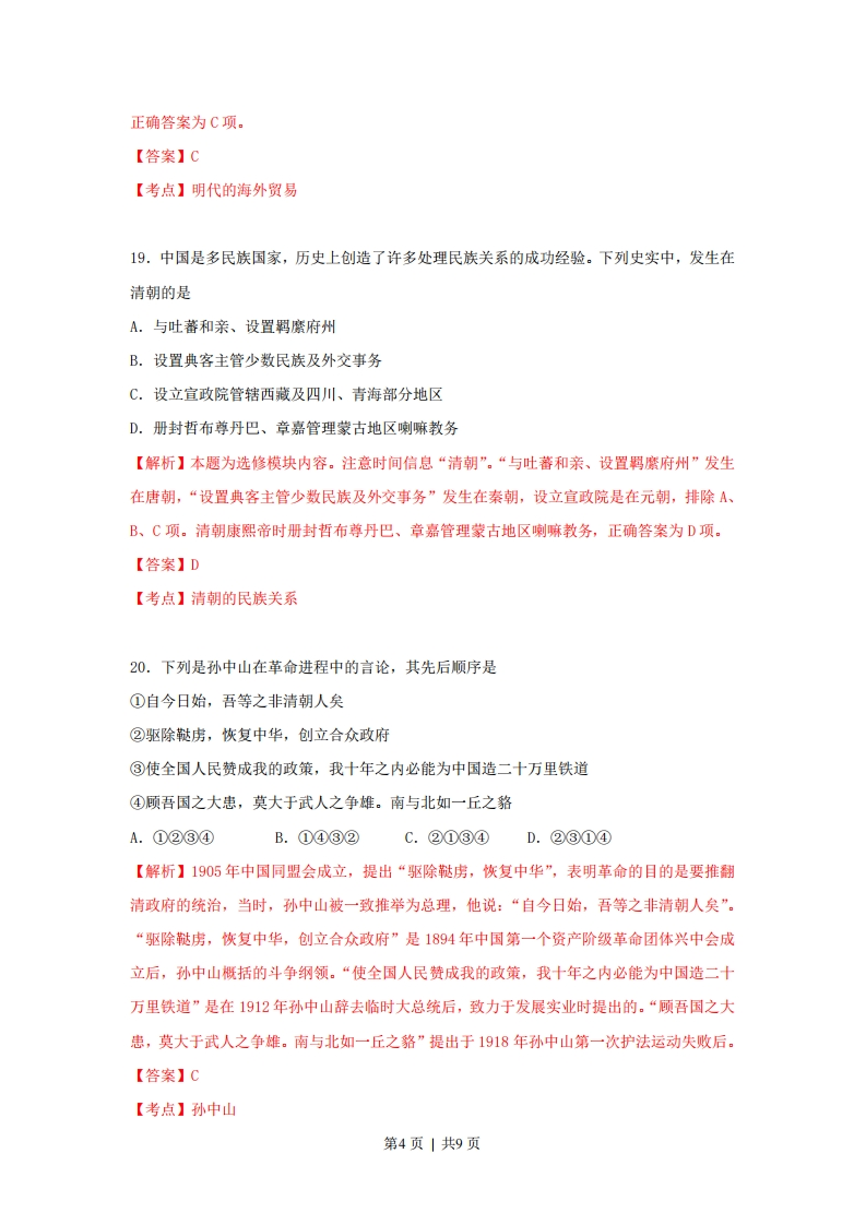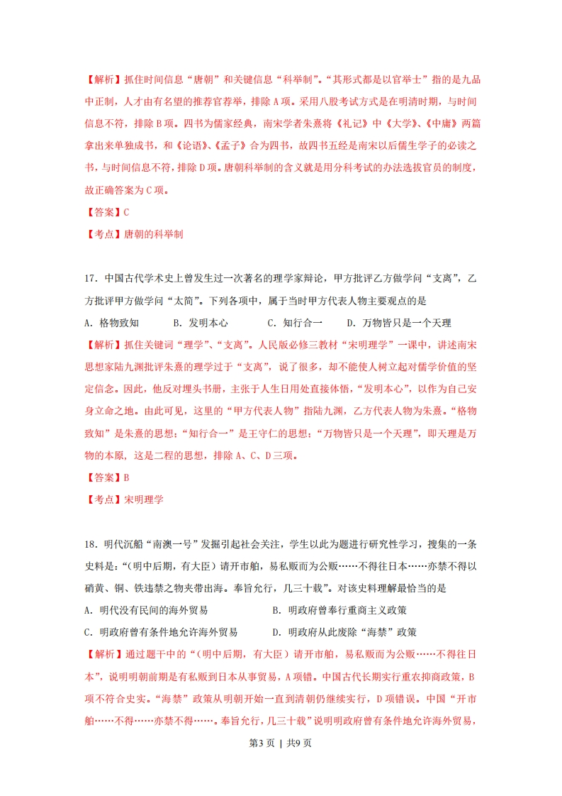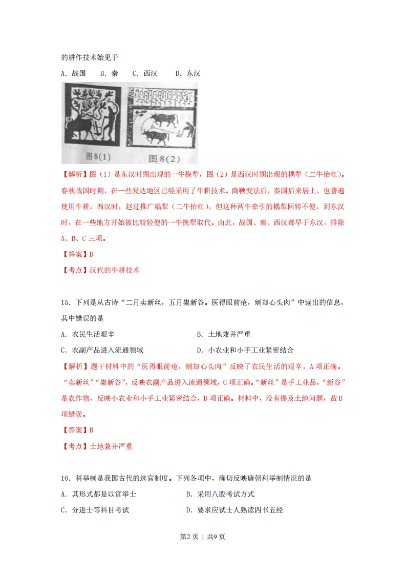 浙江省2010年文综(历史)解析12.论文的关键词对内容有着提纲挈领的作用。有一篇评价某历史人物的论文,关键词有“哲学家”“中庸之道”“逻辑学”等,该人物最有可能是A.孔子B.墨子C.普罗塔戈拉D.亚里士多德【解析】本题考查涉及必修模块和选修模块内容。在三个关键词中,孔子是中国古代哲学家,在协调“仁”和“礼”的关系上主张遵循中庸之道,符合其中两个方面,排除A项。墨子是中国古代哲学家,主张兼爱、非攻、尚贤、节俭,只符合其中一个方面,排除B项。普罗塔戈拉是古希腊著名哲学家,也是智者学派的代表人物,主要思想是“人是万物的尺度”,贝符合其中一个方面。亚里士多德是影响西方世界的伟大哲学家,在伦理学方面提出中庸理论,还创立了逻辑学,提出了著名的三段论,把逻辑学发展成为一门科学,所以D项为正确答案。【答案】D【考点】亚里士多德13.儒道思想犹如中国古代思想的双璧。下列言论中,最能体现道家因循自然、崇尚无为思想的是A.不以人助天B.制天命而用之C.天地不仁,以万物为刍狗D.天行有常,不为尧存,不为桀亡【解析】本题为最佳选择题。“制天命而用之”和“天行有常”是荀子的思想,排除B、D项。选项A出自庄子《南华经》,原文是“不以心损道,不以人助天”,意指上古时的有识之士顺应自然,不用自己的聪明智慧去破坏自然规律,或去影响自然,典型体现了因循自然、崇尚无为思想。“天地不仁,以万物为刍狗”出自《道德经》,“刍狗”指古代祭祀时用草扎的狗,在祭祀之前,人们对它敬若神明,祭祀一结束,就被丢弃了。这句话的意思是天地无所谓仁慈,它没有仁爱,对待万事万物就像对待刍狗一样,任凭万物自生自灭。主旨是建议人要效法天地的“无所谓仁,也无所谓不仁”的精神,养成这样的胸襟。【答案】A【考点】道家因循自然、崇尚无为思想14.农耕技术的发明与改进,推动了农业经济的发展。比较右侧两图,其中图8(1)所示第1页|共9页