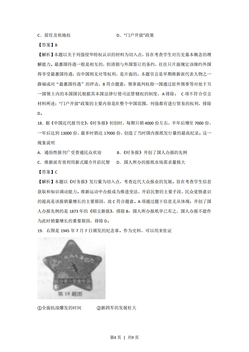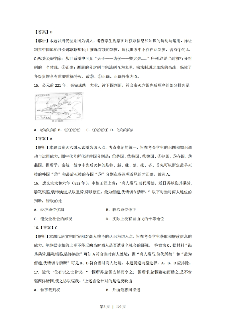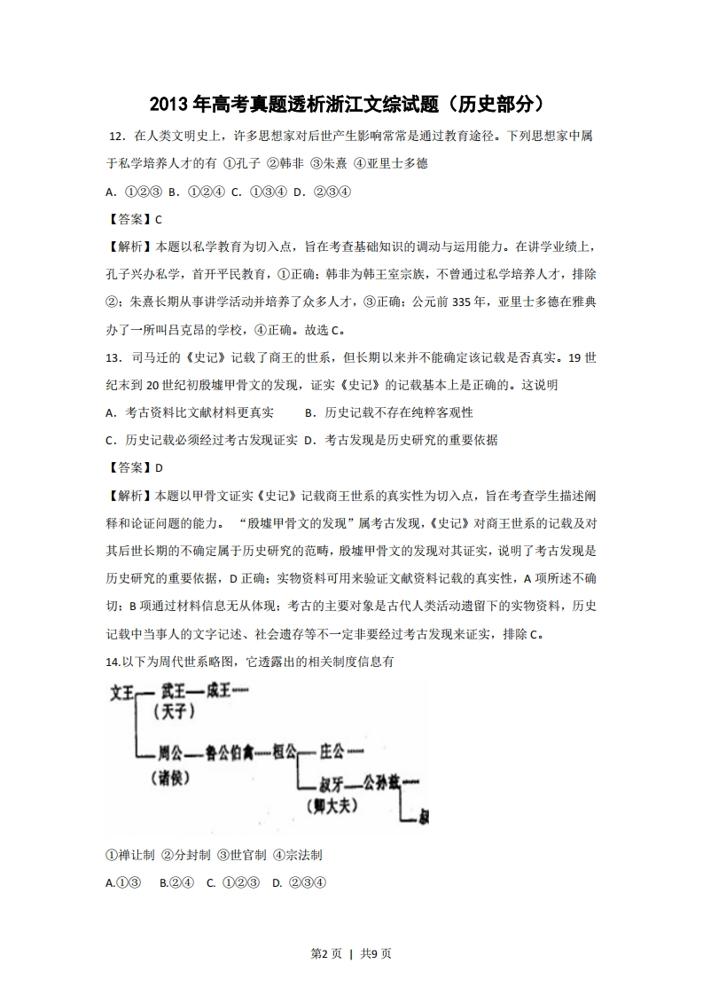 2013年普通高等学校招生全国统一考试(浙江卷)文科综合历史部分试题参考答案题号121314151617181920212223答案CDDABC938.(26分)(1)特点:以小农户个体经营为主。(2分)关系:农业经济为主,商品经济处于从属地位。(2分)变化:商品经济比较发达,(1分)纺织业显著发展,(2分)市镇经济繁荣,(1分),资本主义萌芽。(2分)(2)自然经济加速解体:(3分)农产品商品化,受到世界市场的影响:(2分)农业经济与商品经济的关系发生变化。(2分)(3)给中华民族带来灾难。(2分)但使原有经济结构遭到破坏,社会经济出现新成分:(2分)洋务企业、民族资本企业创办,民族工业兴起:(3分)中国经济被卷入世界市场39.(26分)(1)文艺复兴,把人性从宗教的束缚中解放出来:宗教改革,将人们从神权的的统治中解放出来:光荣革命,英国向君主立宪制转变。(2)经济生产力极大提高资产阶级革命爆发,西方民主政治开始确立:马克思主政治主义诞生:开创无产资级革命新时代文化理性与自由平等思想发展:浪漫主义和现实主义兴起社会城市化加快:无产阶级开始显示伟大力量生态生态环境遭到破坏(3)赞成①“主要是中国落后了”。理由:时代在演变,而中国占主导地位的仍然是专制主义、小农经济和“天朝上国”的保守观念。赞成②主要是“西方腾飞”。理由:西方经过一系列变革,取得突飞猛进的发展。跟西方拉大差距的,不仅有中国,还有其他东方国家。赞成③主要是“中国落后的同时,西方腾飞了”。理由:差距的拉大要考虑双方的因素,西方经过一系列变革,生机勃勃。中国基本依然故我。第1页1共9页