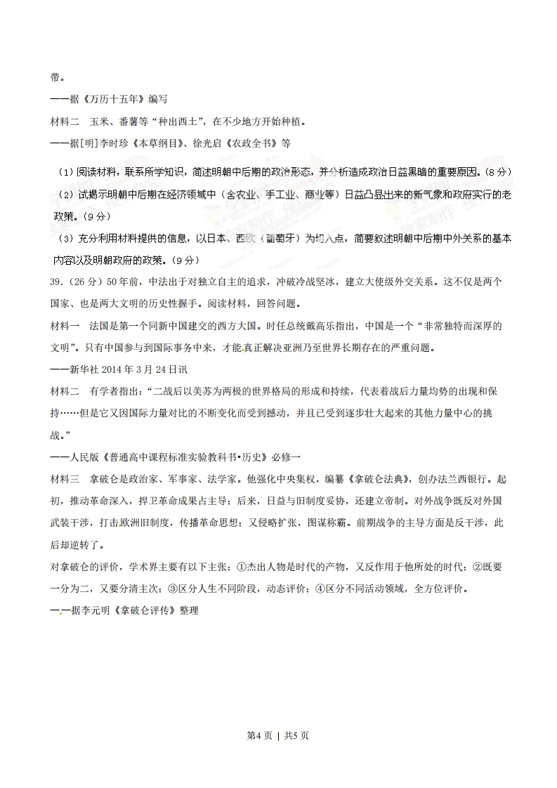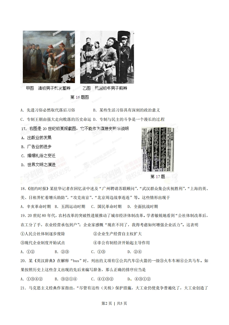 2014年浙江文综历史试题12.如何对待物质需求,东西方思想家中有的认为“放纵自己的欲望是最大的祸害”,有的甚至提出“去人欲”:也有的针锋相对:“穿衣吃饭,即是人伦物理”。下列人物中,明确表达上述主张的有①苏格拉底②亚里士多德③朱熹④李贽A.①②③B.①②④C..①③④D.②③④l3.有学者认为,中国的瓷器(china)深受世界人民喜爱,所以,中国被称为China。更有学者指出,China是“秦”的音变(Qin→Chin-a)。解决这个问题的关键是A.在考古学上取得突破,找到有说服力的证据B.利用计算机等先进科技手段,进行广泛调查,得出科学结论C.调查中外著名历史学家意见,用民主方式解决这一学术问题D.弄清最早用China称呼中国者先获悉了“秦”还是“瓷”的信息14.下列是宋、元、民国、当代编纂的浙江地方志及其部分目录,这些地方志按先后排列是①《山阴志》选举、书院、学堂、新军、警察②《临安志》宫阙、宗庙、三省、台阁、禁军、科举、坊市职官考(府州官员)、学校考(本路蒙古学、本路儒学)③《四明志》④《绍兴志》科学技术、报刊、文物古迹、名家学术思想A.①②④③B.②③①④C.③①②④D.③①④②15.清末某著名官员谈到铁路修建时说:“内开未尽之地宝,外收已亏之利权。是铁路之利,首在利民,民之利既见,而国之利因之。利国之大端,则征兵转的是矣.”这一言论的含义是A.“求富”“自强”B.“师夷长技”C.“中体西用”D.“民生主义”16.从甲图到乙图,表明第1页|共5页