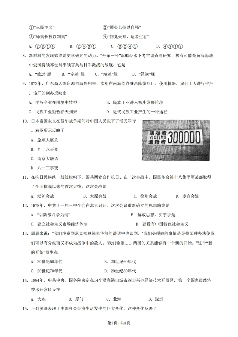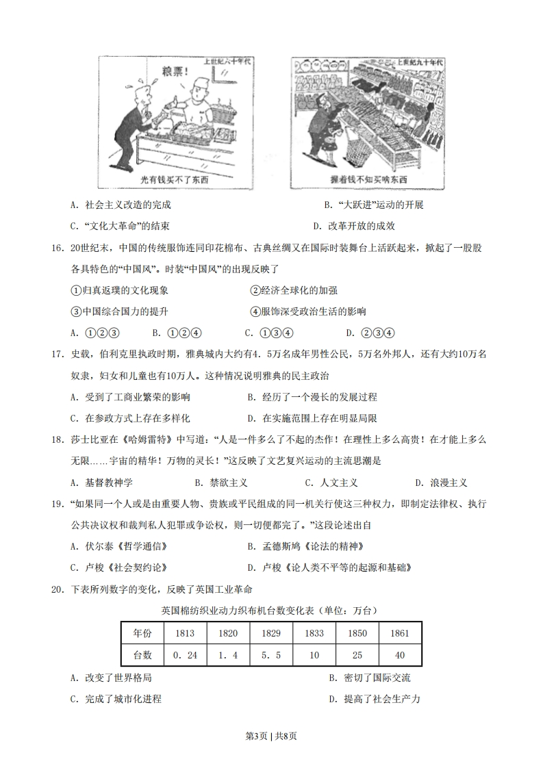 2015年10月浙江省普通高中招生选考科目考试历史试题选择题部分一、选择题(本大题共30小题,每小题2分,共60分。每小题列出的四个备选项中只有一个是符合题目要求的,不选、多选、错选均不得分)1.周灭商后,以崭新的政治风格实行统治,“由是天子之尊,非复诸侯之长,而为诸侯之君。”形成这种政治风格的制度基础主要是A.宗法制B.分封制C.郡县制D.察举制2.据古罗马学者记载,“中国产丝,织成锦绣文绮、运至罗马.裁成衣服,光辉夺目,人工巧妙达到极点。”这种现象的出现是因为A.汉代纺织技术发达,产品远销地中海地区B.绒棉、织金绒、天鹅绒等纺织品流行C.唐代丝织品经丝绸之路输至欧洲D.黄道婆改进织造技术3.右图是中国古代的文人画。下列各项中,不符合该画艺术形式特点的是A.强调个性表现B.追求抒情写意C.融多种艺术为一体D.须逼真墓写自然景物4.唐朝出现了结构更为完备,可根据实际需要,改变牵引点高低,控制耕土深浅的农业生产工具。它是A.耦犁B.曲柄锄C.曲辕犁D.翻车5.有人评论一位古代文学家的词作:“慷慨纵横,有不可一世之概...能于剪红刻翠之外,屹然别立一宗。”下列人物,符合这一评论的是A.李白B.柳永C.李清照D.辛弃疾6.“某今说个知行合一,正是对病的药,又不是某凿空杜撰,知行本体原是如此。”语出一位著名思想家。他生活在A.北宋B.南宋C.明代D.清代7.中国近代思想的演进“既不是一江长流,也不止一个洪峰,而是以一个接一个思潮的涨落相继出现的。”下列思潮按其先后顺序排列,正确的是第1页|共8页