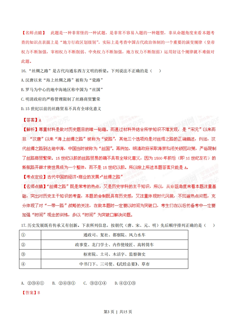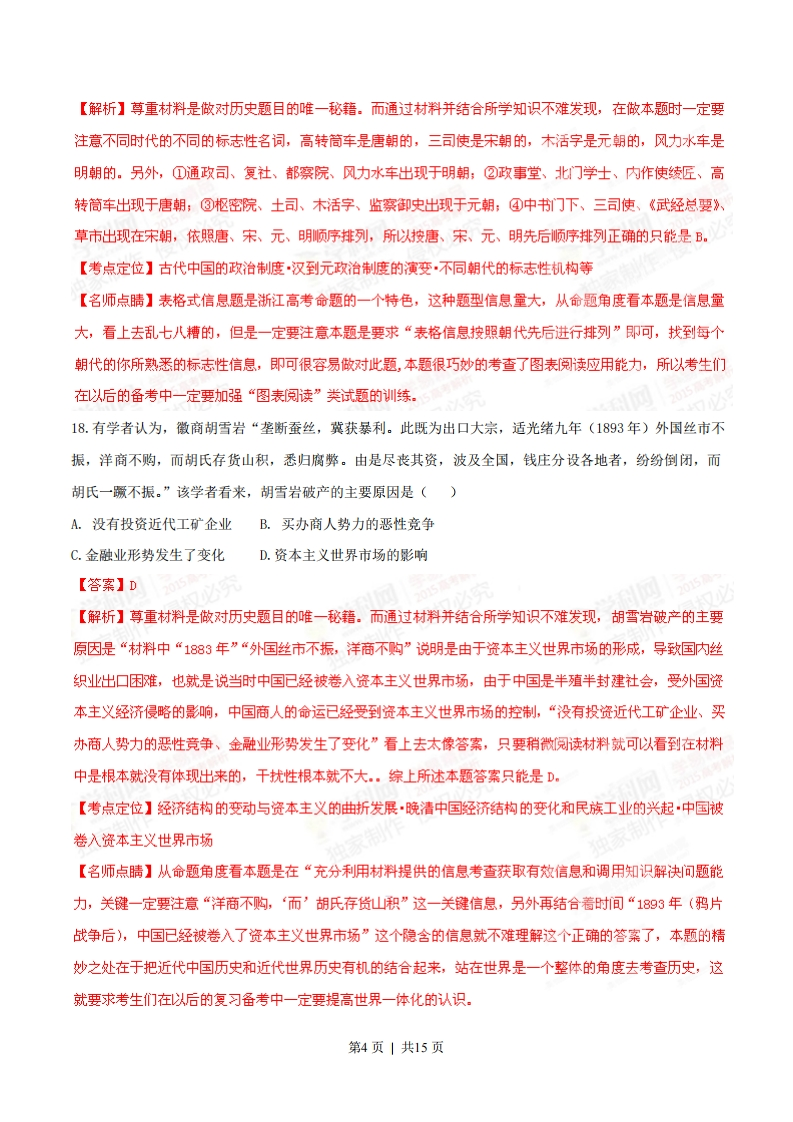 2015年浙江文综历史(含自选模块)解析(精编版)一、选择题(每题4分,共12题,48分)12.宇宙是人生永恒的话题。中外思想家有的认为“宇宙便是吾心”,有的提出“万物始于水”,有的“心外无物”。明确提出上述观点的人物有()①陆九渊②塞内卡③王守仁④泰勒斯A.①②③B.①②④C.①③④D.②③④【答案】C【解析】尊重材料是做对历史题目的唯一秘籍。而通过材科并结合所学知识不难发现,“宇宙便是吾心”是陆九渊的观点,“万物始于水”是泰勒斯的观点,“心外无物”是王守仁的观点,塞内卡是古罗马最重要的悲剧作家,他主张人们用内心的宁静来克服生活中的痛苦,没有明确提出题干中观点,塞内卡反对奴隶制度,主张“奴隶是人,他们的天性和其他人相同的”,其实本题非常简单,就是直截了当考查著名思想家的典型的主张,便于学生入题,综上所述本题答案只能是C,【考点定位】中国传统文化主流思想的演变宋明理学·王守仁等中外思想家的观点【名师点睛】本题继续延续浙江试卷自身的特点一一历史第一题仍然是考查中外思想家的思想成果。从命题的角度来看仍然是采取对比的方法,考查中外思想家的典型的思想观点,本题的难度是非常小的,重视基本知识点的考查,这就意味着考生们在以后的备考中一定要加强杰出思想家的“标志性的”思想观点的记忆、理解。13.武则天是学界和社会大众关注、热议的历史人物,墓前的无字碑引得千年评说。唐人史著对其事迹记载比较客观,宋明以来,在理学思想影响下史学家评价逐渐发生变化。下列说法中最为合理的是()A.史家主观认识影响史实客观评价B.历史人物评价永远难有定论C.多数人的意见更能反映历史真相D.时代愈近历史的评价愈客观【答案】A【解析】尊重材料是做对历史题目的唯一秘籍。而通过材科并结合所学知识不难发现,本题是在强调史家在理学思想影响下主观认识发生了变化,从而影响了对历史人物史实的客观评价。历史人物评价当然难有定论,但是并不能说是“永远难有定论”,历史真相的反映是依靠考古和历史文献的相互印证,历史真相并不取决于多数人的意见或者少数人的意见,并不能说“多数人的意见更能反映历史真相”,时代愈近历史的评价也并不一定就愈客观,历史评价与时代远近没有关系的,其实B、C、D三个选项本身也均是不符合历史唯物主义原理的。学科网第1页|共15页