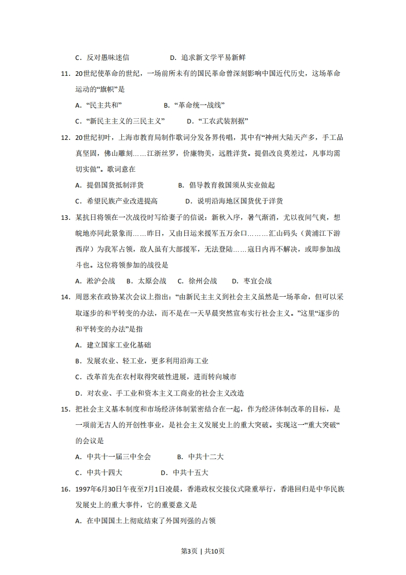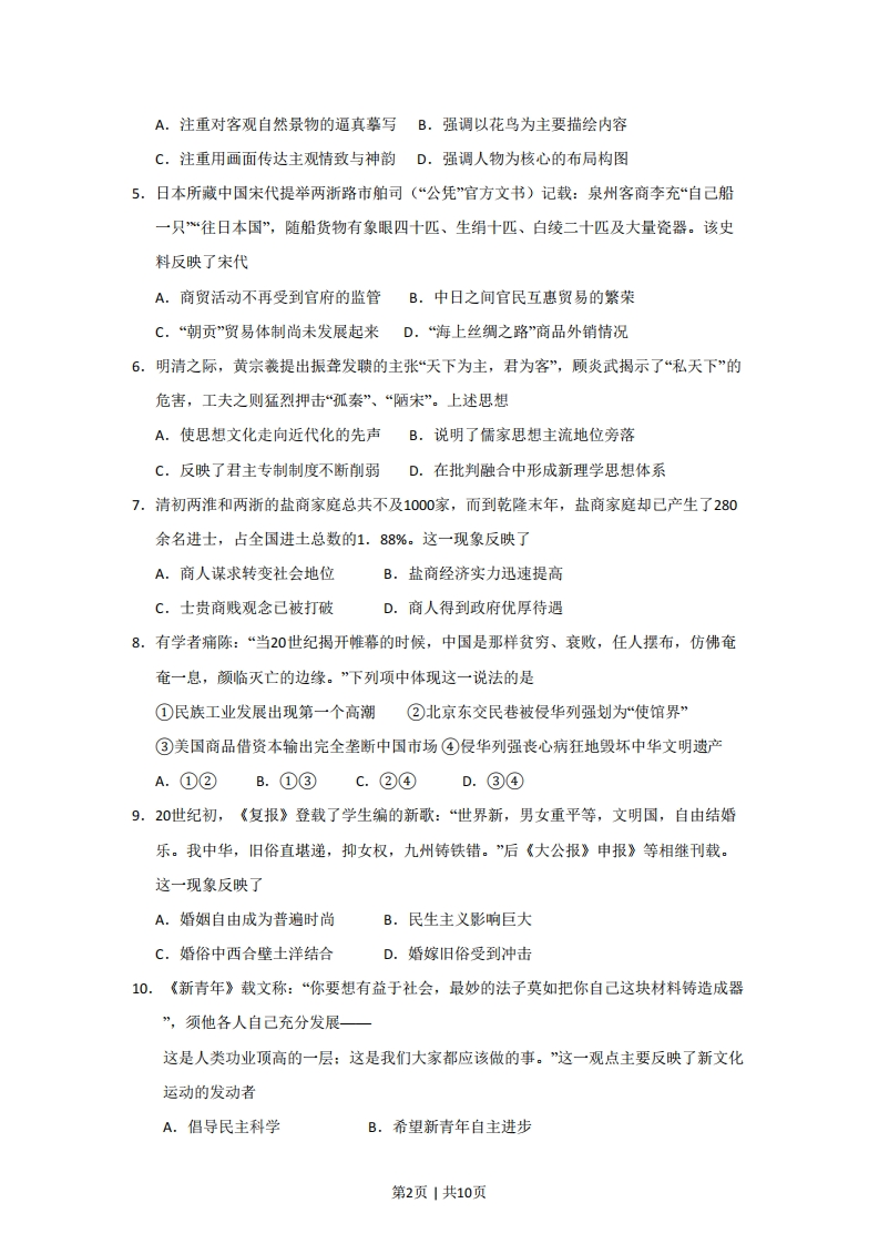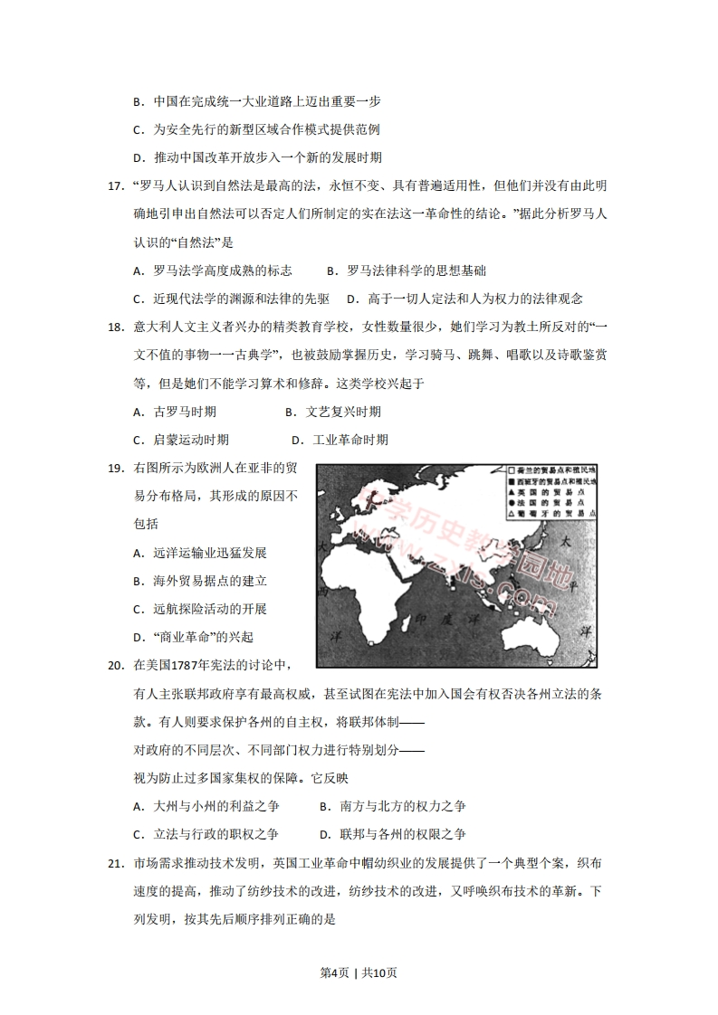 绝密★考试结束前2017年4月浙江省普通高校招生选考科目考试历史试题2017.4考生须知:1.本试题卷分选择题和非选择题两部分,共6页,满分100分,考试时间90分钟。其中加试题部分为30分,用【加试题】标出。2.考生答题前,务必将自己的姓名、准考证号用黑色字迹的签字笔或钢笔填写在答题纸上3.选择题的答案须用2B铅笔将答题纸上对应题目的答案标号涂黑,如要改动,须将原填涂处用橡皮擦净。4.非选择题的答案须用黑色字迹的签字笔或钢笔写在答题纸上相应区域内,答案写在本试题卷上无效。选择题部分一、选择题(本大题共30小题,每小题2分,共60分。每小题列出的四个备选项中只有一个是符合题目要求的,不选、多选、错选均不得分)1.中国农业从远古洪荒走来,经历了“刀耕火种”、“牛耕铁型等阶段。下列项中属于“刀耕火种阶段的耕作工具有①石斧②耧车③骨镰④曲柄锄A.①③B.①④C.②③D.②④2.谈到西汉的政权建设,史家常以“汉承秦制”作论。下列项中能体现该论断的是A.皇帝制与郡县制B.郡县制与刺史制C.皇帝制与封国制D.丞相制与刺史制3.中国古代典籍十分重视技术经验的总结。下列项中,同时介绍指南鱼和火药配方的是A.《抱朴子》B.《武经总要》C.《萍洲可肤》一D.《梦溪笔淡》4.北宋画家论及山水画的创作,提出春山烟云绵联,入欣欣:夏山嘉木繁阴,人坦坦:秋山明净摇落,人肃肃:冬山昏霾翳塞,人寂寂。”该认识反映的中国山水画的特征是第1页|共10页