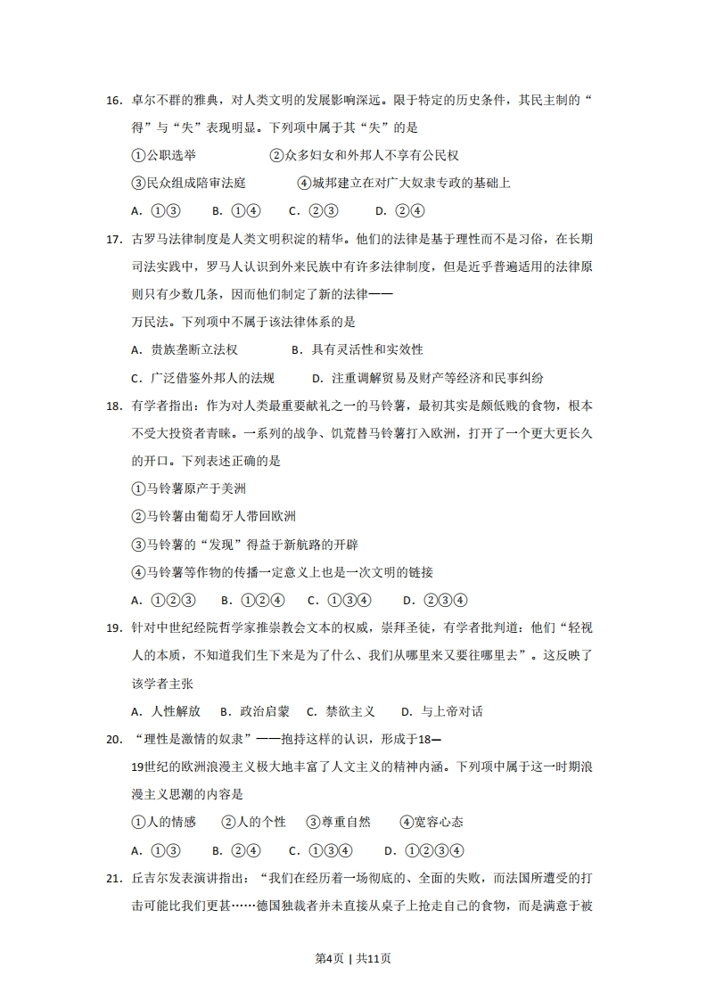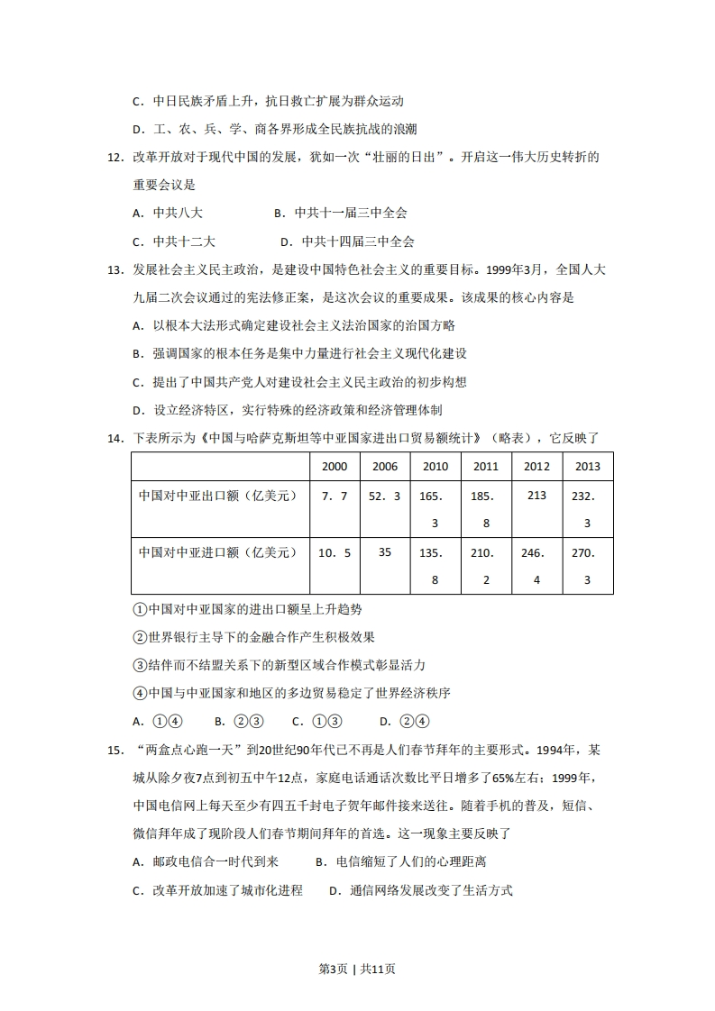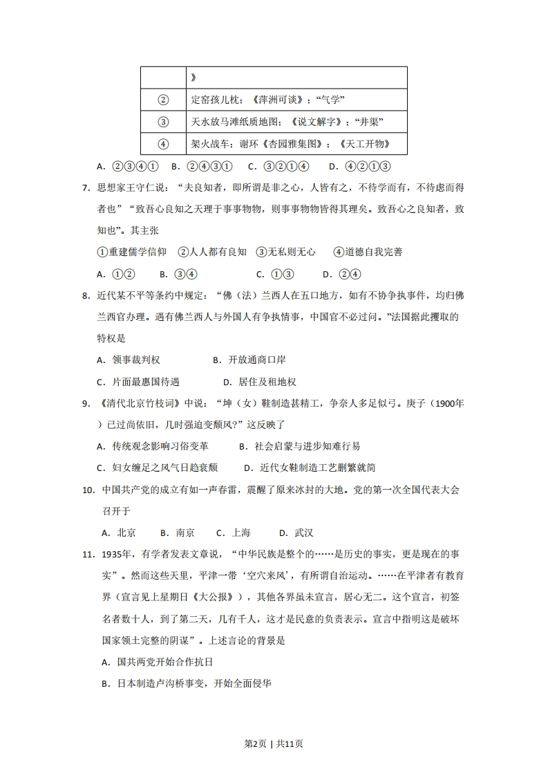 2018年4月浙江省普通高校招生选考科目考试历史试题本试题卷分选择题和非选择题两部分,共6页,满分100分,考试时间90分钟。其中加试题部分为30分,用【加试题】标出。选择题部分一、选择题(本大题共30小题,每小题2分,共60分。每小题列出的四个备选项中只有一个是符合题目要求的,不选、多选、错选均不得分)1.有学者在研究中国早期国家时注意到:周“克殷践奄,灭国数十,而新建之国皆其功臣昆弟甥舅,本周之臣子:而鲁卫晋齐四国,又以王室至亲为东方大藩。”这表明A.官僚体制成为当时社会的主宰B.素养不同的人享有同等的国家管理权C.以分封制构架国家垂直管理地方形式D.国家制度受到宗族血缘关系的明显影响2.先秦有思想家认为:“凡入国,必择务而从事焉。国家昏乱,则语之尚贤、尚同:国家贫,则语之节用、节葬”。这体现了A.民贵君轻的主张B.讲求实际功利的精神C.克己复礼的思想D.追求精神自由的倾向3.古诗有云:“岂料山中有遗宝,磊落如署万车炭(煤)..为君铸作百链刀,要斩长鲸为万段。”中国古代以煤作为燃料冶铁开始于A.战国B.西汉C.南北朝D.北宋4.有学者品鉴古代书艺谓:“书以晋人为最工,亦以晋人为最盛。晋之书,亦犹唐之诗、宋之词、元之曲,皆所谓一代之尚也。”晋代开始盛行并确立的书体是A.篆书B.隶书C.楷书D.行书5.元朝的大一统超迈前代,其疆域北踰阴山,西极流沙,东尽辽左,南越海表”。为实施有效管理,在全国分设十个行省。行省的设立旨在A.独立民政事务,调动地方政治自主性B.加强中央集权,调整中央与地方关系C.监察地方政治,加强中央对地方控制D.防范宰相擅权,提高中央政府行政效率6.中华文明源远流长,薪火相传,生生不息。文明传承不仅从未中断,而且内涵丰富。下表所列信息,按时序排列正确的是①转轮排字盘:《感天动地窦娥冤》:王祯《农书第1页1共11页
