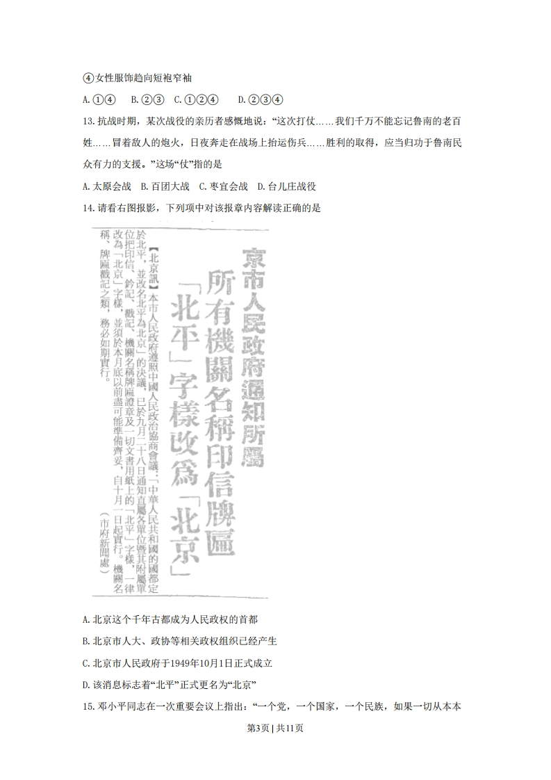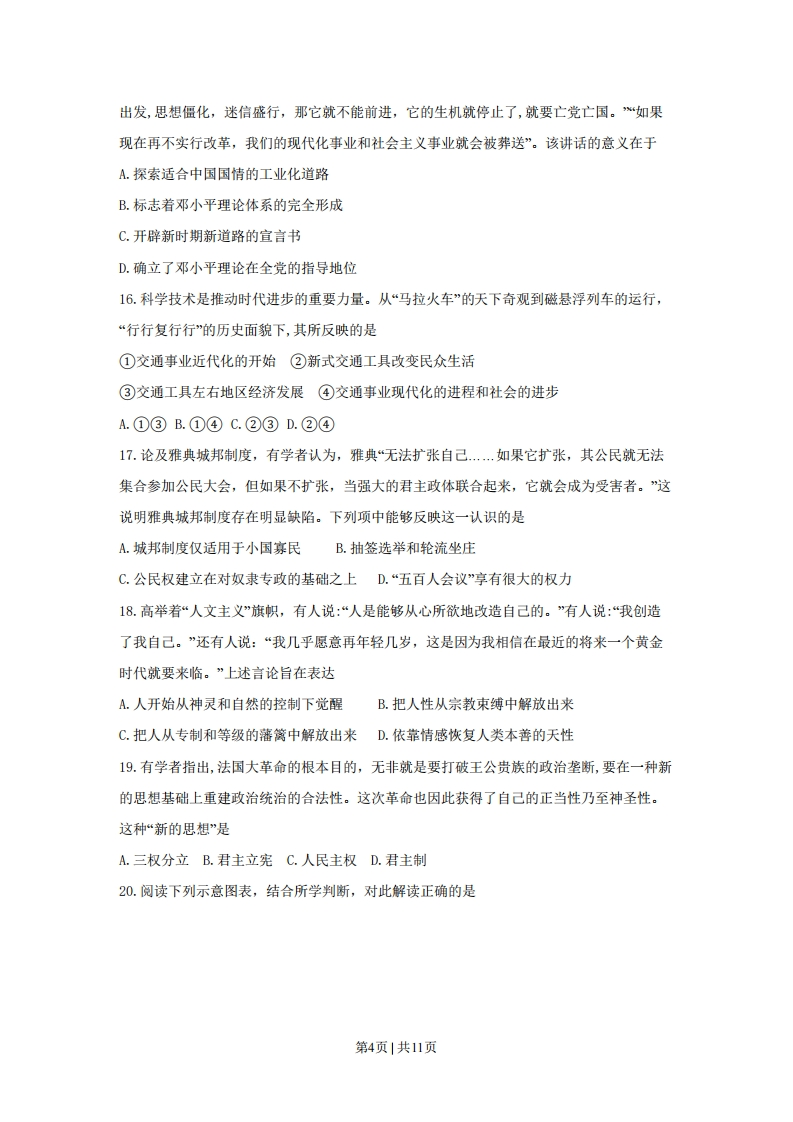 2019年4月浙江历史选考试卷一、选择题(本大题共30小题,每小题2分,共60分。每小题列出的四个备选项中只有一个是符合题目要求的,不选、多选、错选均不得分)1.研究公元前11世纪到公元前3世纪的中国史,史家选择了一些关键词进行分析,如分封制、宗法制、井田制、三公九卿制、郡县制,孔子、孟子、荀子等。据此判断,下列项中与之相符的是①政治制度较早走向完备和成熟②早期国家制度受到宗族血缘关系的明显影响③儒家思想较早进入比较成熟的阶段④比较成熟的农业技术和相对完备的农业管理A.①③B.②④C.①②③D.②③④2.中国是诗的国度,每一时期都有内涵深厚、风格新异的优秀作品问世,都有文辞隽永的诗句流传。下列诗句创作于战国时期的是A.“诗画本一律,天工与清新。”B.“虽萎绝其亦何伤兮,哀众芳之芜秽。”C.“文章憎命达,魑魅喜人过。”D.“长风破浪会有时,直挂云帆济沧海。”3.一说“chia”的发音源出唐朝时期的昌南(今景德镇)。唐朝昌南除出产青瓷之外,名列前茅的瓷器还有A.粉彩瓷B.黑瓷C.青花瓷D.白瓷4.“草市迎江货,津桥税海商”记录了唐朝民间商贸的景况。下列项中对其解读错误的是A.草市的作用己十分显著B.草市逐渐成为相对集中的地方商业中心C.草市己成为海外贸易的重要形式D.草市大多集中在水运方便的地方5.书法艺术是中华民族对世界的一大贡献,历经三千多年演化与进步,形成的主要字体是①甲骨文②行书③小篆④金文⑤隶书⑥草书⑦楷书A.②⑤⑦B.②③⑤⑥⑦C.①②③⑤⑦D.①②③④⑤⑥⑦6.顾炎武是读万卷书行万里路的大学者,他曾有诗云:“我愿平东海,身沉心不改。大海无平期,我心无绝时。”诗中所体现的情怀是A.“经世致用”B.“人心一点灵明”C.“循天下之公”D.“以天下之权,寄之天下之人”第1页共11页