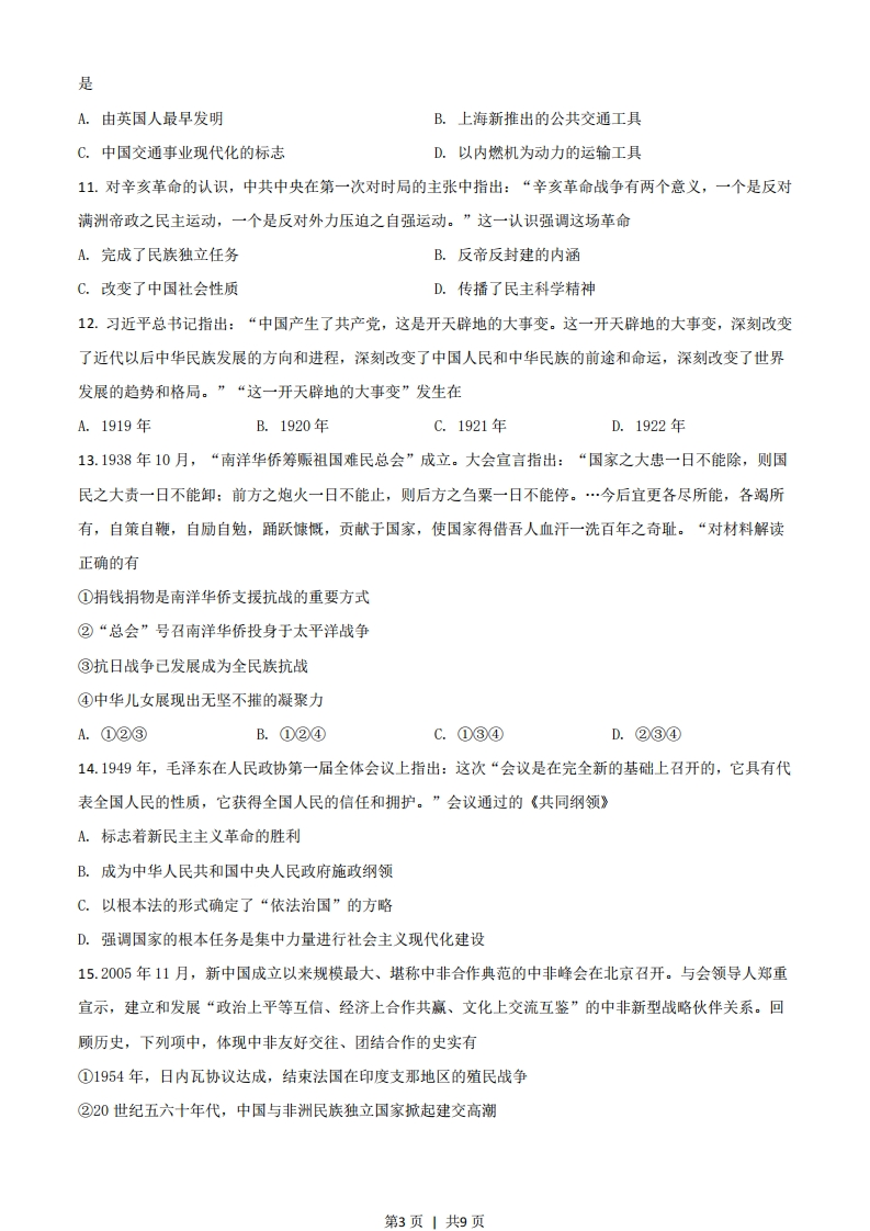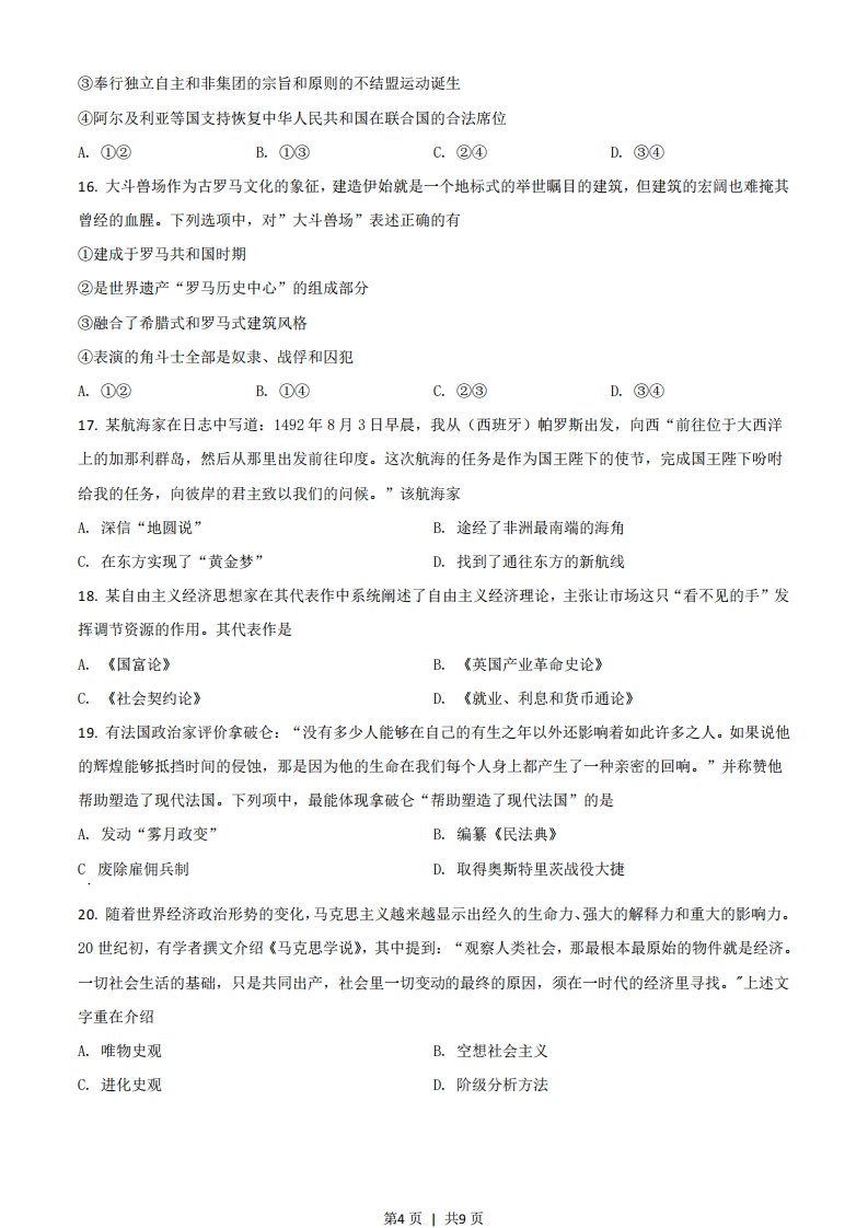 历史试题一、选择题1.翻检西周史,周王朝的最高首领称“王”,周王发表诰命时用“王曰”,或“王若曰”。周王又称“天子”,被视为天之元子,受天之命以君临人间。这反映出西周政治制度的特点是A.神权与王权的结合B.嫡庶子孙为天下大宗C.“天下为公”D.“郡”“国”并行2.秦兵马俑造型精美,比例匀称,神态逼真,威武雄壮的军阵生动再现了秦统一中国的磅醋气势。秦兵马俑大型艺术群塑体现了A.和当地的自然环境和谐地融为一体B.实用性与装饰性精确巧妙地结合C.鲜明的民本意识和高超的表现技巧D.高度概括和细腻写实的艺术手法3.中国是丝的国度,创造了灿烂辉煌的丝绸文明。至汉,纺织技术己经相当发达。在某汉代考古遗址发现有一件素纱禅衣,重量仅49克。识图(下为汉代局部示意图)判断,该遗址位于A.①B.②C.③D.④4.《汉书》称颂汉武帝:“雄材大略…虽《诗》《书》所称,何有加焉!”他在位期间A推行科举制B.令各郡国建立学校C.不改汉初的休养生息政策D.重新确立儒学为正统思想5.唐代书法在风格上兼容南北,达到一个新高度。其中,由欧阳询、颜真卿、柳公权创立的欧体、颜体和柳体等书法字体,被后世学习与临墓。他们自创一格的“书法字体”属于A.小纂B.隶书C.楷书D.草书6.宋代曾规定:“市舶司监官及知州、通判等,今后不得收买蕃商杂货及违禁物色。如违,当重置之法。第1页1共9页