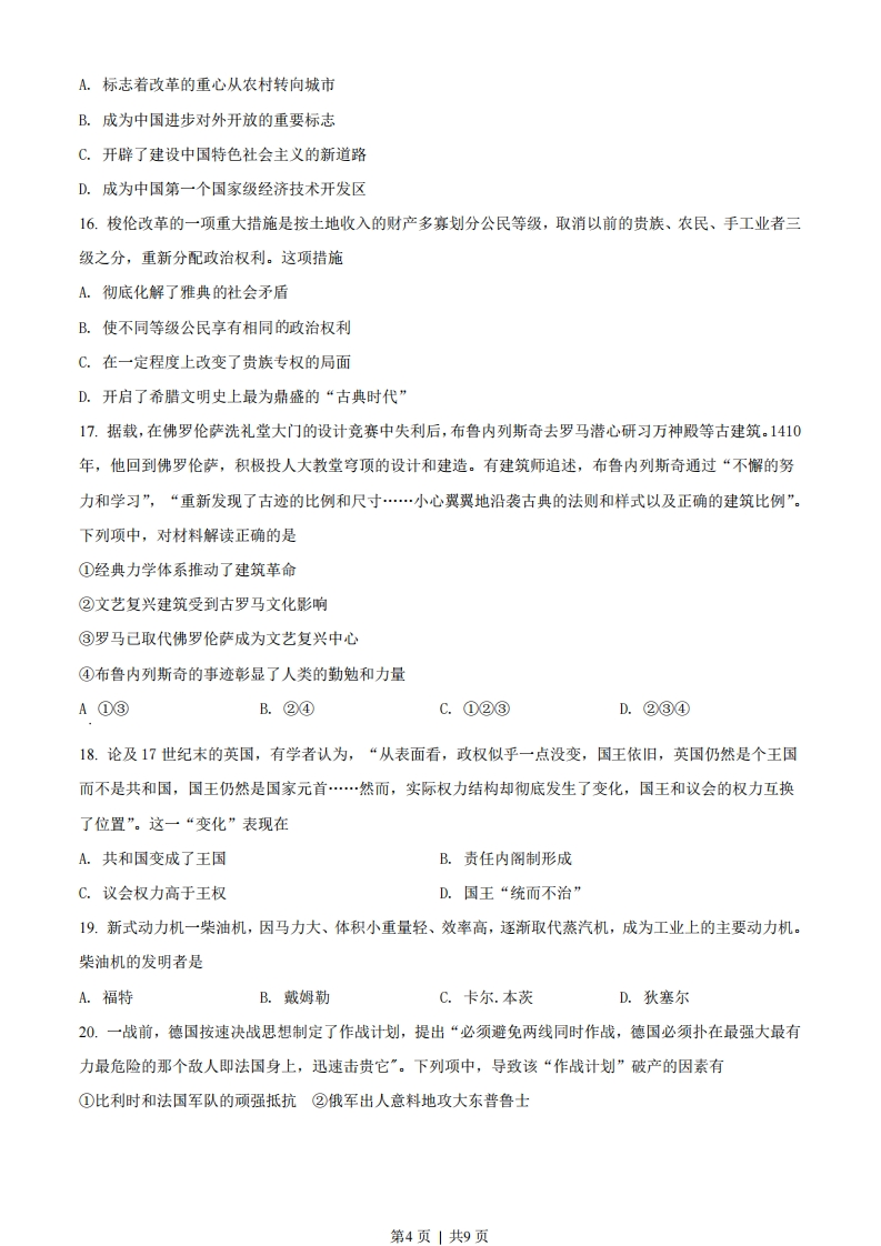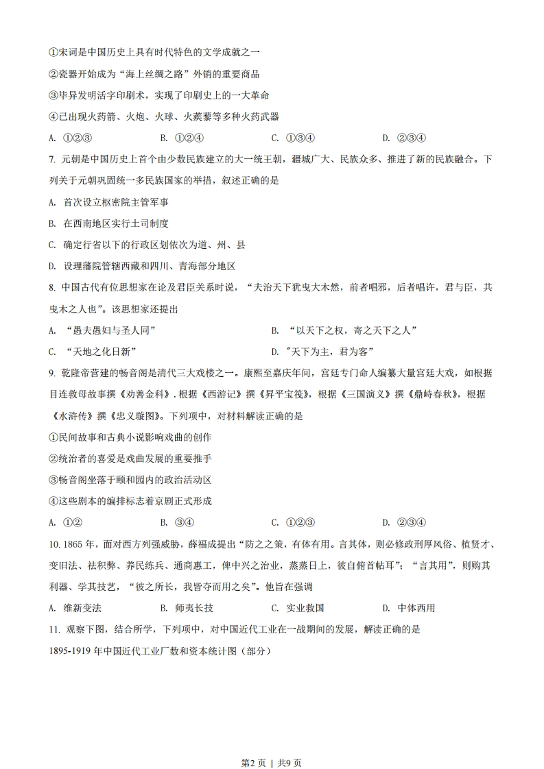 历史试题一、选择题1.论及周王朝的统治模式,有学者指出,周王是家族中嫡长子一脉的首领,代表整个家族祭祀上天:诸侯国君主的排序反映了他们与周王嫡长子一脉的亲疏关系。下列项中,对这一“统治模式”解读正确的是①神权与王权结合②中央对地方实行垂直管理③以血缘关系为纽带形成国家政治结构④标志着中国开始迈入早期国家起源的历史阶段A.①②B.①③C.②④D.③④2.孔子整理编订的古代文化典籍《诗》《书》《礼》《乐》《易》《春秋》,除《乐》毁于秦火,其他五部经典传承至今,奠定了中国封建社会传统政治的理论基础,也成为中国古代传统文化的核心内容。下列关于五经的表述,不正确的是A.汉武帝推崇儒学,设五经博士B.《诗》奠定了中国文学浪漫主义传统的基础C.五经等儒学经典后来成为科举考试的重要内容D.吐蕃赞普松赞干布派贵族子弟到内地学习《诗》《书》3.汉代科学家王充曾介绍一种指向仪器,样子如同一只圆底的勺。它在平滑的盘上自由旋转,静止的时候,勺柄就会自然指向南方。这种指向仪器是A.司南B.指南鱼C.指南龟D.支撑式指北罗盘4.汉武帝置十三州部,每州部设刺史一人。刺史定期在辖区内巡行,年终赴京奏事。刺史秩仅600石,但能以卑临尊,监察秩2000石的郡太守和王国相。由此可知,西汉刺史的设置A.可以弥补宰相才干不足的缺陷B.有利于加强中央对地方的控制C.是地方行政体制建设的重要内容D.代表着社会履行监察官员的职能5.唐初,三省长官是当然的宰相,他们常在政事堂共商国家大事。后来,皇帝又时而指定某些级别略低的官员参加政事堂会议,这些人事实上己加入宰相集团。会议所作决策以文字形式报皇帝批准,付外执行。皇帝此举的主要目的是A.调整好中央与地方的关系B.将知识分子引入统治集团C.集思广益以减少决策失误D.分散相权以强化君主权力6.宋代经济文化高度发达。有外国学者曾这样评价十三世纪的中国:“在社会生活、艺术、娱乐、制度、工艺技术诸领域,中国无疑是当时最先进的国家。”下列关于来代史事的表述,正确的是第1页」共9页