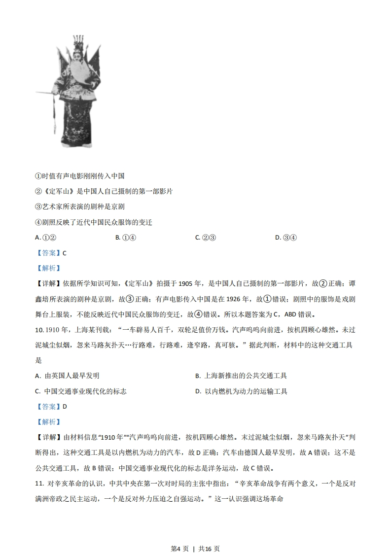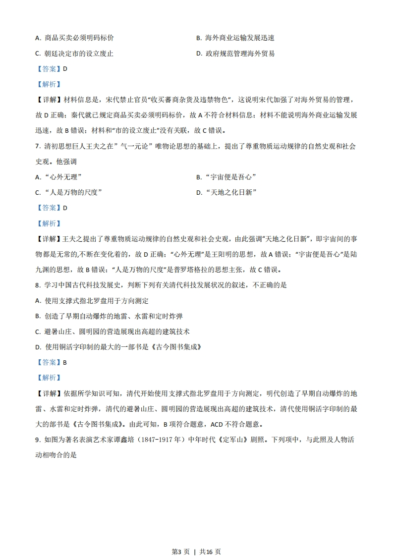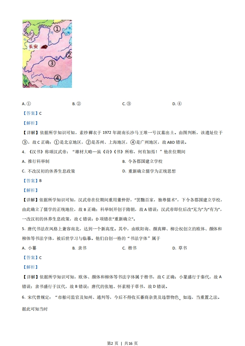 历史试题一、选择题1.翻检西周史,周王朝的最高首领称“王”,周王发表诰命时用“王曰”,或“王若曰”。周王又称“天子”,被视为天之元子,受天之命以君临人间。这反映出西周政治制度的特点是A.神权与王权的结合B.嫡庶子孙为天下大宗C.“天下为公”D.“郡”“国”并行【答案】A【解析】【详解】周王发表诰命时用“王曰”,周王又称“天子”,受天之命以君临人间。这反映出西周神权与王权相结合的特点,故A正确:西周嫡长子孙为天下大宗,故B错误“天下为公“指的是禅让制,故C错误:“郡”“国”并行是在汉初,故D错误。2.秦兵马俑造型精美,比例匀称,神态逼真,威武雄壮的军阵生动再现了秦统一中国的磅璃气势。秦兵马俑大型艺术群塑体现了A.和当地的自然环境和谐地融为一体B.实用性与装饰性精确巧妙地结合C.鲜明的民本意识和高超的表现技巧D.高度概括和细腻写实的艺术手法【答案】D【解析】【详解】由材料信息“秦兵马俑造型精美,比例匀称,神态逼真,威武雄壮”可知,秦兵马俑大型艺术群塑体现了高度概括和细腻写实的艺术手法,故D正确:材料信息无法体现和当地的自然环境融为一体,故A错误:兵马俑不能体现实用性,故B错误:“民本”主要表现为重民、贵民、安民、恤民、爱民等,材料没有民本意识的信息,故C错误。3.中国是丝的国度,创造了灿烂辉煌的丝绸文明。至汉,纺织技术己经相当发达。在某汉代考古遗址发现有一件素纱禅衣,重量仅49克。识图(下为汉代局部示意图)判断,该遗址位于第1页|共16页