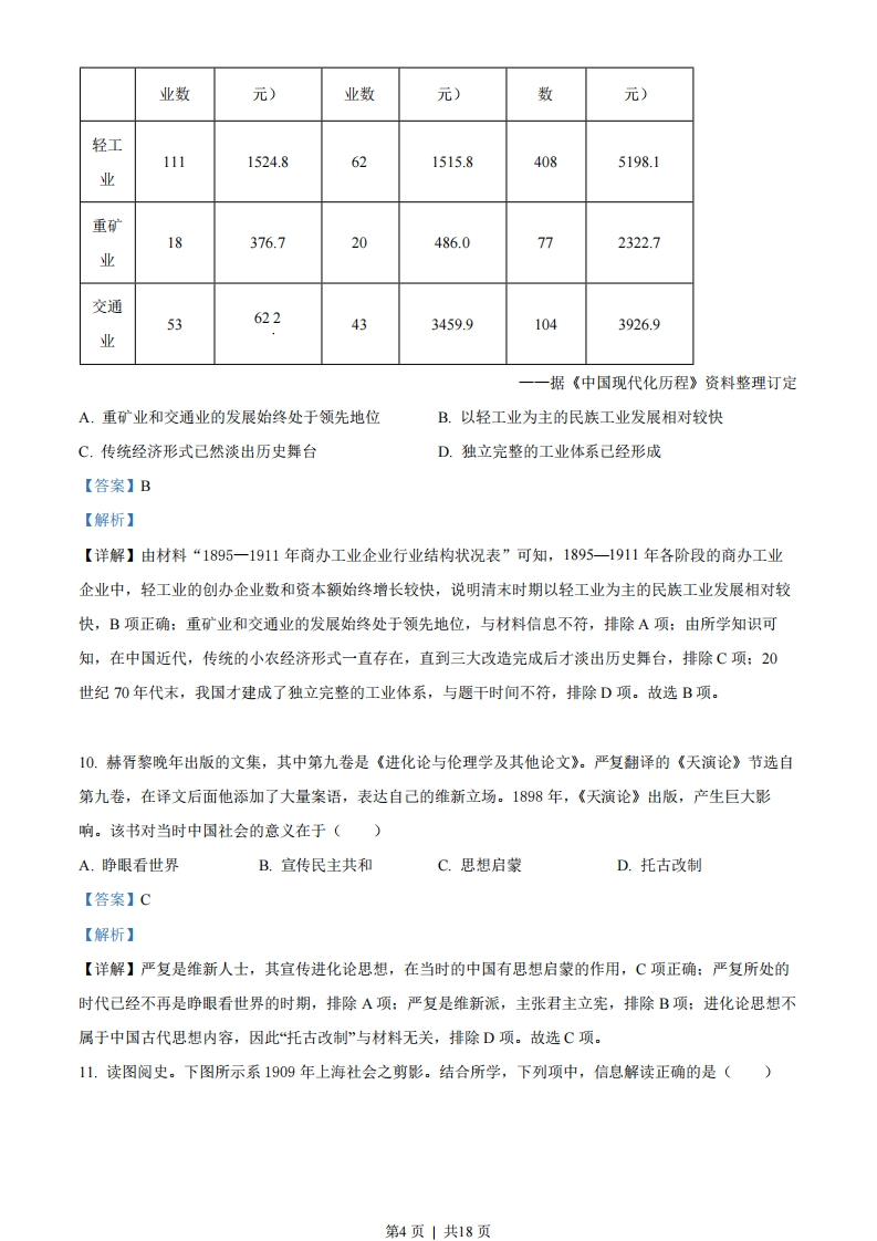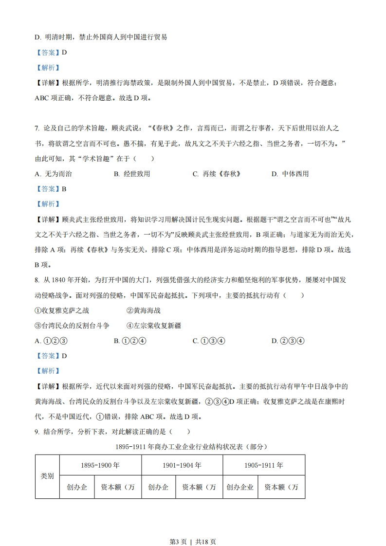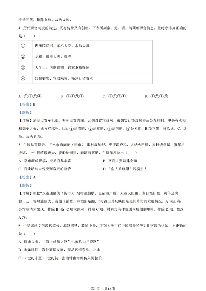 历史试题一、选择题(本大题共25小题,每小题2分,共50分。每小题列出的四个备选项中只有一个是符合题目要求的,不选、多选、错选均不得分)1.谈及个人的政治抱负和所心仪的时代,孔子说:“周监于二代,郁郁乎文哉!吾从周。”下列项中,与孔子“从周”相关的是()A.“封建亲戚,以蕃屏周”B.“海内为郡县,法令由一统”C.“罢黜百家,独尊儒术”D.“上品无寒门,下品无世族”【答案】A【解析】【详解】“从周”是指孔子推崇的主张周代的礼制,维护有序的等级秩序,“封建亲戚,以藩屏周”是周代的分封制,维护了等级秩序,A项正确:“海内为郡县,法令由一统”是战国以后的郡县制,排除B项:“罢黜百家,独尊儒术”是西汉董仲舒的儒学独尊主张,排除C项:“上品无寒门,下品无世族”涉及魏晋时期的九品中正制,排除D项。故选A项。2.“长太息以掩涕兮,哀民生之多艰”,出自一首政治抒情长诗。作者毕生追求“美政”,其作品充满对家国的炽热情感和深切忧念。他是()A.墨子B.韩非C.屈原D.杜甫【答案】C【解析】【详解】根据材料“长太息以掩涕兮,哀民生之多艰”并结合所学可知其出于文学作品《离骚》,属于屈原的作品,他的作品充满对家国的炽热情感和深切忧念,C项正确:墨子代表中下层平民的利益,与毕生追求“美政”不符合,排除A项:韩非代表法家,主张严刑峻法,排除B项:杜甫的文学作品是唐诗,与材料信总不符合,排除D项。故选C项。3.中国是纸的发明地,敏惜字纸是中华民族的传统美德。经过考古工作者的不解努力,目前己知书写用纸的发明可能是在(A西汉B.唐代C.北宋D.元代【答案】A【解析】【详解】由所学知识可知,考古学家在西安灞桥、甘肃天水、敦煌等地几次发现了西汉时期的麻纸,有的纸上面还有文字和地图,这证明在西汉时己出现书写用纸,A项正确:考古发掘表明,目前己知书写用纸的发明可能出现在西汉时,而非唐代和北宋,排除B项、C项:目前己知在西汉时可能己产生书写用纸,第1页|共18页