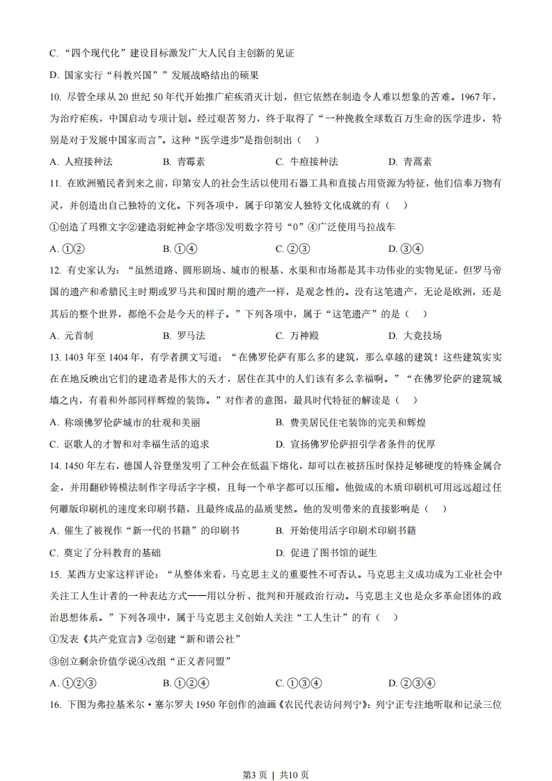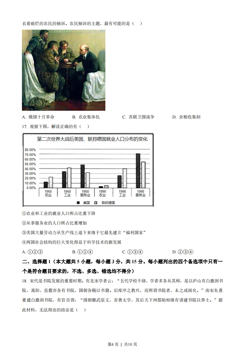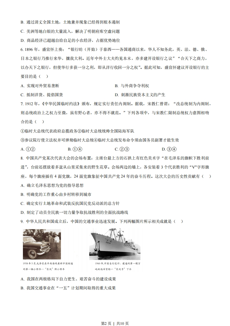 历史试题一、选择题1(本大题共17小题,每小题2分,共34分。每小题列出的四个备选项中只有一个是符合题目要求的,不选、多选、错选均不得分)1.2019年7月,中国“良渚古城遗址”被列人《世界遗产名录》。良渚古城遗址代表了五千多年前中国史前稻作文化的伟大成就,也是早期城市文明的杰出典范,实证了中华五千年文明史,是中华民族的瑰宝,也是全人类共同的文化遗产。下列关于良渚古城遗址的表述,正确的有()①属于夏文化的遗存②己有私有制产生的实证③出土了精美的玉器④出现较大规模的祭坛和神庙A.①②③B.①②④c.①③④D.②③④2.生产工具的进步是生产力发展的重要标志。河南辉县出土的战国铁犁铧,人们耕地时把它安装在犁上,用来破土,省力易行。据此可知,战国时期()A.铁犁铧用灌钢法制成B.中国人率先掌握了治铁技术C.铁农具己经在农业生产中使用D.铁犁牛耕已经成为农业的主要耕作方式3.汉武帝派造张骞两次出使西域,开辟了中西交通道路,大大促进了西域与中原的联系。之后,诸多朝代在这一区域设置机构或派驻官员,加强管辖。图中①②③处填写正确的是()西域都护府1北庭都护府言慰司③十西汉朝元朝清潮A.①护乌桓校尉②单于都护府州③伊犁将军B①安西都护府②北庭都元帅府③伊犁将军C.①护乌桓校尉②北庭都元帅府③西宁办事大臣D.①安西都护府②单于都护府③西宁办事大臣4.延载元年(694)八月敕:“诸户口计年将入丁、老、疾、应免课役及给侍者,皆县亲貌形状,以为定簿。一定以后,不得更貌。疑有奸欺者,听随事貌定,以付手实。”这种户籍管理办法是()A.黄籍登记B.白籍土断C.貌阅之法D.诸色户计5.明万历九年(1581),张居正在全国推行一条鞭法,实行赋役合并,一概折银,这是中国赋役制度上的重大变革。下列各项中,对张居正推广一条鞭法前所处的经济状况,表述正确的是()A.白银己逐渐成为国家财政和民间交易的基本支付手段第1页」共10页