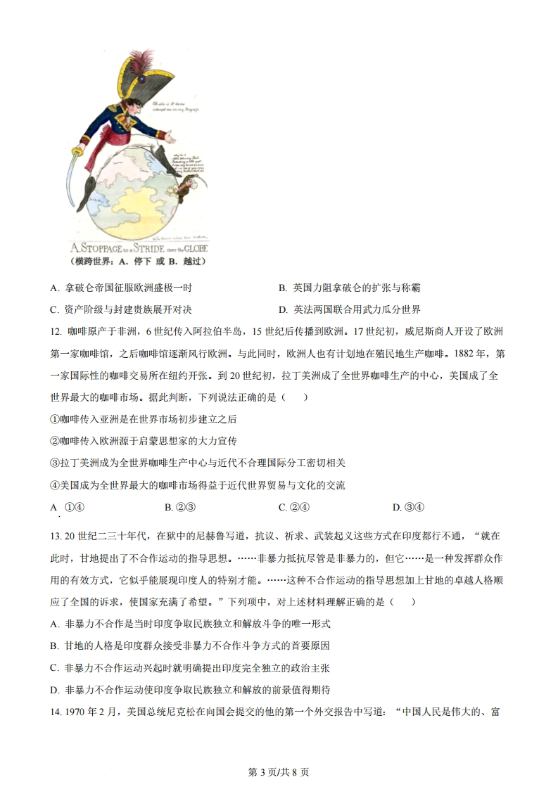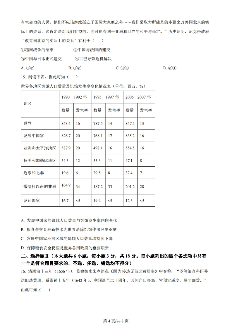 浙江省2024年1月普通高校招生选考科目考试历史试题第I卷一、选释题1(本大题共15小题,每小题2分,共30分。每小题列出的四个备选项中只有一个是符合题目要求的,不选、多选、错选均不得分)1.中华文明是人类最古老的文明之一。早在新石器时代,先民们就创造了丰富的物质和精神文化。这一时期()A.种植粟和水稻,掌握养蚕缫丝技术B.邦国林立,早期国家形成并发展C.先后出现精美玉器、青铜器和铁器D.氏族成员平等,未出现阶级分化2.文化是民族的血脉。中华优秀传统文化源远流长,博大精深。下列项中,由老子提出且体现朴素唯物观的是()A.“大道之行也,天下为公”B.“天行健,君子以自强不息”C.“天行有常,不为尧存,不为桀亡”D.“人法地,地法天,天法道,道法自然”3.1896年,法国某考察团进入四川,留下了记载:“在彭山县进入了令人赞叹的成都平原一一它遍地庄稼,人口稠密…繁荣富庶,令人难以置信,其中一个重要因素就是当地人充分领悟、广泛使用的灌溉体系。”这一“灌溉体系”得益于()A.都江堰的修建B.芍破的兴建C.郑国渠的兴修D.灵渠的开凿4.史载:“(西)汉成帝初置尚书五人,其一人为仆射,四人分为四曹:常侍曹(主公卿),二千石曹(主郡国二千石),民曹(主凡吏民上书),客曹(主外国夷狄)。后又置三公曹(主断狱),是为五曹。”由此可知()A.尚书台正式确立为新行政中枢B.汉成帝开始设立中朝削弱相权C.尚书各曹掌握朝廷的重要职能D.尚书仆射控制中朝威胁到皇权5.据《通典》记载,西汉末人口约6000万,历经700余年之发展,至唐中期鼎盛的天宝年间,人口约5300万,才大体接近西汉末的数字。关于造成这种现象的主要原因,下列说法中,正确的是()A.生产工具、技术长期停滞不前B.政局长期动荡、战乱频繁C.疆域变化不定、人口不断外迁D.土地兼并、南北经济衰退6.明朝万历年间,浙江人李乐致仕回乡(嘉湖地区)后,感慨道:“昨日到城郭,归来泪满襟。遍身女衣者,尽是读书人。”“余乡二三百里内,自丁酉至丁未,若辈皆好穿丝绸绉纱湖罗,且色染大类妇人。”李乐感慨的主要原因是()A.儒生的生活观念发生改变B.江南丝织业发展高度繁荣C.读书人经商成为新的时尚D.男女平等观念日益普遍化第1页/共8页