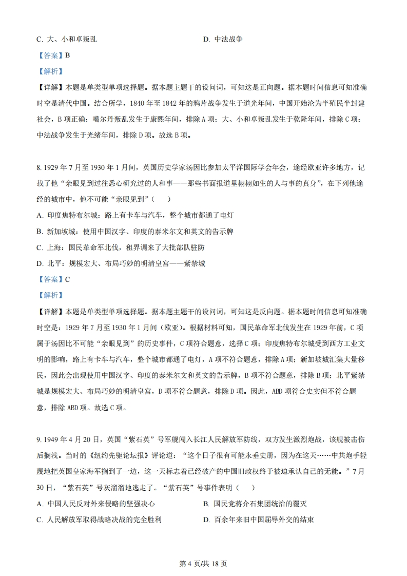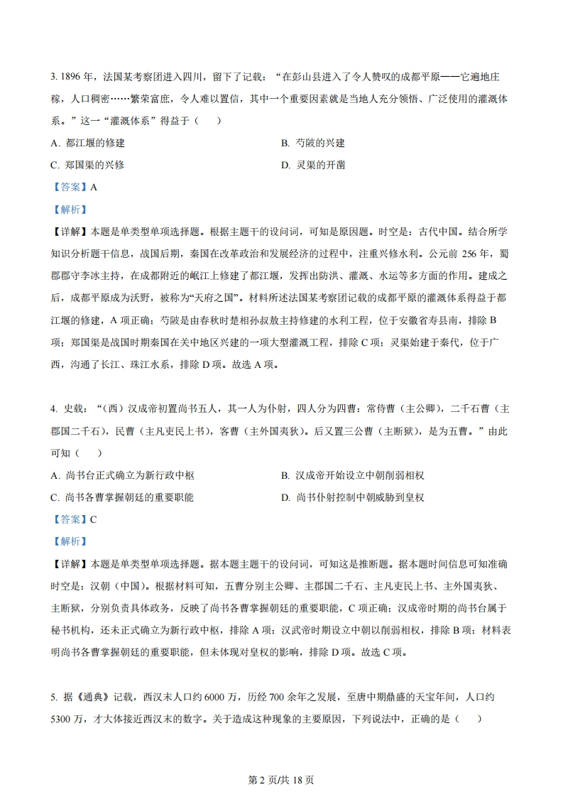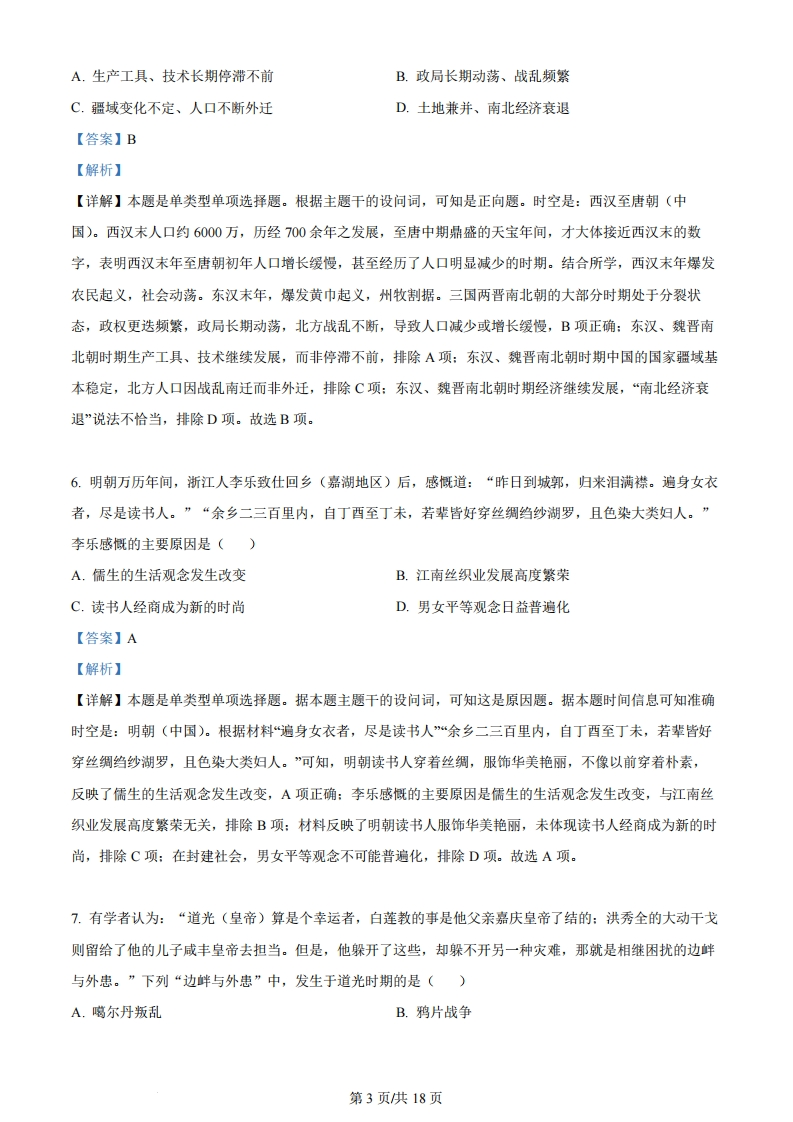 浙江省2024年1月普通高校招生选考科目考试历史试题第I卷一、选释题1(本大题共15小题,每小题2分,共30分。每小题列出的四个备选项中只有一个是符合题目要求的,不选、多选、错选均不得分)1.中华文明是人类最古老的文明之一。早在新石器时代,先民们就创造了丰富的物质和精神文化。这一时期()A.种植粟和水稻,掌握养蚕缫丝技术B.邦国林立,早期国家形成并发展C.先后出现精美玉器、青铜器和铁器D.氏族成员平等,未出现阶级分化【答案】A【解析】【详解】本题是单类型单项选择题。根据主题干的设问词,可知是推断题。时空是:新石器时代(中国)。距今约1万年前,中国进入新石器时代。仰韶文化和河姆渡文化是新石器时代文化遗存,仰韶文化时期以粟等为主要栽培作物,河姆渡文化的居民种植水稻,并且掌握了养蚕缫丝技术,A项正确:夏、商、西周是中华文明和早期国家的形成与发展时期,排除B项:新石器时代尚未出现铁器,排除C项:新石器时代晚期进入父系氏族社会,社会贫富分化与不平等开始出现,排除D项。故选A项。2.文化是民族的血脉。中华优秀传统文化源远流长,博大精深。下列项中,由老子提出且体现朴素唯物观的是()A.“大道之行也,天下为公”B.“天行健,君子以自强不息”C.“天行有常,不为尧存,不为桀亡”D.“人法地,地法天,天法道,道法自然”【答案】D【解析】【详解】本题是单类型单项选择题。据本题主题干的设问词,可知这是正向题。据本题时间信息可知准确时空是:古代(中国)。根据所学知识可知,“人法地,地法天,天法道,道法自然”由老子提出,意思是:人类的生活行为的运行是以地球物理运行的法则为法则,地球运行的法则是以这整个宇宙运行的法则为法则,宇宙运行的是以道的法则为法则,道的运行是以自然而然为法则。简言之,道的运作是以宇宙本来自然的规律为规律,体现了朴素唯物观,D项正确:“大道之行也,天下为公”意思是在大道施行的时候,天下是人们所共有的。不符合题意,排除A项:“天行健,君子以自强不息”意思是宇宙不停运转,人应效法天地,永远不断地前进。不符合题意,排除B项:“天行有常,不为尧存,不为桀亡的意思是大自然的运行有其自身规律,这个规律不会因为尧的圣明而就存在,也不会因为桀而就不存在。该主张由荀子提出,不符合题意,排除C项。故选D项。第1页供18页