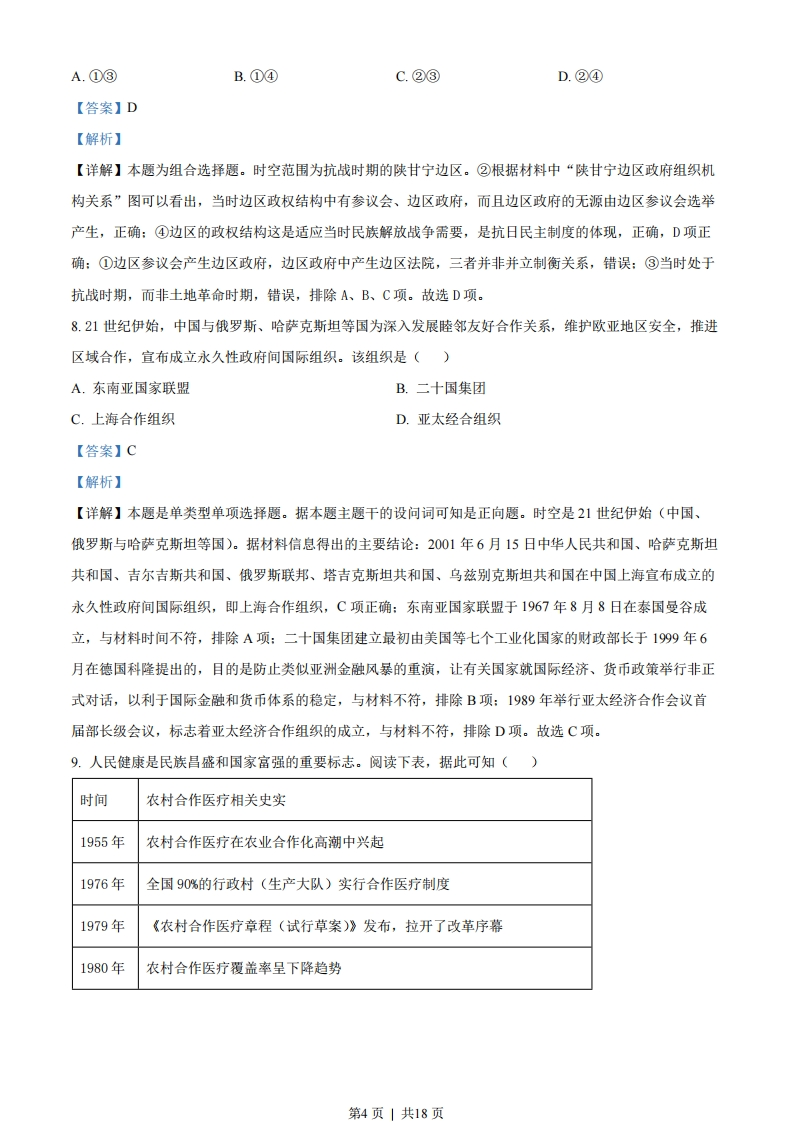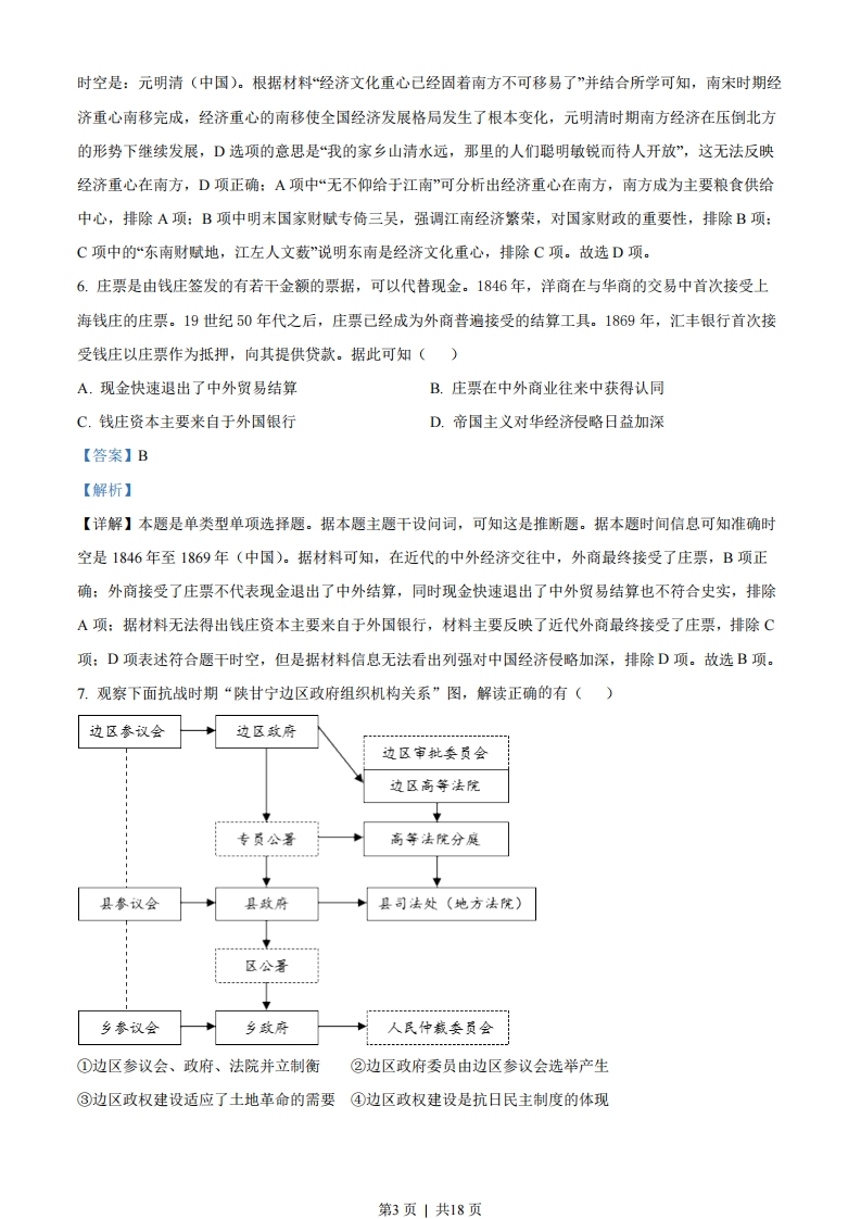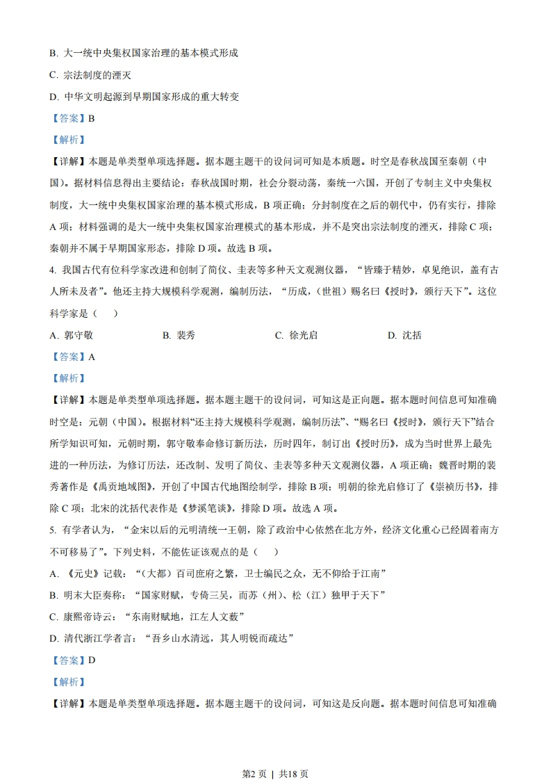 2023年6月高考浙江历史真题选择题部分一、选择题I(本大题共15小题,每小题2分,共30分。每小题列出的四个备选项中只有一个是符合题目要求的,不选、多选、错选均不得分)1.中国原始文化星罗棋布,多姿多彩。龙山文化是新石器时代晚期的一种文化,1928年首次发现于山东章丘龙山镇,广泛分布于黄河中下游等地区。该文化的代表器物是()A.黑陶B.彩绘陶器C.玉器D.骨器【答案】A【解析】【详解】本题是单类型单项选择题。据本题主题干的设问词,可知这是正向题。据本题时间信息可知准确时空是:新石器时代晚期(中国)。根据材料“龙山文化是新石器时代晚期的一种文化,1928年首次发现于山东章丘龙山镇,广泛分布于黄河中下游等地区”结合所学知识可知,龙山文化距今约4000年,分布于黄河中下游,其精美的磨光黑陶为代表器物,A项正确:我国新石器时代的仰韶、大汶口等文化中,代表器物是彩绘花纹的陶器,排除B项:玉器是良渚文化的代表器物,排除C项:龙山文化的代表器物是黑陶,不是骨器,排除D项。故选A项。2.中华文化重视以人为本。子曰:“己所不欲,勿施于人。”“己欲立而立人,己欲达而达人。”这种“仁者爱人”的思想体现在政治伦理上就是民本思想。下列项中,反映孔子民本思想的是()A.无为而治B.“相生相胜”C.反对苛政D.“兼爱”“非攻”【答案】C【解析】【详解】本题是单类型单项选择题。据本题主题干的设问词,可知这是本质题。据本题时间信息可知准确时空是:春秋时期(中国)。根据材料“仁者爱人'的思想体现在政治伦理上就是民本思想”结合所学知识可知,孔子主张“仁者爱人”,为政以德,抨击残暴统治认为“苛政猛于虎”,认为君王应当关注人民的疾苦和需求,尽力满足人民的利益,反对苛政,C项正确:无为而治是道家老子的思想,主张顺应自然,不求有所作为而使天下得到治理,排除A项:战国末期的邹衍用五行相生相克、终而复始的观点解释历史发展现象,即“相生相胜”,排除B项:“兼爱“非攻”是战国时期墨子的主张,“兼爱”意思是强调每个人都应像爱自己一样爱他人,“非攻”即反对不义的战争,排除D项。故选C项。3.春秋战国时期,“天下共苦战斗不休”。秦国远交近攻,各个击破,相继灭掉六国,进而开创了“海内为郡县”“天下之事无小大皆决于上”的局面,这表明()A.分封制度的终结第1页」共18页