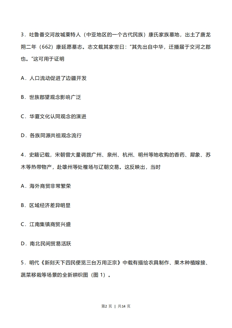 2023年河北省普通高中学业水平选择性考试历史试题一、选择题:本题共16小题,每小题3分,共48分。在每小题给出的四个选项中,只有一项是符合题目要求的。1.张家口尚义四台遗址文化遗存分为五组。第一组出土了打制、磨制石器,第三组发现了炭化的粟与黍,第一至四组发现了半地穴式房址,五个组都出土了陶器。下列与其文化特征最相近的考古遗址是A.北京人遗址B.河姆渡遗址C.兴隆洼遗址D.二里头遗址2.春秋时期诸侯所铸青铜器的铭文中有”徐王“越王”等称谓,而《左传》等文献却称上述诸侯为“子”。由此可知A.该时期贵族等级分封制解体B.出土文物信息较为可信C.当时各国君主专制逐步确立D.史料会体现一定主观性第1页|共14页