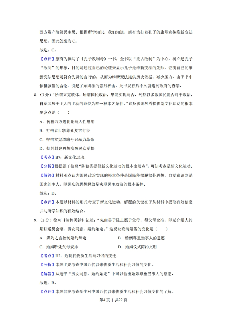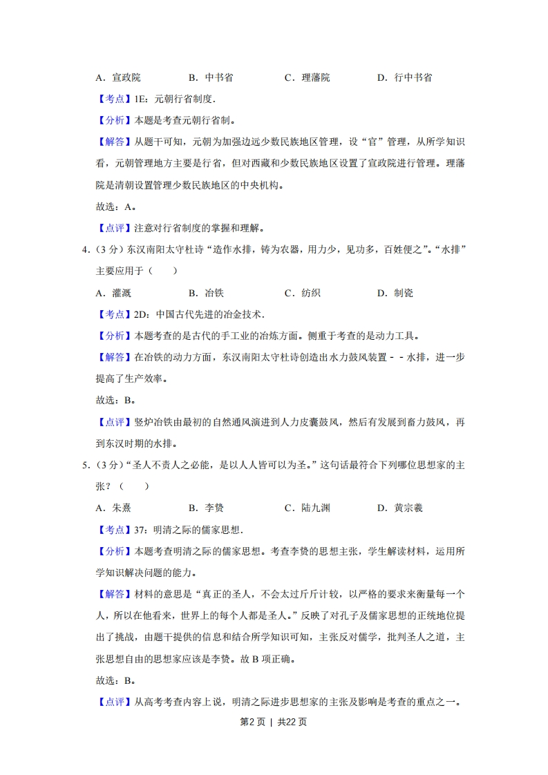 2010年江苏省高考历史试卷解析版套考答案与试题解析一、选择题:本大题共20题,每题3分,共计60分,在每小题列出的四个选项中,只有一项最符合题目要求。1.(3分)柳宗元《封建论》载:“时有叛国而无叛郡,秦制之得,亦以明矣。“符合这一论断的历史时期是()A.秦朝B.西汉C.南北朝D.唐朝【考点】1B:汉朝加强中央集权的措施【分析】本题主要考查西汉初年的郡国并行制。【解答】解答本题的关键在于明确材料中“时有叛国而无叛郡”的含义:经常有反叛的诸侯王而没有反叛的郡县。西汉初年,由于实行郡国并行制,曾发生过七国之乱致使社会动荡。故选:B。【点评】本题旨在通过学生对材料的分析考查西汉初年的地方行政制度。2.(3分)诗人左思在其《咏史》中沉郁悲歌:“世胄蹑高位,英俊沉下僚。地势使之然,由来非一朝。”造成这一社会状况的制度原因是()A.征辟制B.察举制C.九品中正制D.科举制【考点】1N:九品中正制.【分析】本题考查了古代选官制度。【解答】从材料“世胄蹑高位,英俊沉下僚”可以分析得出此时由门第高的世家大族把持了政治仕途,有才华的人士因为出身低微,不能受到重用。这种制度是魏晋时期实行的九品中正制,以门第出身作为主要选官标准。A、B项是在汉朝实行的选官制度,重视品德和才能,D项是在隋唐时期通过考试选官的制度。故选:C。【点评】认识古代的选官制度是专制主义中央集权制度的重要组成部分,需要掌握古代选官制度的演变,注意之间的区别,特别以科举制最为重要。3.(3分)“元起朔方,固己崇尚释教(佛教),及得西域,世祖以其地广而险远,…思有以因其俗而柔其人,乃郡县土番之地,设官分职,而领之于帝师。“这里的“官“隶属于()第1页1共22页