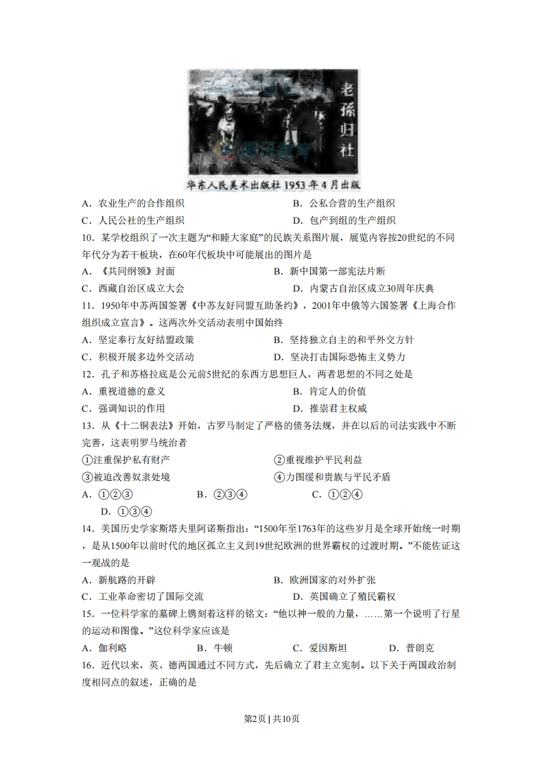 2008年普通高等学校招生全国统一考试历史(江苏)一、选择题:本大题共20题,每题3分,共计60分。在年小题列出的四个选项中,只有一项最符合题目要求。1.“齐人“鲁人“楚人”这种表述,逐渐让位于以行政区划为籍贯的表述,造成这一变化的制度因素是A.分封制B.宗法制C.郡县制D.三省六总部2.“脱帽露顶王公前,挥毫落纸如云烟”,杜甫的这句诗描述了当时一位书法家的创作情景,这位书法家是A.王羲之B.张旭C.颜真聊D.柳公权3.唐太宗说:“以天下之广,四海之众,千端万绪,须合变通,皆委百司商量,宰相筹划,于事稳便,方可奏行。岂得以一日万机,独断一人之虑也。”材料表明他主张A.发挥宰相等大臣的仪政权B.群权与相权相互制后衡C.中央权力重心应当下移D.君主不应实现专制统治4.在唐诗和唐三彩中骆驼和胡人逐渐成为浒的文化符号,造成这一现象的原因是①民族融合的加强②丝绸之路的畅通③文化政策的开放④古代商帮的推动A.①②④B.②③④C.①②③D.①②③④5.张之洞说:“臣愚以为华民所需外洋之物,必悉行仿造,虽不尽断来源,亦可渐开风气。”这表明他主张A.仿效西方政治制度B.兴办近代军事工业C.创办近代民用工业D.学习西方自然科学6.1869年,《教会新报》的一篇文章写道:“外国生产皆男医接生,虽经此例,似不成规矩。男归男医,女归女医,岂不至善!”材料反映出当时的中国A.虽己开放,但人们思想还比较保守B,西方男女平等观念逐渐深入人心C.旧的风俗习惯受到西方民族思潮的冲击D.人们难以接受西方医学知识7.如果看到右侧漫画,下列人物中最为愤慨的可能是A.魏源B.林则徐C.洪仁轩D.严复人头餐身的达尔文8.至20世纪初,“外贷风行,土布渐归淘汰”,洋布战胜土布,最根本的武器是A.洋布外观漂亮B.洋布广告弃斥C.洋布引领时尚D.洋布价格低廉9.下图是一本连环画的封面,该书讲述了孙家庄农民孙志刚的故事,图中的“社”指的是第1页1共10页