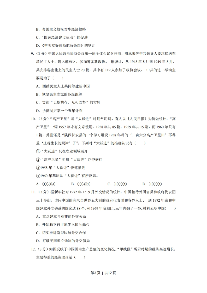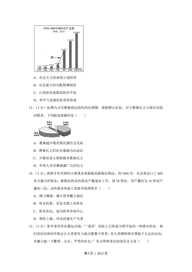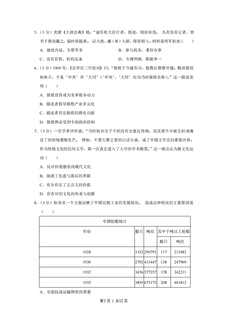 2013年江苏省高考历史试卷一、选释题:本大题共20题,每题3分,共计60分,在每小题列出的四个选项中,只有一项最符合题目要求,1.(3分)现代考古在秦、魏等国故地出土了许多生铁铸造的农具。1950~1951年河南辉县发掘了5座大型魏墓,1号墓出土铁器65件,其中农具占58件,包括锼、锄、铲、镰、犁铧等一整套铁农具。材料说明战国时期()A.生铁铸造由魏国独断经营B.成套铁农具有利农业精耕细作C.铁制农具成为随葬必备品D.铁制农具最早出现于河南辉县2.(3分)从甲骨的刻符、青铜器的铭文,到笔画详备的楷书,缀连成一幅生动的文字史画卷。观察右侧图片,可以得出的准确认识是()楷体汉字执2甲骨文在断A.楷体汉字形态直接演化于甲骨文B.楷体汉字飞舞飘逸便于抒情达意C.甲骨文字是不可识读的刻画符号D.甲骨文具有现今文字的某些特征3.(3分)某学者评唐朝三省制时指出:“凡未加盖‘中书门下之印,未经政事堂议决副署,而由皇帝直接发出的命令,在当时是被认为违制的,不能为下属机关所承认。冶这里所谓“违制”的论断,主要指皇帝背离了()A,诏令须由政事堂议决的制度B.门下省执掌诏令草拟的职能C.中书省监察地方政务的惯例D.尚书省负责执行诏令的定制4.(3分)清前期《望江南百调》唱道:“扬州好,侨寓半官场,购买园亭宾亦主,经营盐、典仕而商,富贵不归乡。材料反映了()A,仕商身份界限完全打破B.商业发展改变社会风气C.地方商业均由官员经营D.政府摒弃传统抑商政策第1页1共12页