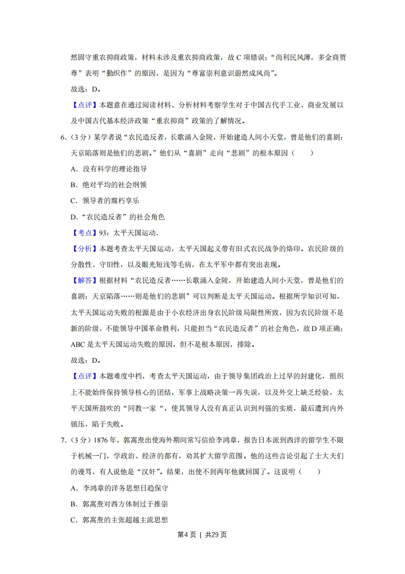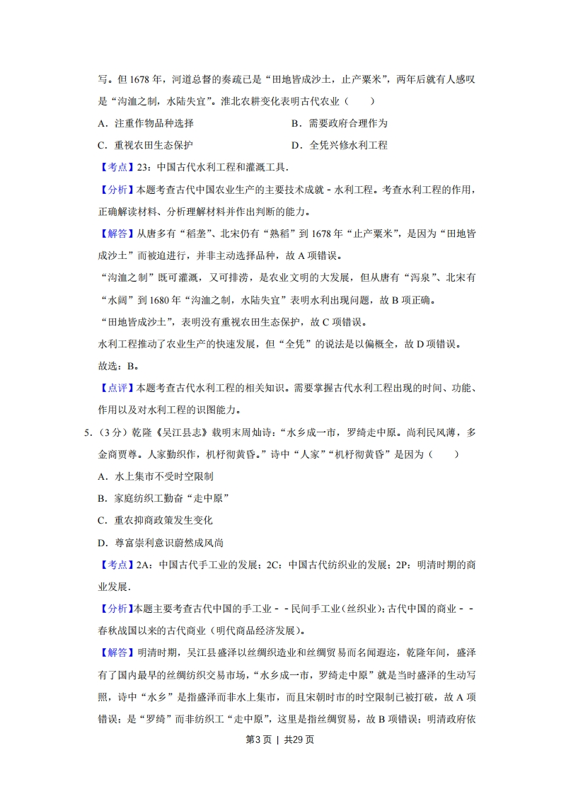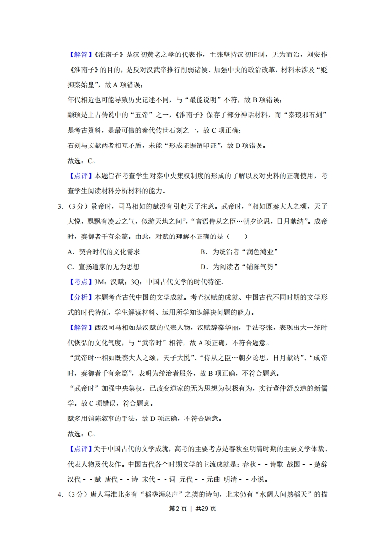 2015年江苏省高考历史试卷解析版套考答案与试题解析一、选择题:本大题共20题,每题3分,共计60分,在每小题列出的四个选项中,只有一项最符合题目要求。1.(3分)《礼记》记述了贵族朝会的列位礼节:天子南向而立:三公,中阶之前:诸侯,阼阶(东台阶)之东:诸伯,西阶之西:诸子,门东…九夷,东门外:八蛮,南门外。与此相关的政治制度是()A.分封制B.三公九卿制C.郡县制D.郡国并行制【考点】12:西周的分封制。【分析】本题考查的知识点是西周时期分封制的特点、权利和义务。【解答】西周分封制规定诸侯必须服从周天子的命令,有朝觐述职的义务,有严格的“贵族朝会的列位礼节”,还实行班爵制度规定诸侯的等级,周王是最高统治者即“天子”,王以下有公、侯、伯、子、男五等,与“贵族朝会的列位礼节:天子…三公…诸侯…诸伯…诸子…”相符,故A项正确:材料中虽有“三公”,但只有“九夷”而无“九卿”,不是三公九卿制,故B项错误:材料未涉及郡县,且与“诸侯”不符,故C项错误:虽有“诸侯”,但材料未涉及郡,故D项错误。故选:A【点评】本题注重抓关键词和对题干材料的分析、理解,需要学生识记分封制的内容和特点。2.(3分)据秦琅邪石刻,皇帝之土,西涉流沙,东有东海。但西汉学者编写的《淮南子》等书说颗顼帝即己“西济于流沙”,大禹“东渐于海,西被于流沙”,更有“纣之地,左东海,右流沙”。上述差异最能说明()A,《淮南子》等书以传说贬抑秦始皇B.年代久远导致历史记述莫衷一是C.历史材料的运用首先要辨别真伪D.石刻与文献形成证据链印证历史【考点】Y4:史料的重要作用【分析】本题主要考查秦中央集权制度的形成以及史料的正确使用。第1页|共29页