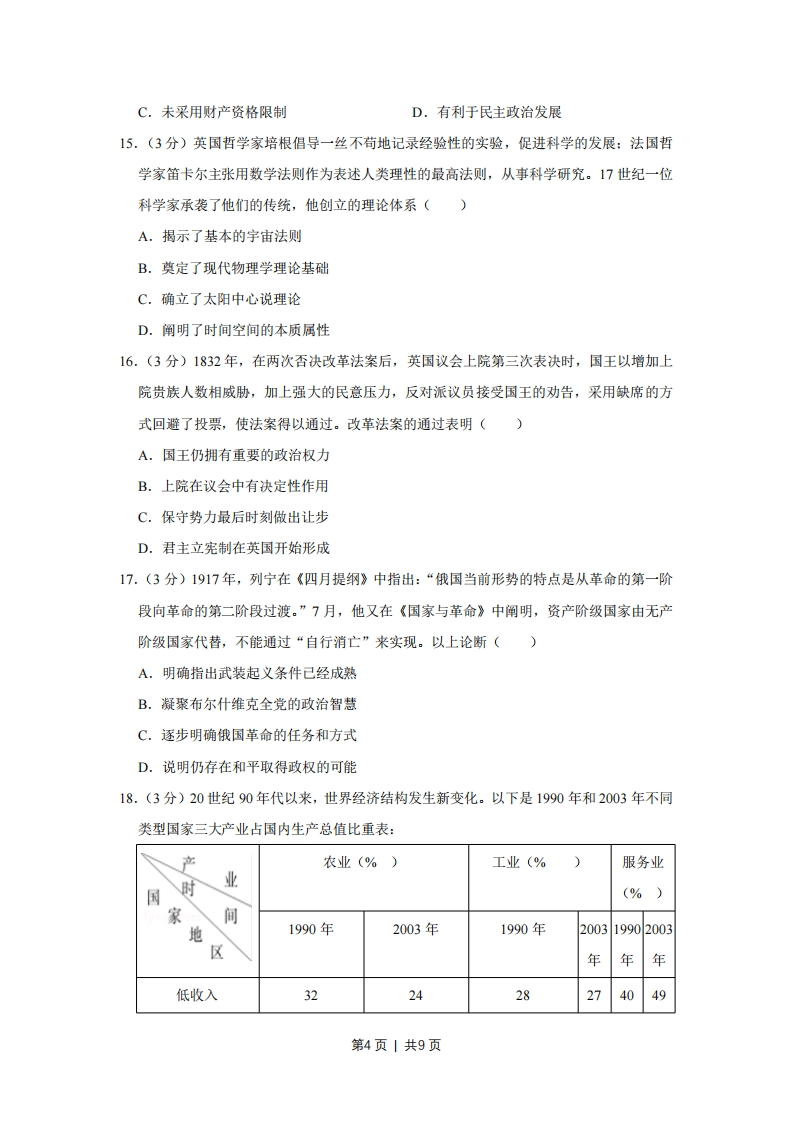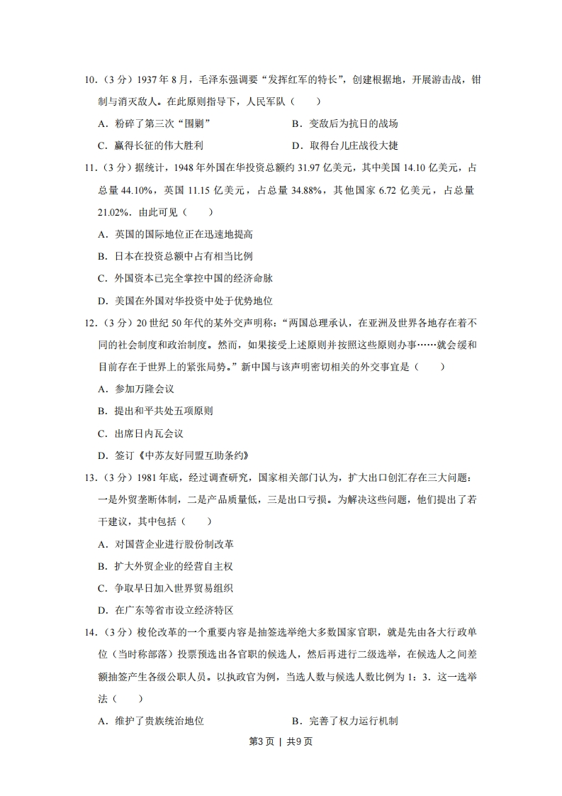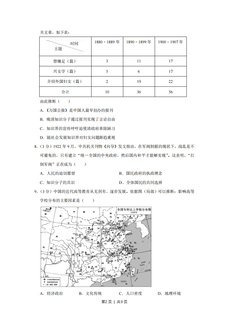 2017年江苏省高考历史试卷一、选释题:本大题共20题,每题3分,共计60分,在每小题列出的四个选项中,只有一项最符合题目要求,1.(3分)《国语》讲“祀,国之大节”。有学者认为,青铜器在商周时期被视为“政治的权力”。可推断,商周时期青铜器主要用作()A.农具B.礼器C.食具D.货币2.(3分)公元前113年,汉武帝下令禁止郡国和民间私铸钱币,指定专门官吏负责铸造五铢钱,作为法定货币。这一举措()A.有利于加强中央集权B.首次实现了国家统一C.加重了百姓赋税负担D.空前强化了君主专制3.(3分)唐初,三省长官都是宰相,后来发生了两种变化:一是皇帝选拔中级官吏出任宰相:二是执掌行政职能的尚书省地位下降,与决策职能相关联的中书省、门下省地位上升。这表明()A,三省六部制基本上己被废除B.政府的行政效率极大提高C.君权与相权的关系有所调整D.中书省、门下省决策权扩大4.(3分)孔子主张“克己复礼”“为仁由己”。朱熹对“克己”作如下解释:“克”意为“胜”,“己”指的是“身之私欲”。这种解释()A.将人性置于天理之上B.以满足个人欲望为目标C.完全曲解孔子的本意D.与孔子本意不完全一致5.(3分)中国画注重写意传神,追求“得意忘形”,或者说注重用画面传达主观情致与神韵,并不拘泥于客观景物和人物的逼真墓写。这种特点可概括为()A,天人合一B.诗画合一C.情景合一D.知行合一6.(3分)鸦片战争后,两江总督耆英说,“良民与莠民亦成水火…民己焦头烂额,官犹诩诩自得,扬言…民情柔懦,安得闹事”,更“欺压良善,自命为能员”,“此实不能御寇之由”。耆英认为鸦片战争失败的主要原因是()A.贫富不均B.莠民作乱C.民性懦弱D.吏治败坏7.(3分)《万国公报》对近代中国知识分子产生了较大影响。有学者统计了其中发表的相第1页|共9页