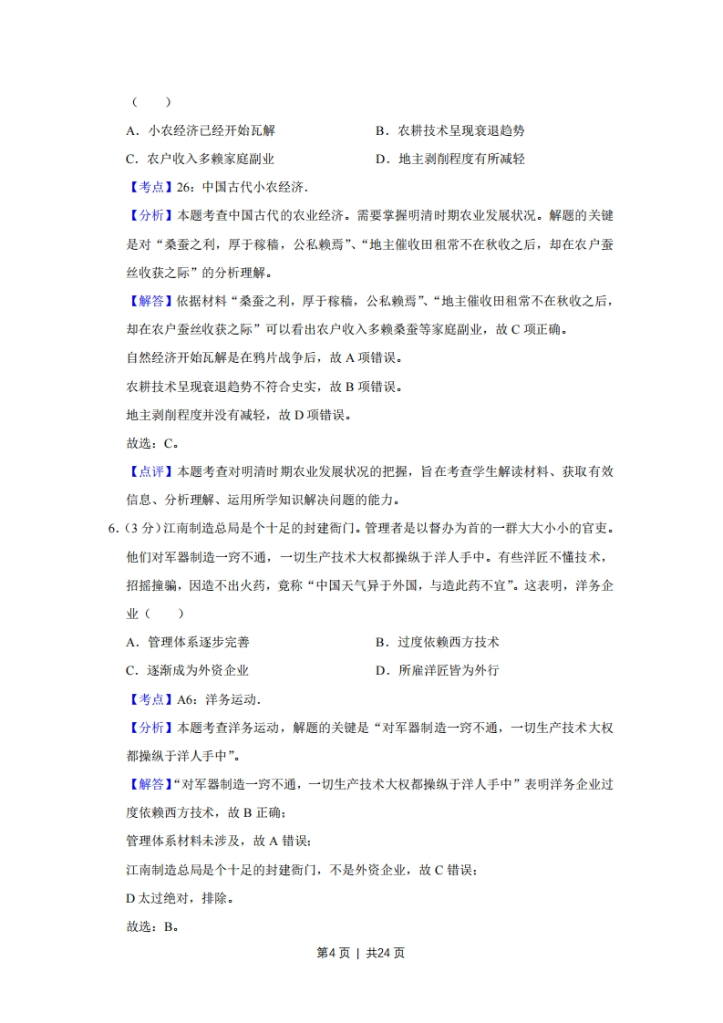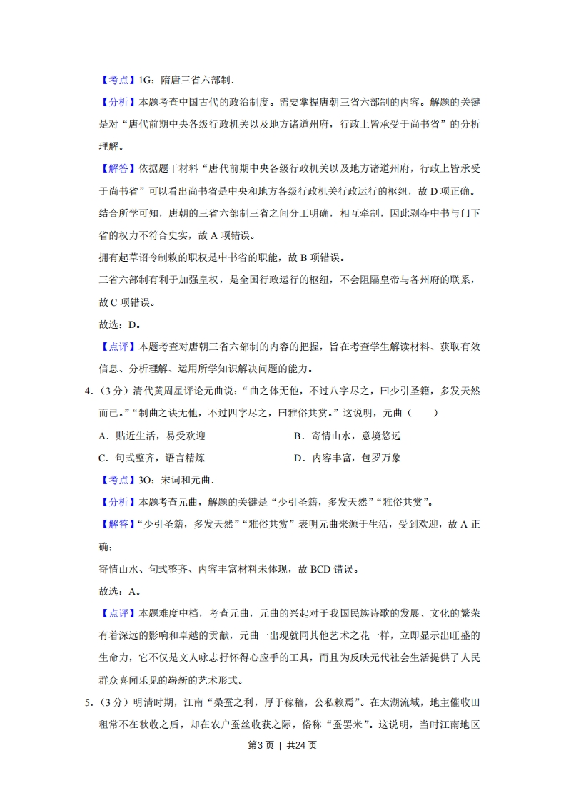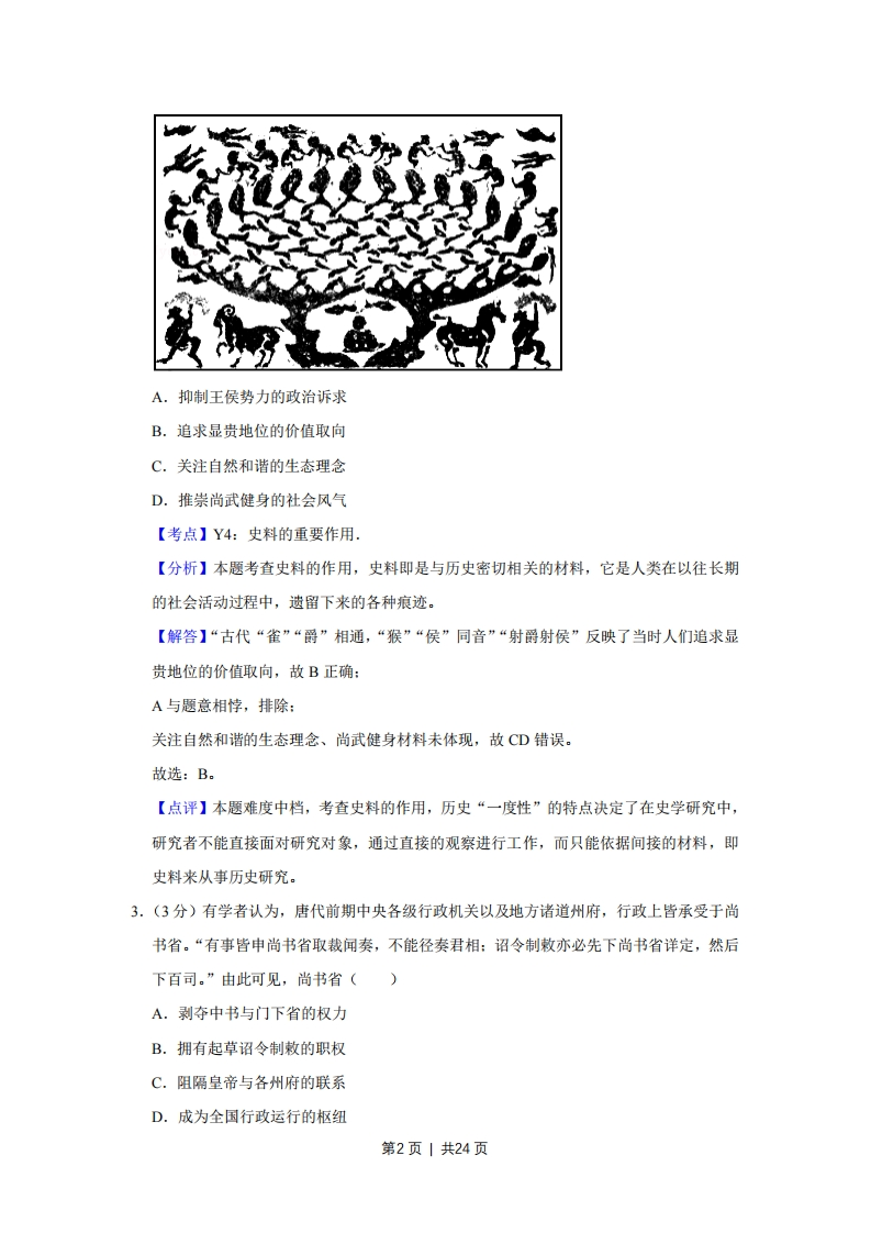 2018年江苏省高考历史试卷解析版套考答案与试题解析一、选择题:本大题共20题,每题3分,共计60分,在每小题列出的四个选项中,只有一项最符合题目要求,1.(3分)被孟子称为“贱丈夫”的民间商人,最初是不合法的,不能到城里市场上去交易。他们只能在野外找个土岗,“以左右望”,获取利益。后来,民间商人向政府纳过税后就可以在城里的市场上进行交易了。这一变化反映了()A,政府放弃重农抑商政策B.民间商人推动商业市镇崛起C.政府不再监管商业活动D.民间商人可以取得合法地位【考点】2X:重农抑商政策及其影响,【分析】本题考查中国古代商业的发展。需要掌握古代商业发展演变。解题的关键信总是“民间商人向政府纳过税后就可以在城里的市场上进行交易了”。【解答】依据题干材料“民间商人向政府纳过税后就可以在城里的市场上进行交易了”可以看出民间商人可以取得合法地位,故D项正确。历代王朝一直实行重农抑商政策,故A项错误。材料没有体现民间商人推动商业市镇崛起,故B项错误。材料无法得出政府不再监管商业活动,故C项错误。故选:D。【点评】本题考查对古代商业发展演变的把握,旨在考查学生解读材料、获取有效信息、分析理解、运用所学知识解决问题的能力。2.(3分)下图是山东省微山县两城镇出土的东汉“射爵射侯”画像石。图中树上有20多只雀和猴,树下两人持弓仰射。古代“雀”“爵”相通,“猴”“侯”同音。这类画像在汉代石刻中较为常见。这反映了当时人们()第1页|共24页
