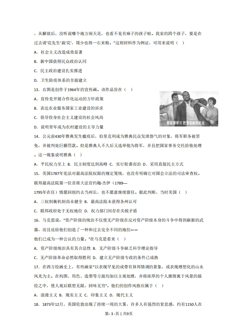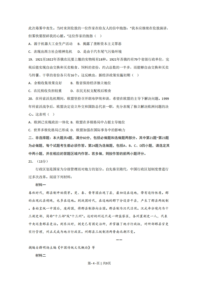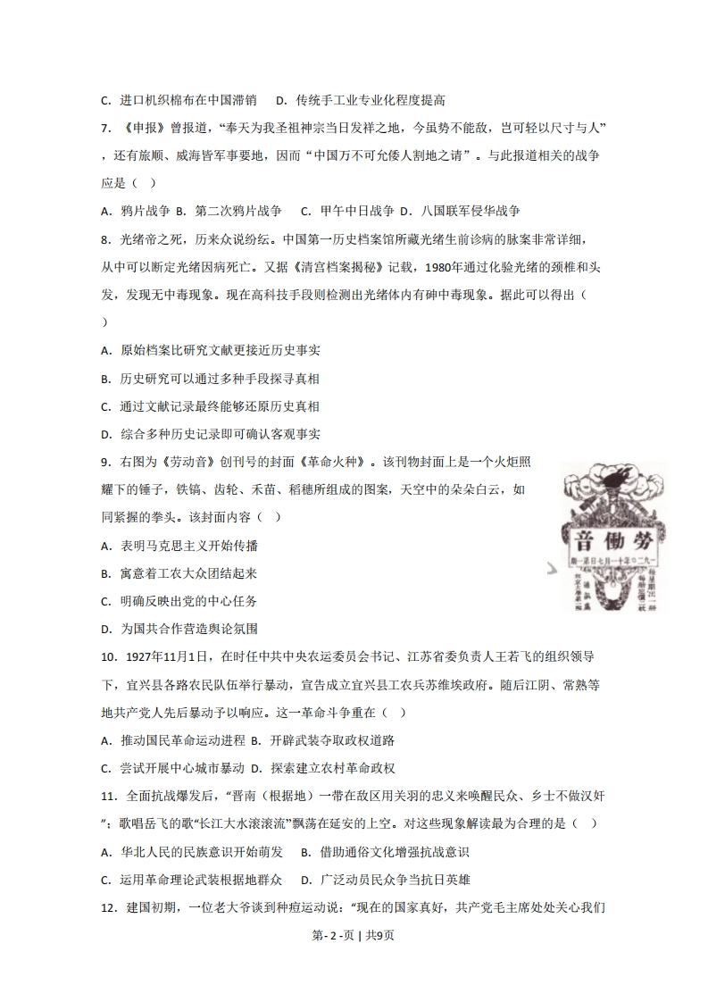 2020年江苏省高考历史试卷一、选择题:本大题共20题,每题3分,共计60分。在每小题列出的四个选项中,只有一项最符合题目要求。1.近年江西新干出土了一批商代青铜农具,有犁、耜、斧、铲、镰等,种类较为齐全。某些类型的农具还是首次发现,更无使用之痕。不少农具铸有云纹、兽面纹、蝉纹等具有神秘意义的纹饰,绝非一般农具所能铸刻。这反映出()A.青铜农具最早出现于江西新干B.成套青铜农具有利于精耕细作C.青铜农具基本不用于农业生产D.全国经济重心己经转移到南方2.墨子提出治理天下应当像大禹那样“使劳者得息,乱者得治”,认为察“圣王之事”得“观其中国家百姓人民之利”。由此可知,墨家学派能够兴起的主要原因在于()A.恢复前代礼乐制度B.代表下层平民利益C.强调社会等级和谐D.适应兼并战争需要3.有学者认为,如果说安史之乱以前,唐诗以豪放、浪漫色彩引人注目,那么安史之乱以后,则已代之以沉郁悲壮的情调了。对这一评论理解正确的是()A.社会变迁影响唐诗创作B.盛唐气象推动唐诗演变C.唐诗全景再现社会真实D.安史之乱导致唐诗衰微4.孟子讲“觉”,佛教讲“悟”,程颗、程颐兄弟则将二者圆通。北宋僧人契嵩认为儒和佛“心则一”,佛教“亦有意于天下国家矣,何尝不存其君臣父子”。这反映出北宋()A.儒学统治地位动摇B.儒学与佛教的融合C.理学成为官方哲学D.阳明心学影响深远5.明代松江府大地主潘允端的《玉华堂日记》中,反映土地租佃关系的记事有4条。在日记中,关于垦田挑泥、种麦等往往有发给“工本”和“工银”的记载,他的田庄产品除自用外,也有一部分投放市场。该日记可以佐证()A.农村雇佣劳动基本普及B.地主剥削程度有所减轻C.地主收入依赖家庭副业D.农业生产经营方式多样6.自19世纪中叶洋纱大量进口后,农家不再自己纺纱,逐渐购入洋纱织布。手工织布不但没有在机织棉布面前立即败退,反而得到一度的兴盛和繁荣,日益从农家分离出来而成为一个独立的生产行业。到1894年,手工织布工场己相当普遍。这主要反映了()A.传统的小农经济根深蒂固B.民族资本主义工业初步发展第-1-页1共9页