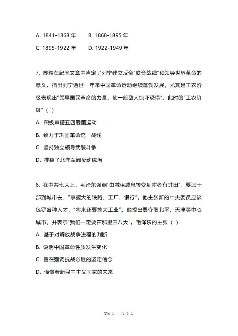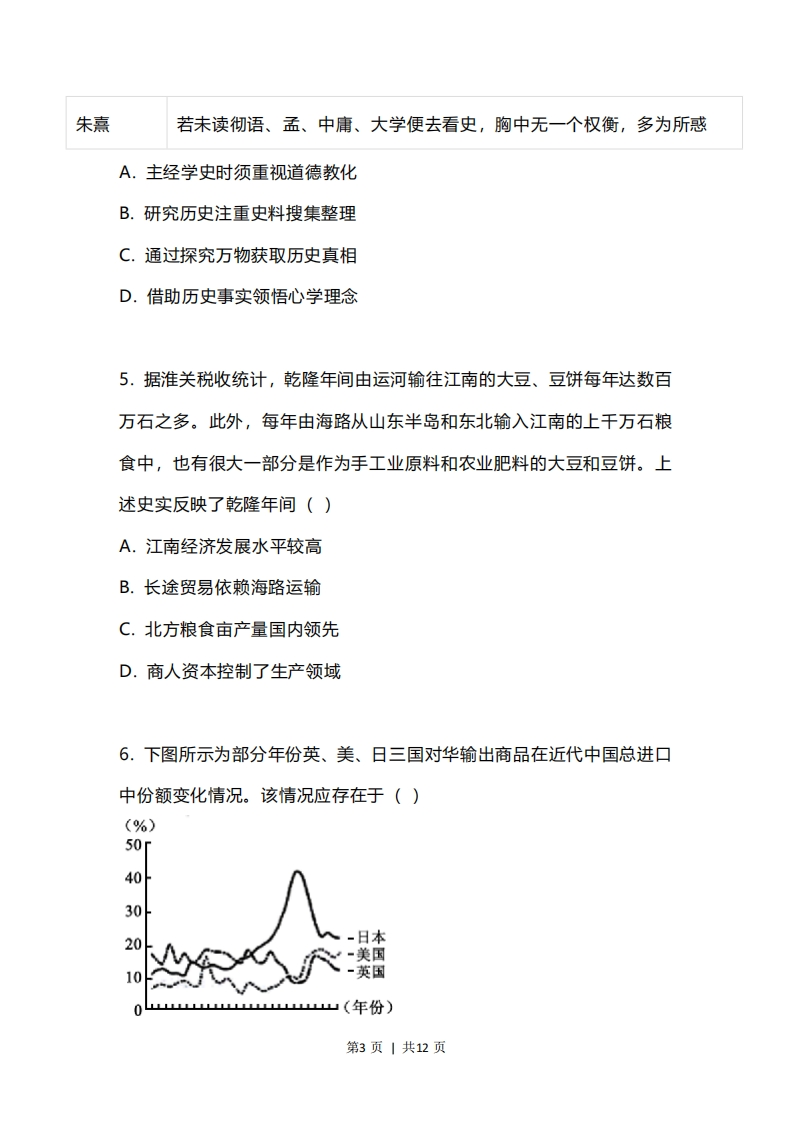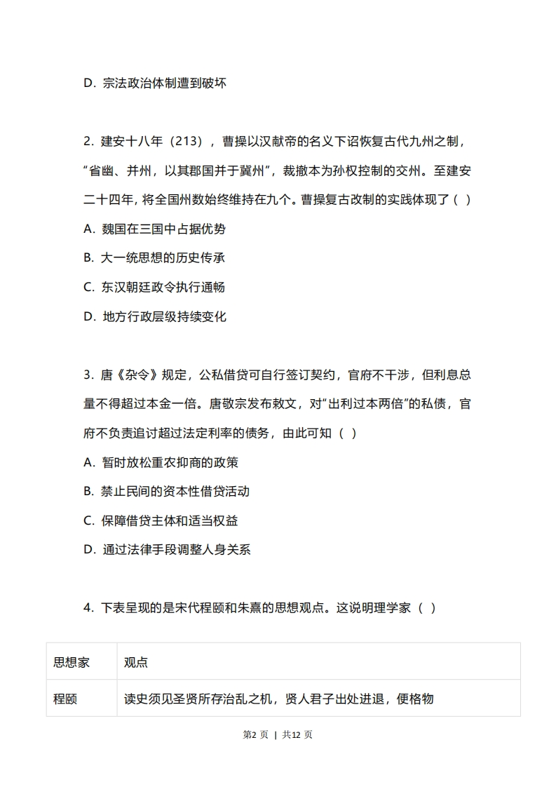 2023年江苏省普通高中学业水平选择性考试注意事项考生在答题前请认真阅读本注意事项及各题答题要求1.本试卷共6页,满分为100分,考试时间为75分钟。考试结束后,请将本试卷和答题卡并交回。2.答题前,请务必将自己的姓名、准考证号用0.5毫米黑色墨水的签字笔填写在试卷及答题卡的规定位置。3.请认真核对监考员在答题卡上所粘贴的条形码上的姓名、准考证号与本人是否相符。4.作答选择题,必须用2B铅笔将答题卡上对应选项的方框涂满、涂黑:如需改动,请用橡皮擦干净后,再选涂其他答案。作答非选择题,必须用0.5毫米黑色墨水的签字笔在答题卡上的指定位置作答,在其他位置作答一律无效。5.如需作图,必须用2B铅笔绘、写清楚,线条、符号等须加黑、加粗。历史一、单项选择题:共16题,每小题3分,共48分。每题只有一个选项最符合题意。1.春秋时期,晋国在兼并虞国等同姓方国时,也与无终戎等北方诸戎和好,以免于在同楚国争霸过程中腹背受敌。这一现象表明当时()A.北方诸戎已融入华夏族B.政治权力下移至卿大夫C.楚国吴起变法成效显著第1页|共12页