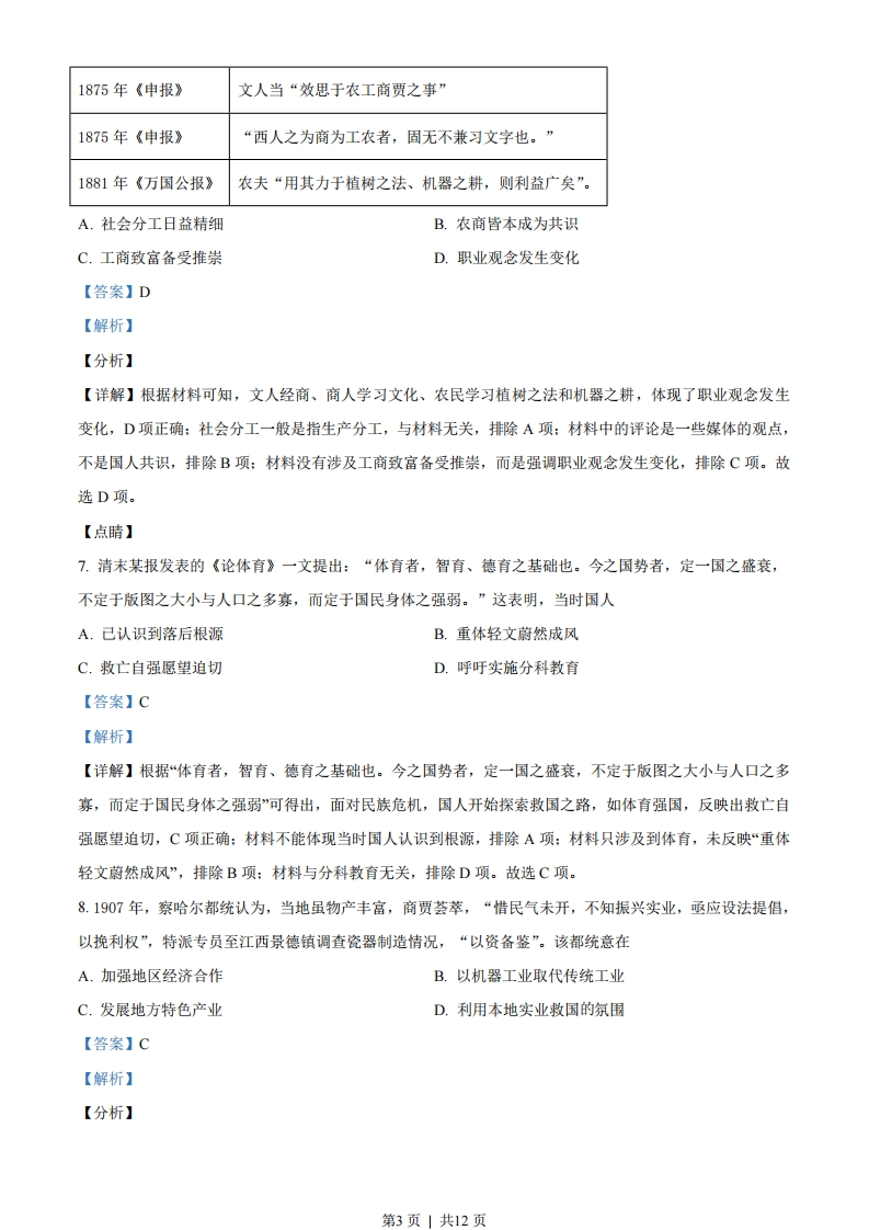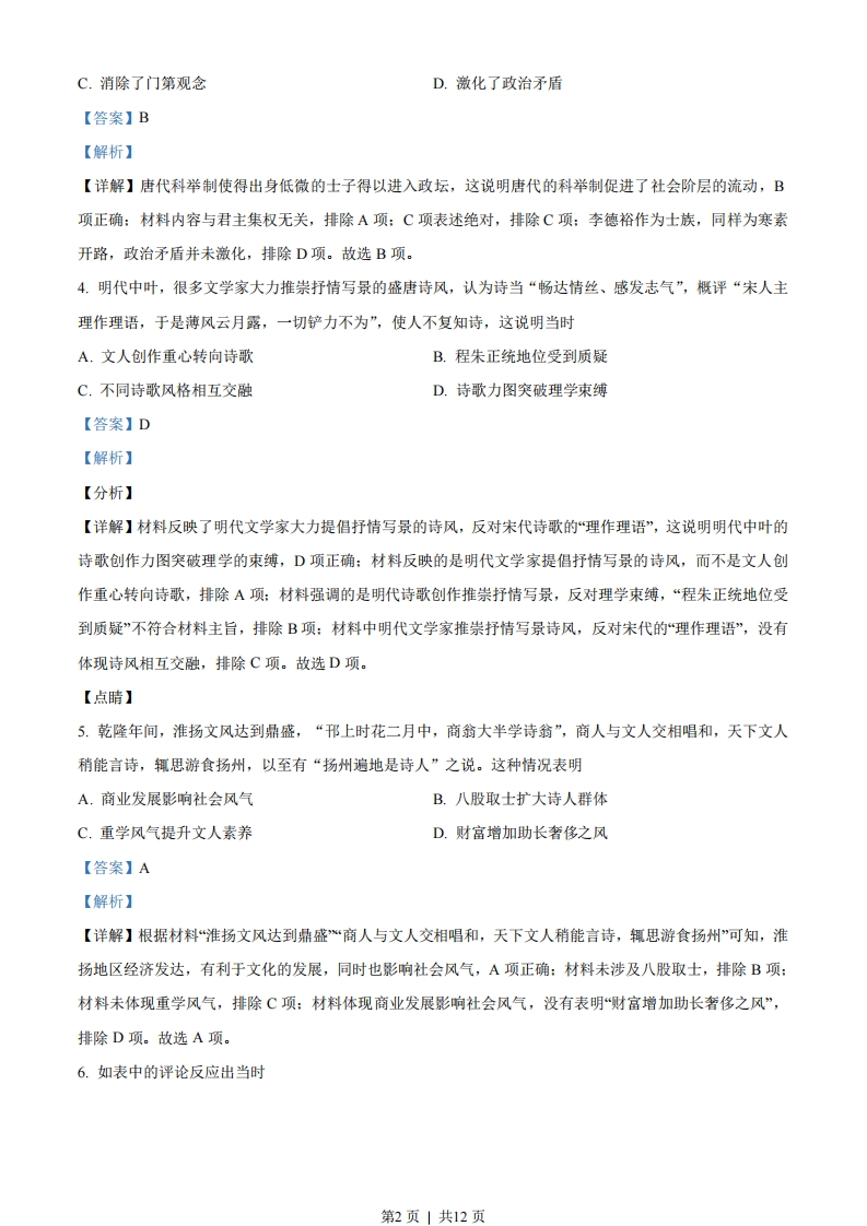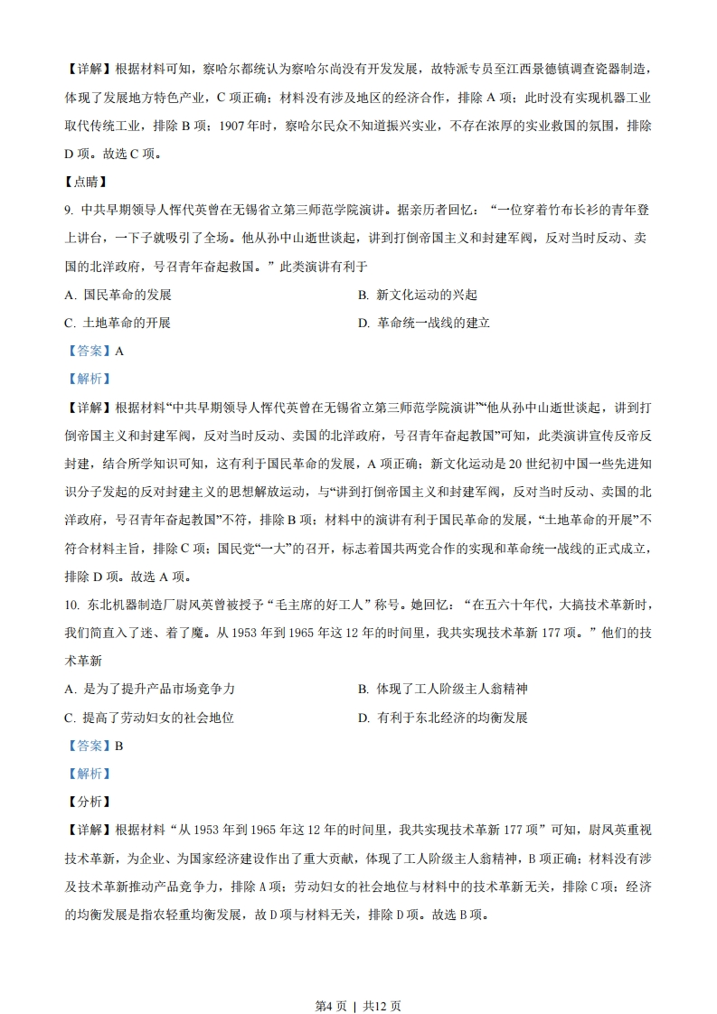 2021年江苏省高考历史试题一、单项选择题1.有学者认为,《睡虎地秦简·为吏之道》是供学习为吏者使用的识字课本。其末尾附录的两条魏律(颁布于公元前252年)规定:商贾和经营客店者“勿令为户”,不分给他们田地、房屋:派其从军,杀牛犒赏全军时,不给他们肉吃。由此可见A.魏律成为秦吏准绳B.强制耕战成效显著C.秦国实行以吏为师D.抑商思想影响渐广【答案】D【解析】【分析】【详解】材料反映了秦简中收录了魏律中打击和抑制商人的两条法律条文,这说明战国时期抑商思想影响渐广,D项正确:秦简收录两则魏律条文,不代表秦吏以魏律为准绳,排除A项:材料强调的是抑商思想,没有涉及强制耕战,排除B项:材料强调的是秦国对商人的抑制,没有体现以吏为师,排除C项。故选D项。【点睛】2.《史记·淮阴侯列传》:“吾如淮阴,淮阴人为余言,韩信虽为布衣时,其志与众异。其母死,贫无以葬,然乃行营高散地,令其旁可置万家。余视其母冢,良然”。在这里,司马迁采用的史学方法是A.档案文献与现场考察结合B.口述资料与实地深访互证C.出土简牍与历史文献参校D.民间传说与墓志铭文比对【答案】B【解析】【分析】【详解】根据材料可知,太史公说:我到淮阴,淮阴人对我说,韩信即使是平民百姓时,他的心志就与众不同。他母亲死了,家中贫困无法埋葬,可他还是到处寻找又高又宽敞的坟地,让坟墓旁可以安置万户人家。我看了他母亲的坟墓,的确如此。故司马迁采用的史学方法是口述资料与实地探访互证,B项正确:材料没有涉及档案文献、出土简牍、墓志铭文等信息,排除ACD项。故选B项。【点睛】3.唐代李逢吉作科举主考官时,一次性录取的几十位进士,均为出身贫寒的士子。他的政敌李德裕亦“颇为寒素开路”,以致被贬谪时,“八百孤寒齐下泪”。由此可知唐代科举A.加强了君主集权B.促进了阶级流动第1页」共12页