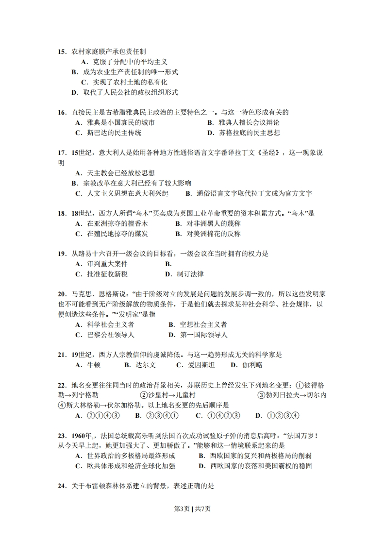2008年普通高等学校招生全国统一考试广东)历史本试卷共6页,满分150分。考试用时120分钟。一、选择题:满分75分。本大题共25小题,每小题3分。在每小题列出的四个选项中只有一一项符合题目要求。1.右图是明清古建筑中的一幅牌扁,与它有关联的中国古代政治制度是A.分封制B.宗法制C.三省六部制D.内阁制2.符合右图所示农业生产分布状况的朝代是A.西周B.西汉C.晋D.宋3.某思想家说:“我之出而仕也,为天下为万民,非为一姓也。”他所反对的是A.民主共和制度B.中央集权制度C.专制主义制度D.群主立宪制度4.齐国管帅说:“凡为国之急者,必先禁宋作文巧。未作文巧禁,则民无所游食,无民所游食则必事农,民事农则田垦,田垦则粟多,粟多则国富,国富者兵强,兵强者战胜,战胜者地广。”某研究者据此得出“中国精耕农业的产生与专制国家农业政策密切相关”的结论。该推断A.材料充分、理解准确一绪论合理B.材料充分、理解不准确,结论不合理C.材料不充分、理解准确,结论合理D.材料不充分、理解不准确、结论不合理5.情风吹动旗幡,一人说是风动,一人说是幡动。禅宗六祖慧能说,不是风动,不是幡动,而是两的位心动。在世界本原问题上,与慧能的观点有相似之处的思想家是A.孔子B.程颖C.朱熹D.王阳明6.某思想家在1925年提到世人对他的评价:“自戊戌以来,旧则攻吾大新:新则再吾太旧。”该思想家是A.康有为B.梁启超C.严复D.胡话7.《民报》刊号刊登黄帝像(见下图)的主要目的是A.提倡民主自由B.宣传排满革命C.倡导个人崇拜D.反对帝国主义第1页1共7页